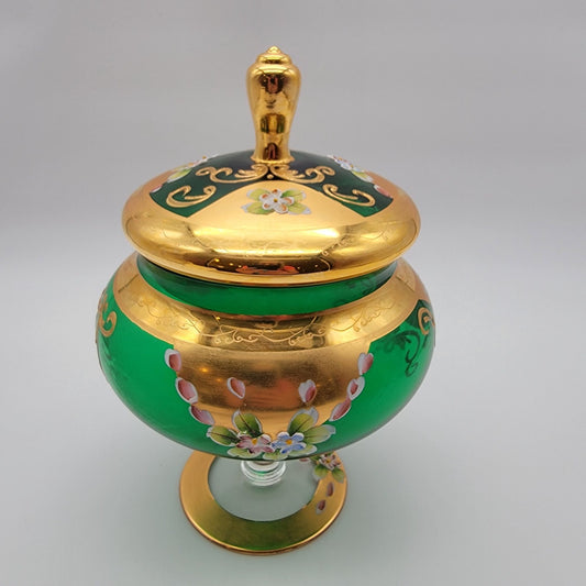 Vintage Seyei Victorian Enameled Glass Emerald Green & 22kt Gold Lidded Candy Dish