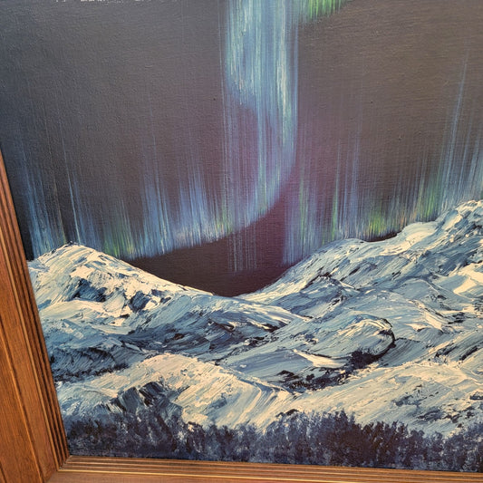 Northern Lights Snowy Mountains Original Painting On Board Framed Signed Mona