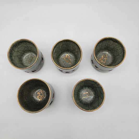 Vintage Somayaki Soma Ware Double Wall Tea Cups Set Of 5 Japanese Green Crackle