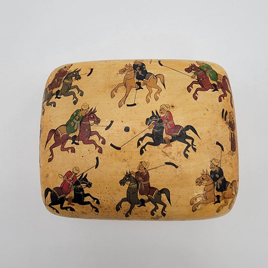 Vintage Kashmir India Paper Mache Trinket Box With Polo Scene