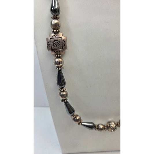 Vintage Hematite & Hand-Carved 925 Silver Beaded Necklace 23"