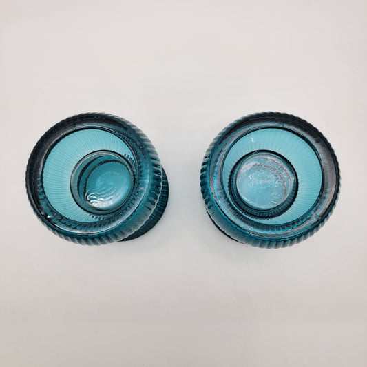 Vintage Teal Ribbed Glass Candle Holders - Reversible Votive Candlestick Set