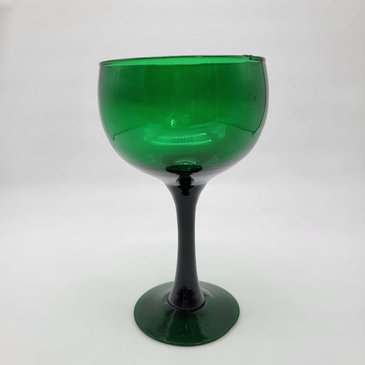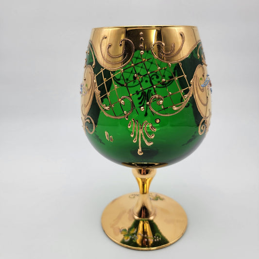 Vintage Bohemian Czech Emerald Glass Goblet With 24K Gold Gilt & Floral Enamel
