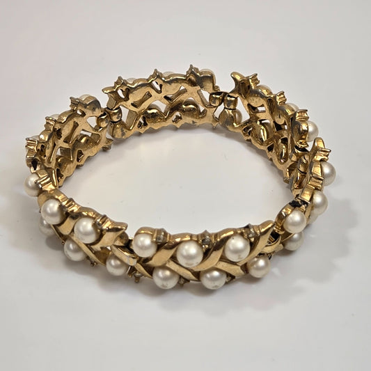 Vintage Crown Trifari Faux Pearl Rhinestone Bracelet 6.75" AS FOUND