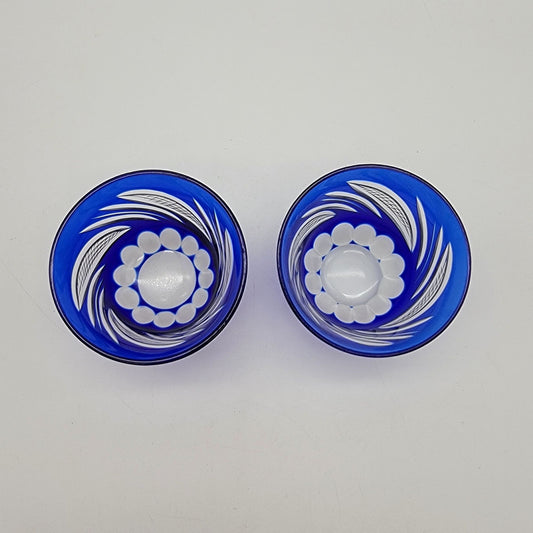 Pair Of Vintage Edo Kiriko Cobalt Blue Cut To Clear Crystal Cup Saki Glasses