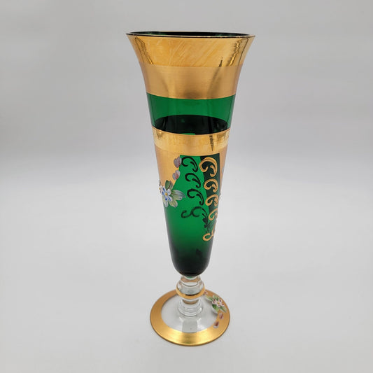 Vintage Seyei Victorian Glass Enameled Emerald Green Vase Gold Trim & Floral