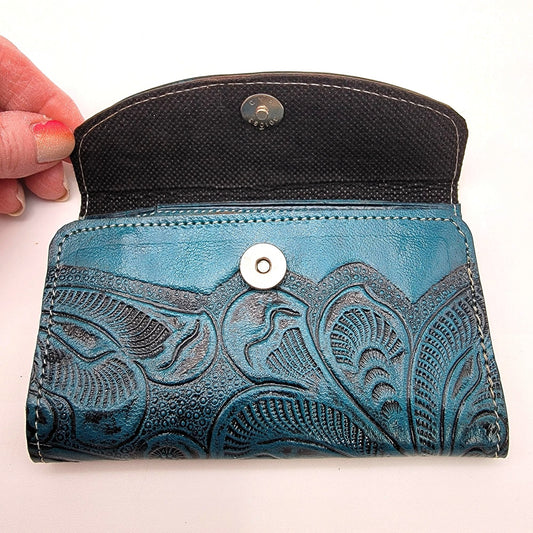 Mexican Tooled Blue Leather Tri-Fold Wallet
