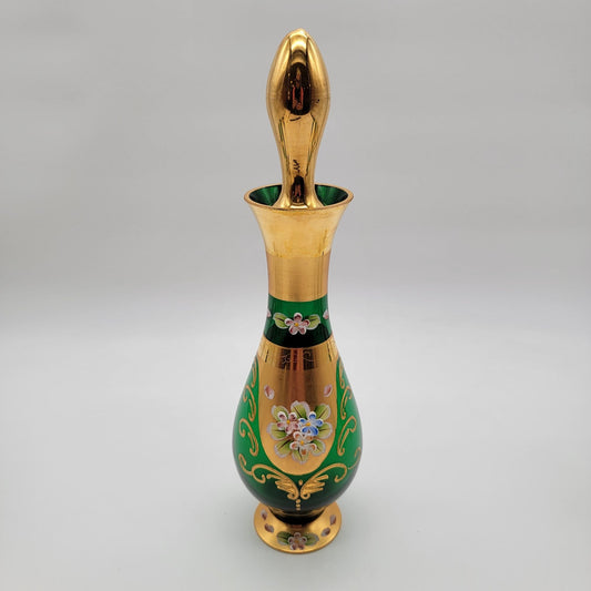 Vintage Seyei Victorian Glass Enameled Emerald Green Decanter With 6 Cordial Glasses