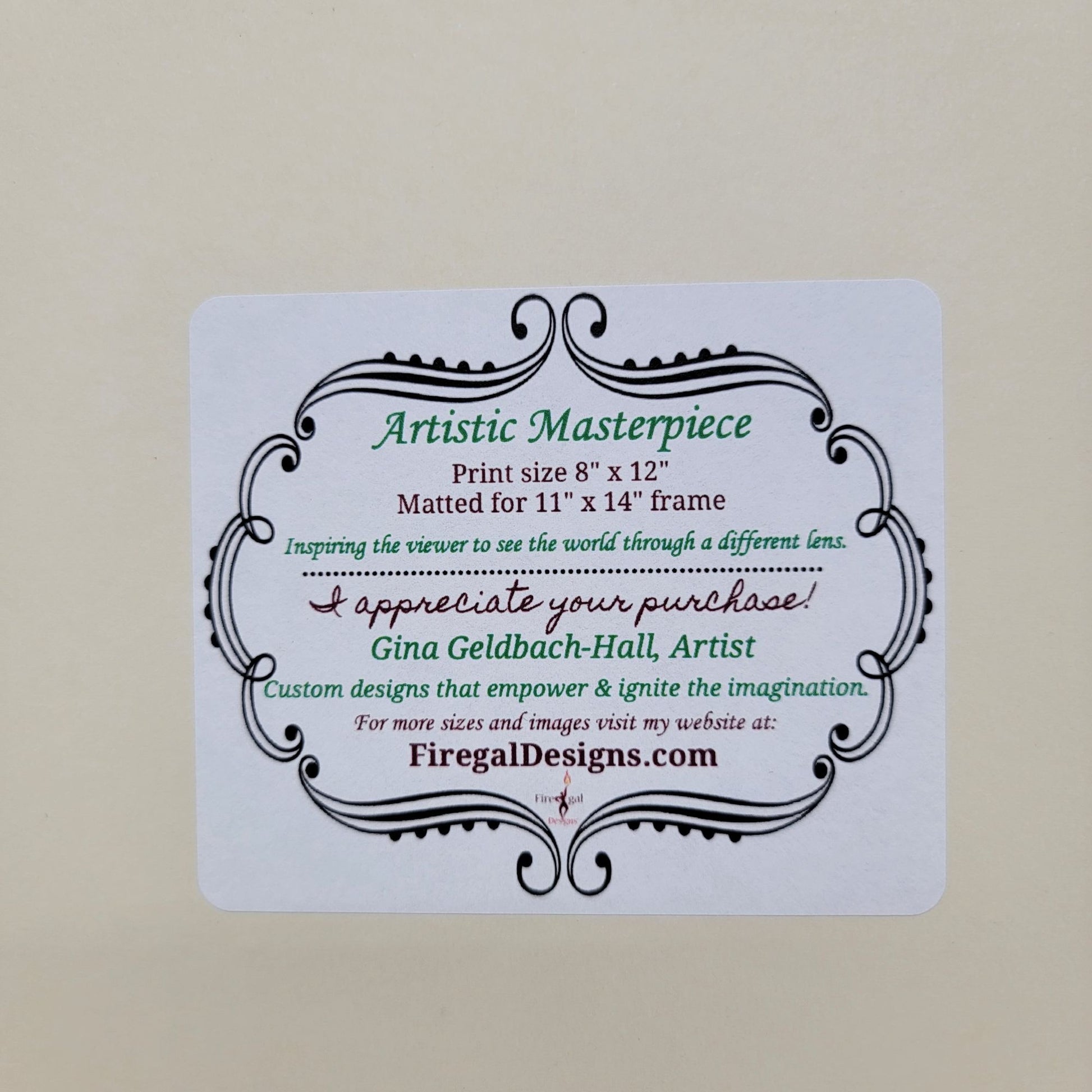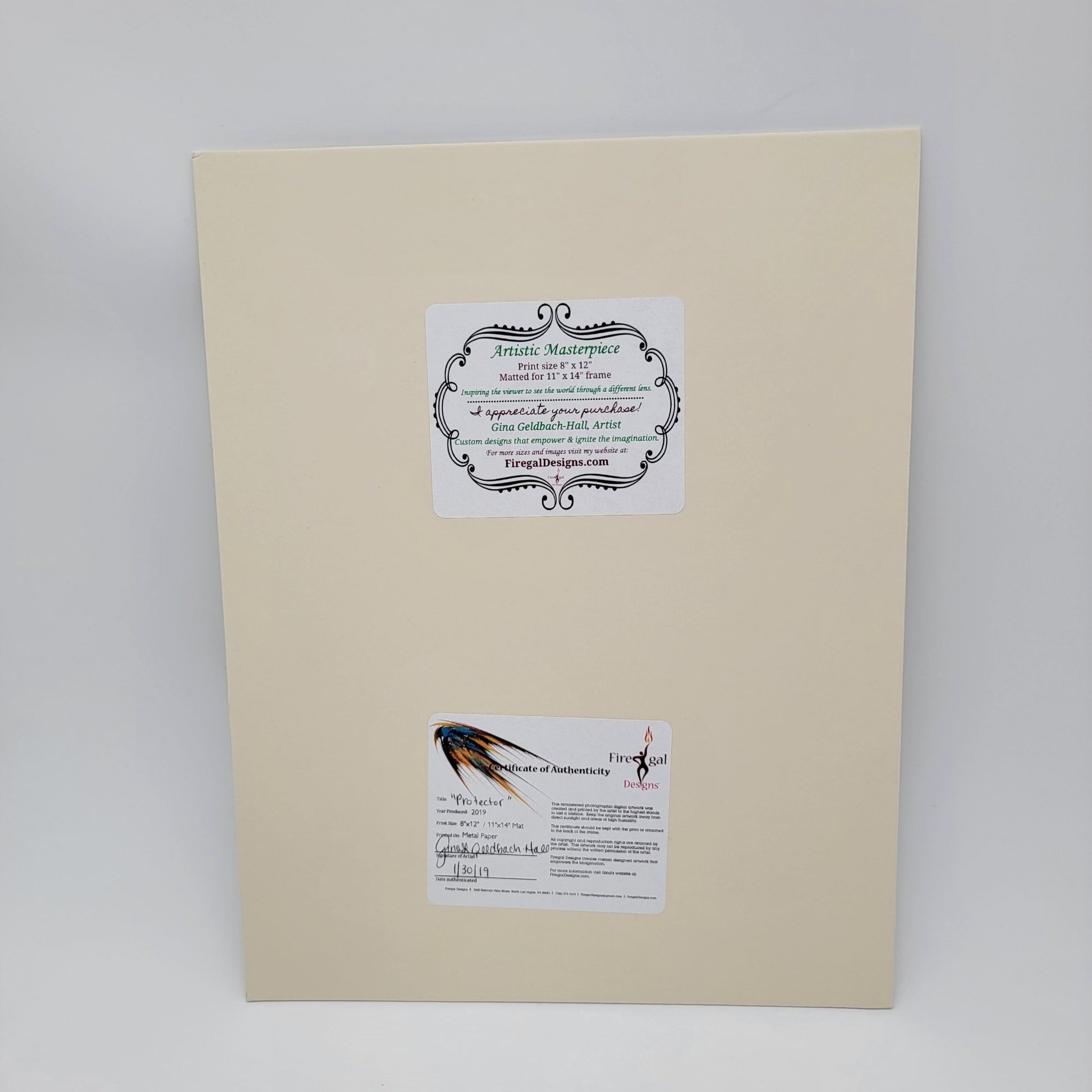 This professionally matted 8"x12" print, titled "Protector" by Gina Geldbach-Hall, is a striking art piece from Firegal Designs, accompanied by a Certificate of Authenticity.