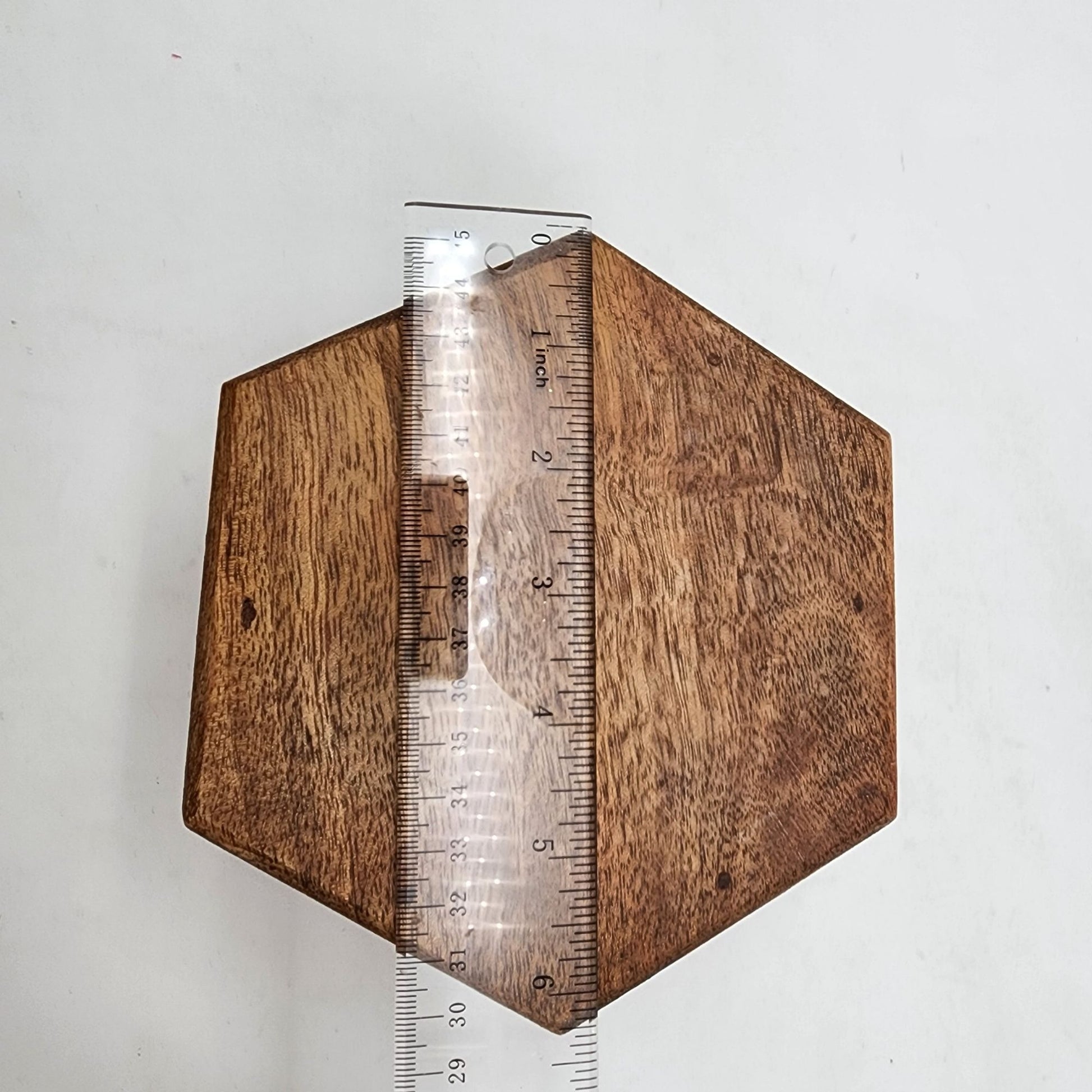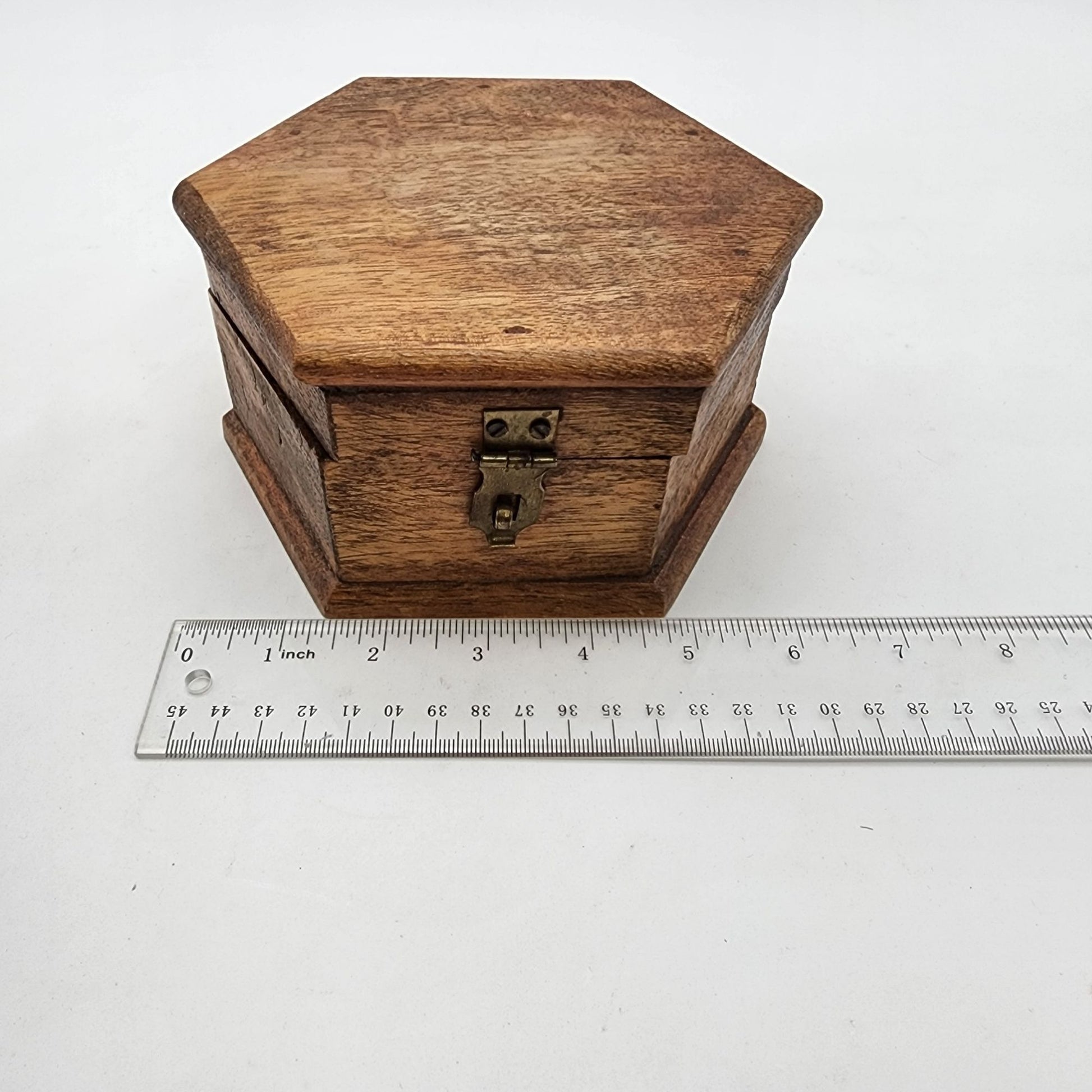 This charming vintage wooden box, originating from India, features a brass latch and a unique hexagonal shape. Inside, you'll find four exquisitely hand-painted eggs with intricate designs, adding a touch of artistry to your collection. The rustic appeal and craftsmanship make this set a delightful decorative piece.
