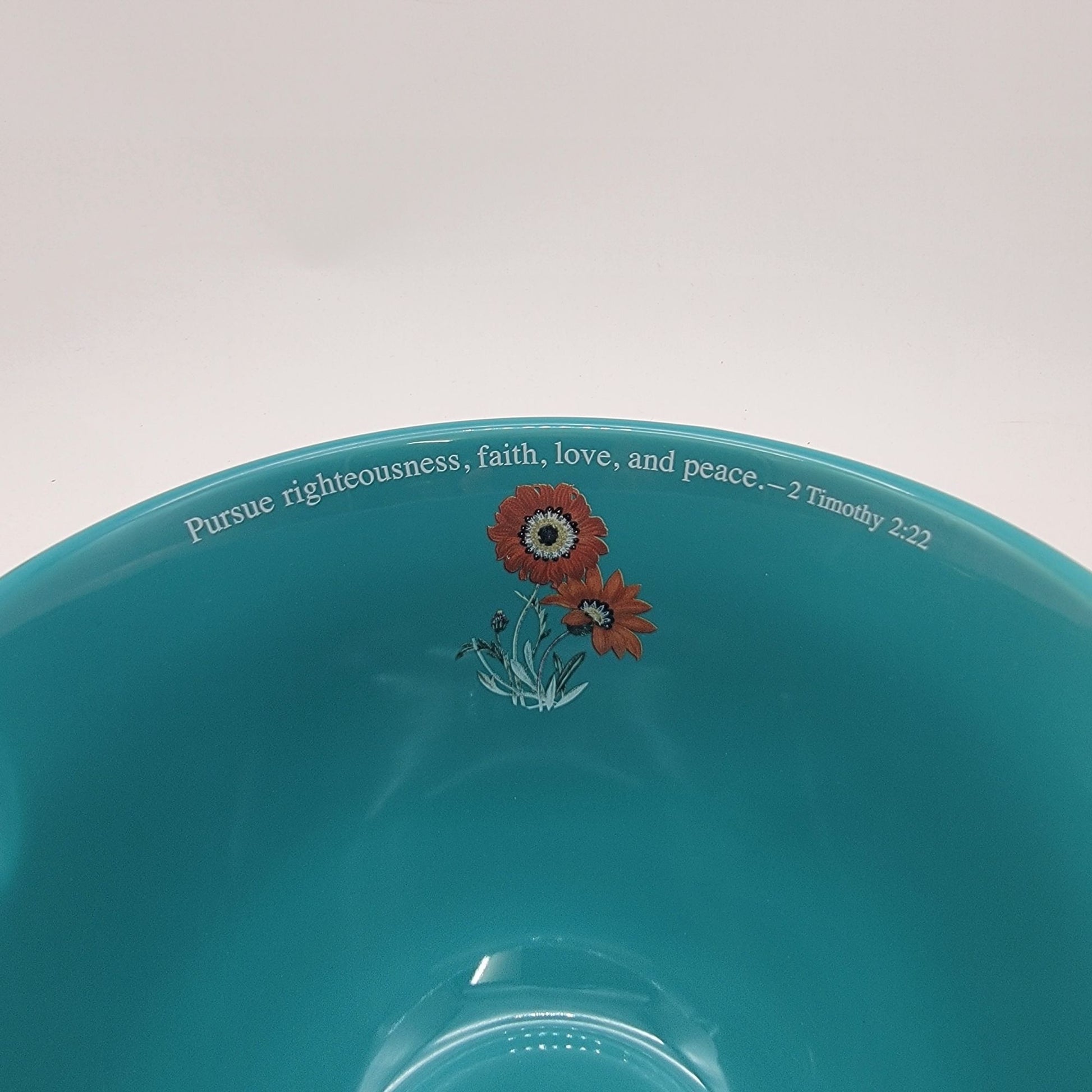 This beautifully designed mixing bowl features an inspirational scripture and elegant floral accents. Ideal for functional use or as a decorative piece.