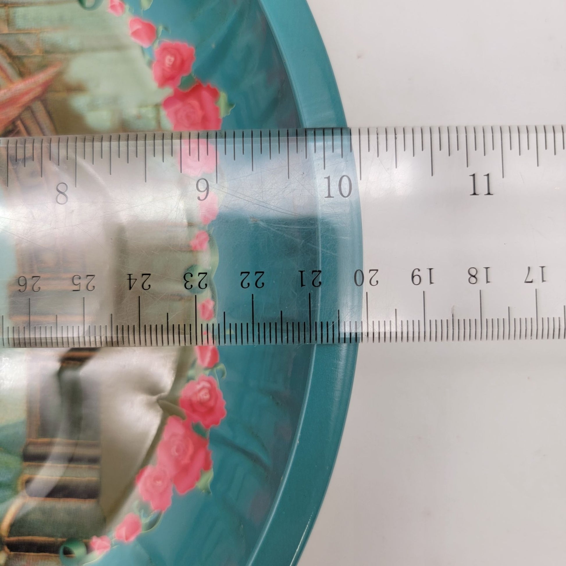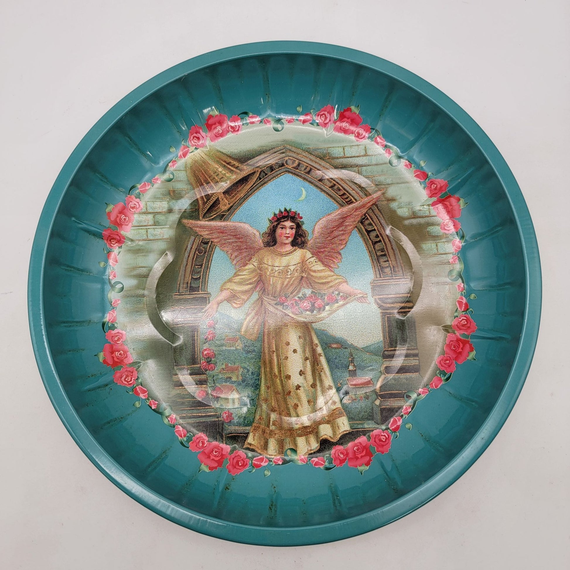 This vintage tin bowl tray features an enchanting angel adorned with roses, set against a celestial backdrop. Its vibrant colors and intricate design evoke nostalgic charm, making it a delightful addition to antique collections or as a standalone decorative piece. The tray's durable tin construction ensures long-lasting use.