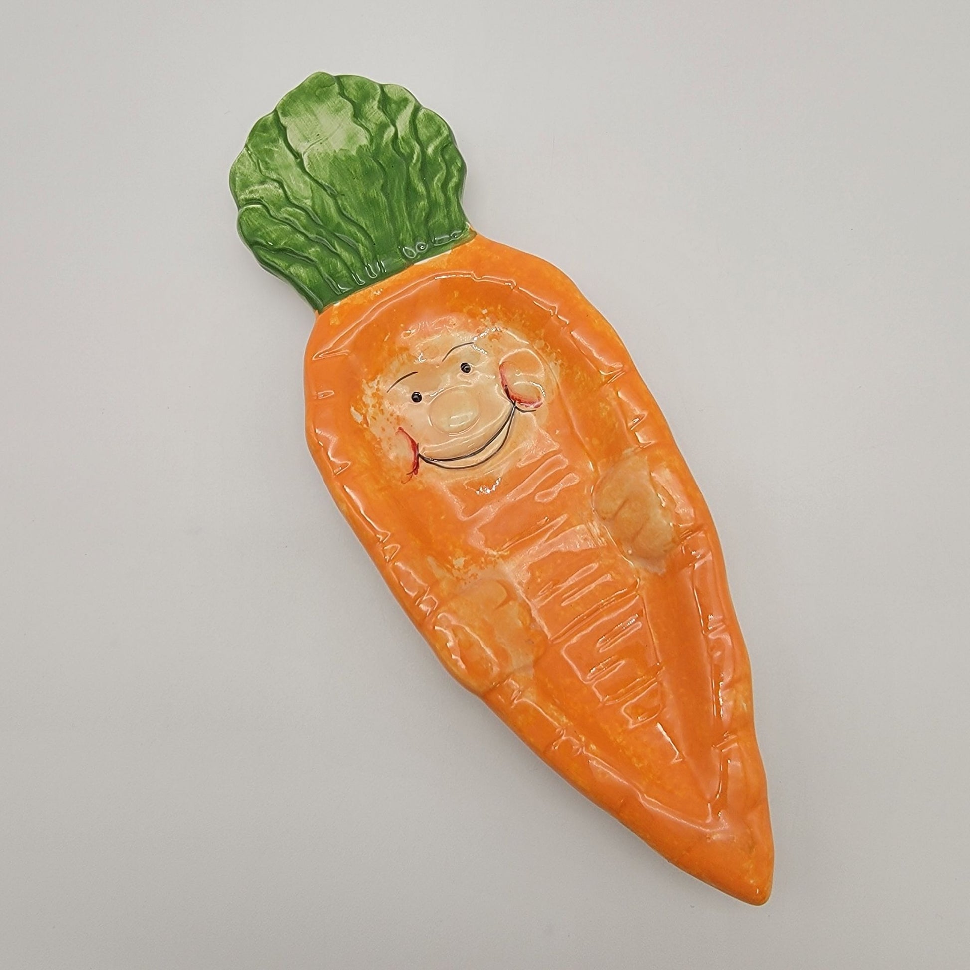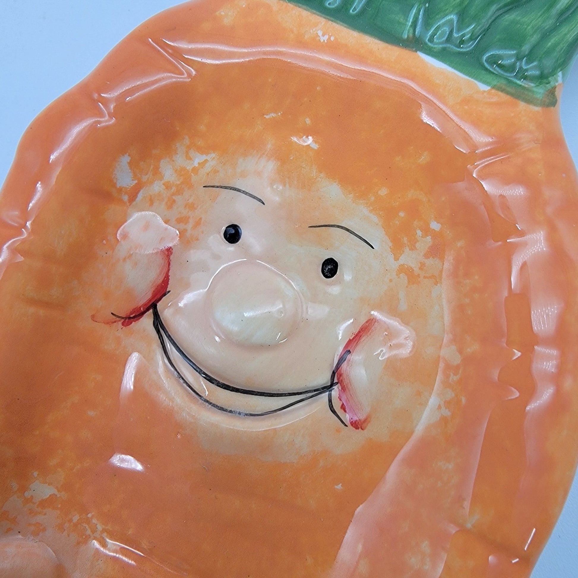 This whimsical carrot dish brings a touch of playful charm to any kitchen. With its smiling face and vibrant orange and green hues, it serves as an ideal decorative piece or functional tray for small items, adding a dash of cheerfulness to your space.