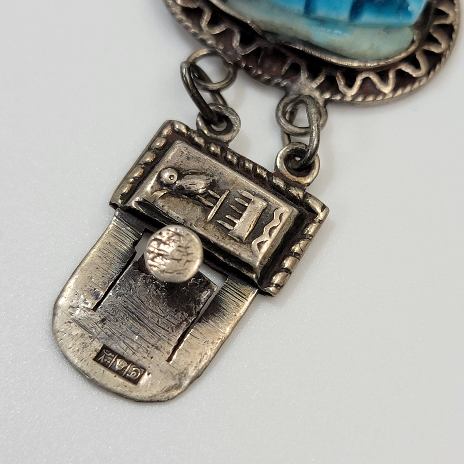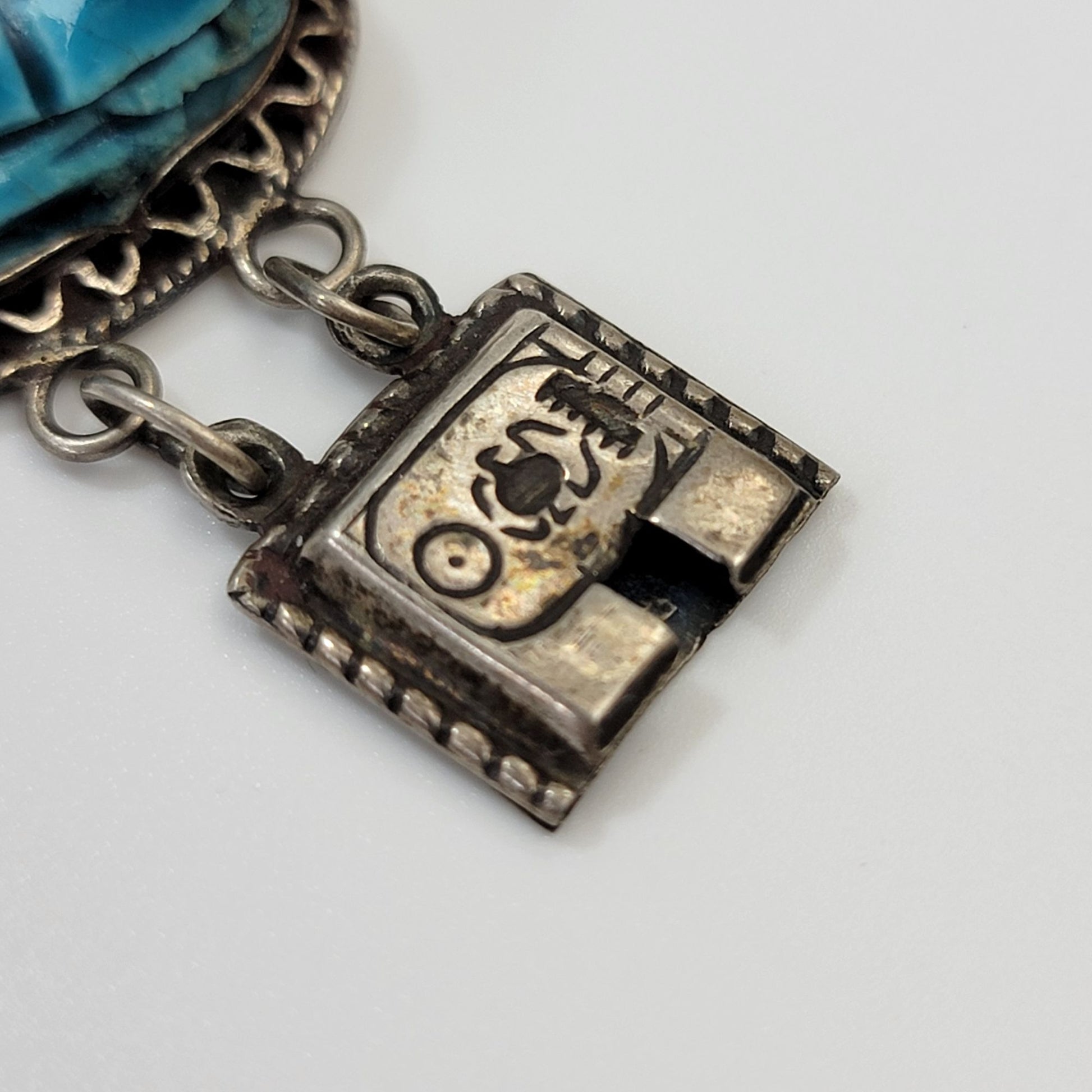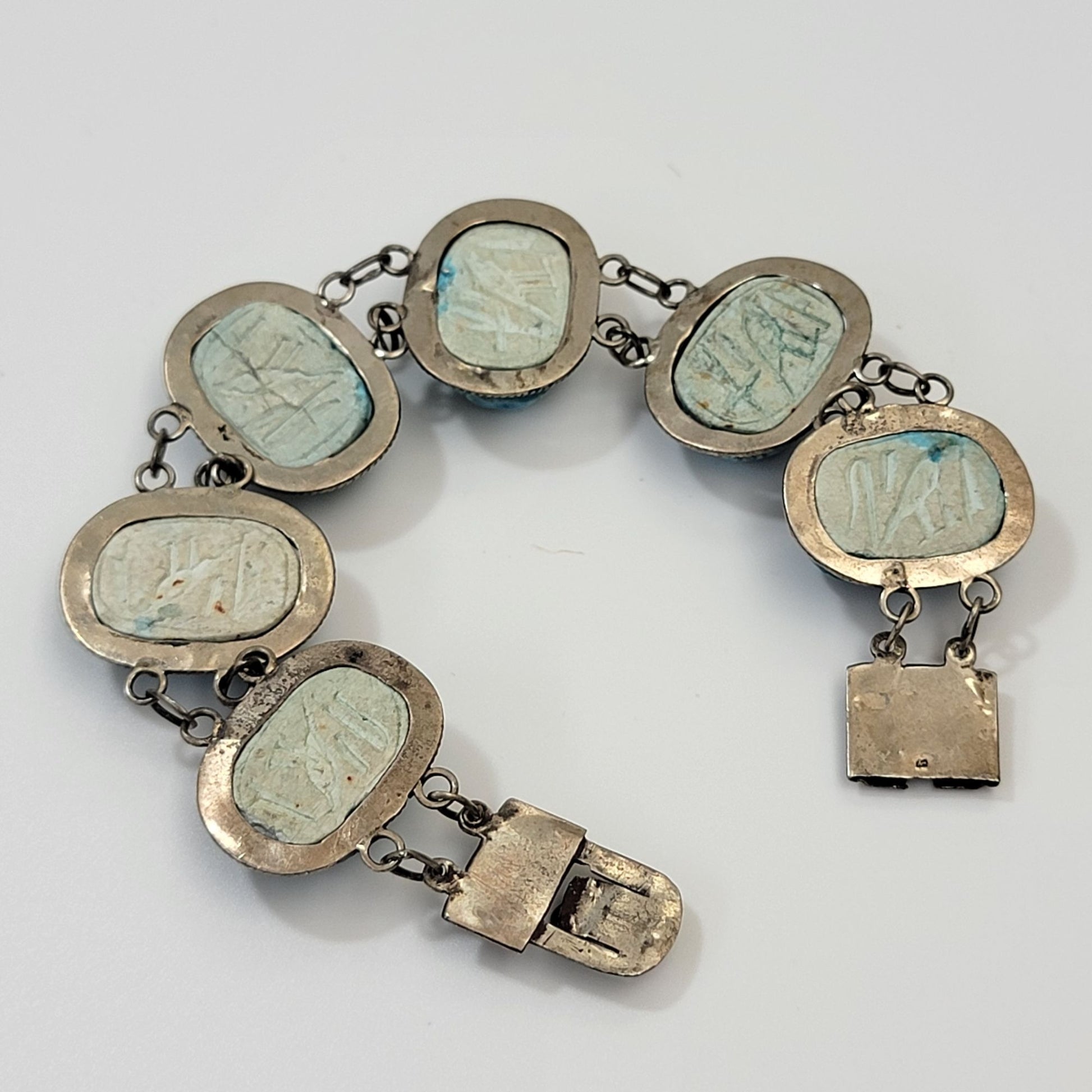 This exquisite 1920s Egyptian Revival bracelet tells tales of ancient mystique. Adorned with vibrant turquoise faience scarab stones, its intricate hieroglyphic clasp whispers of forgotten eras.