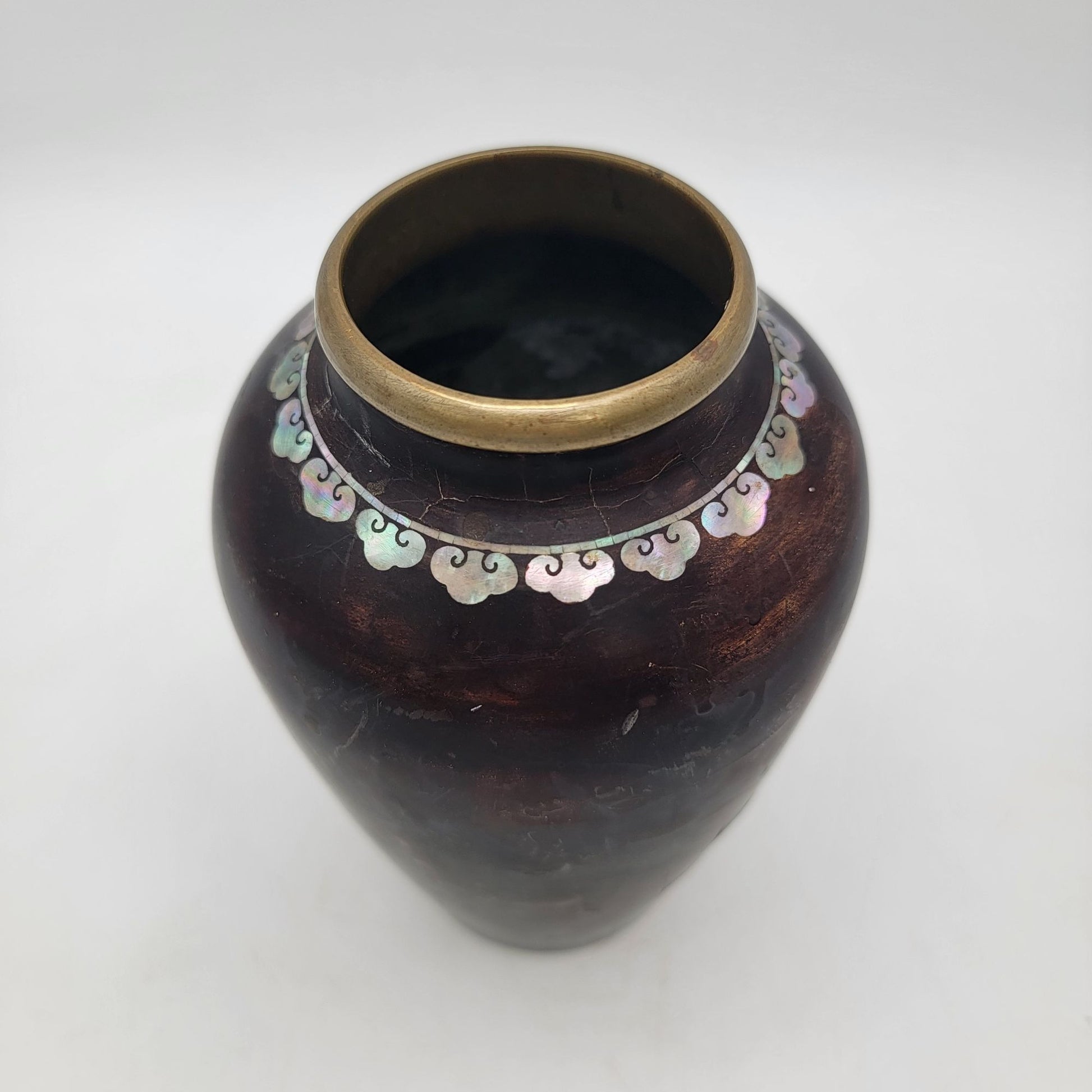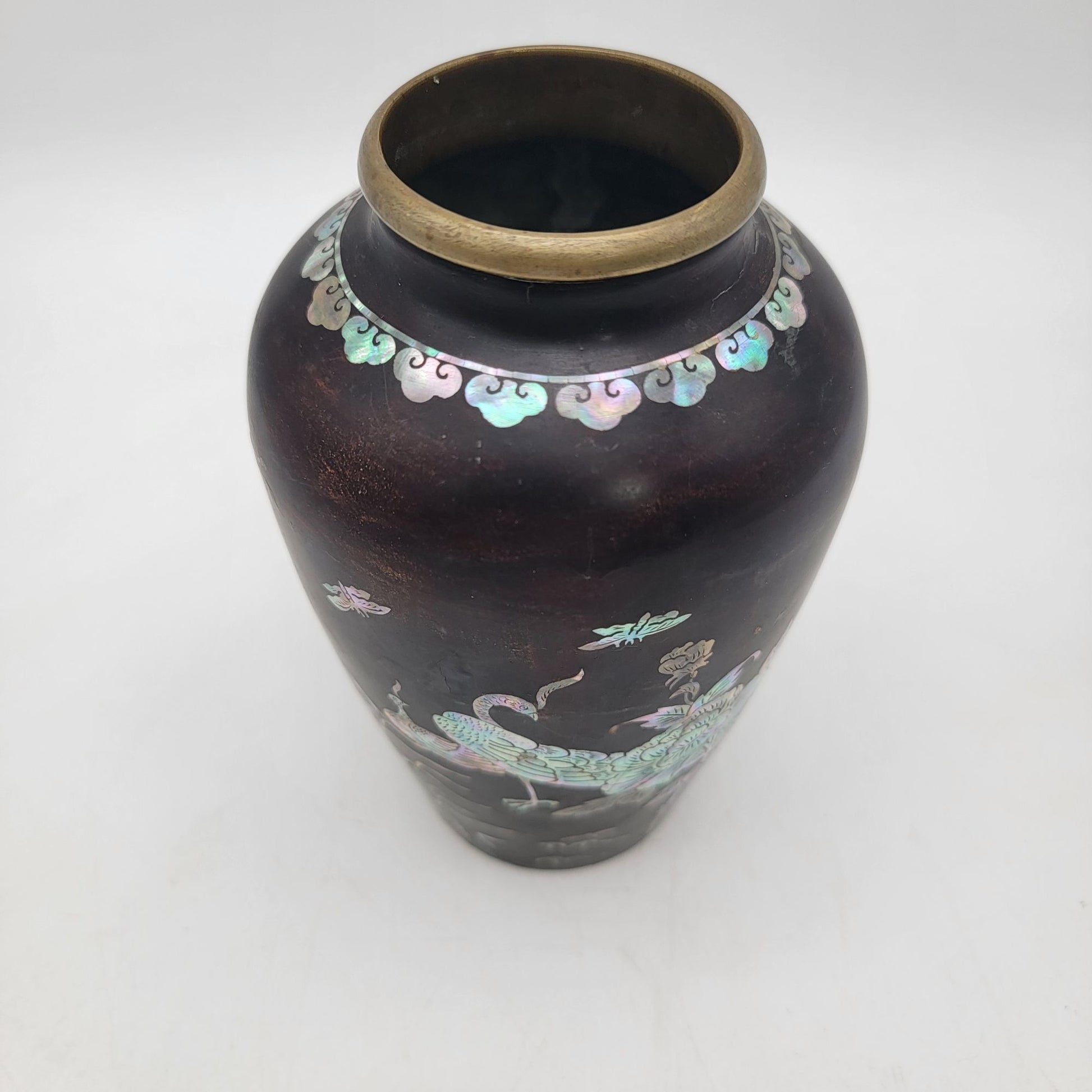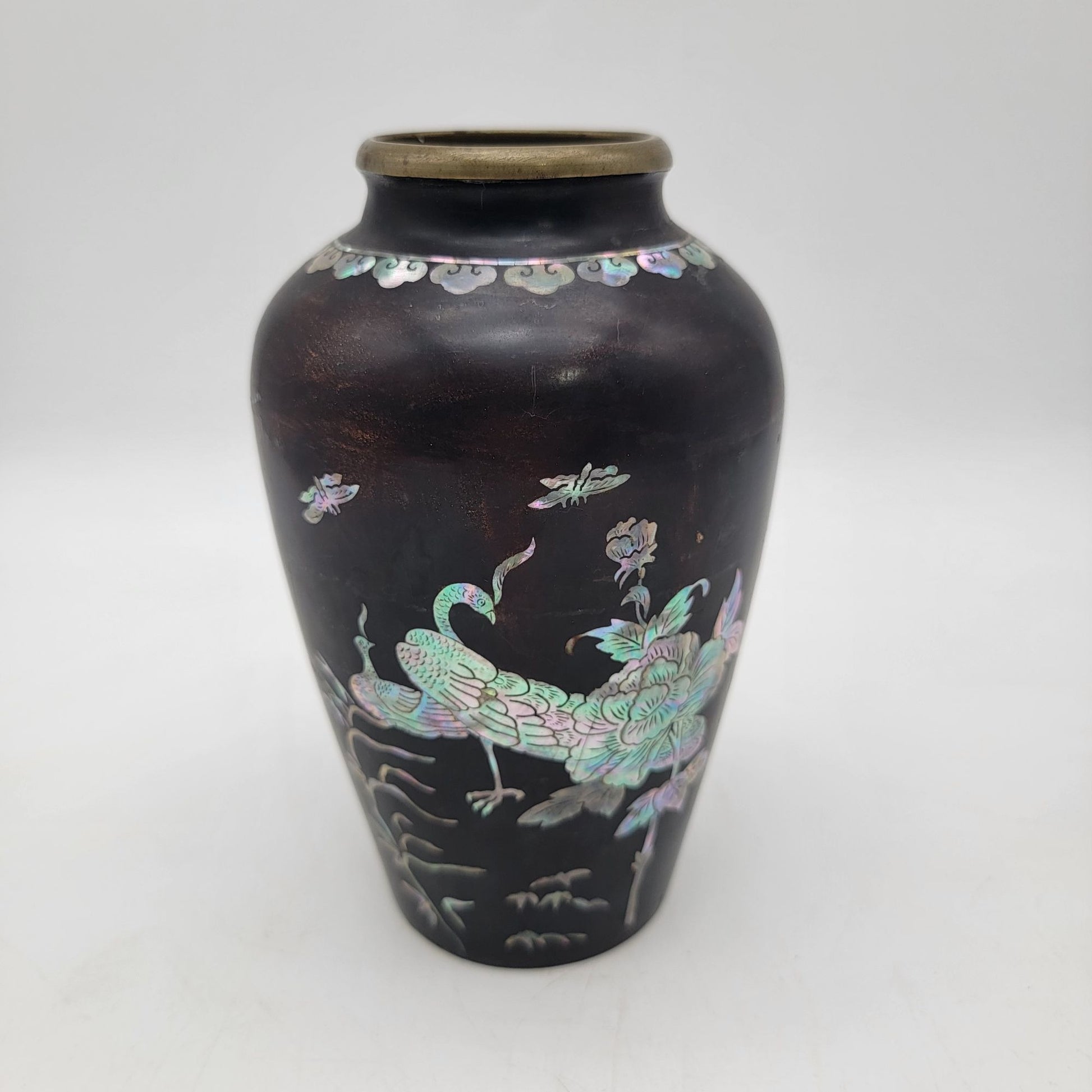 Antique Black Lacquer Vase With Mother Of Pearl Inlay & Brass Rim Featuring Peacock Design