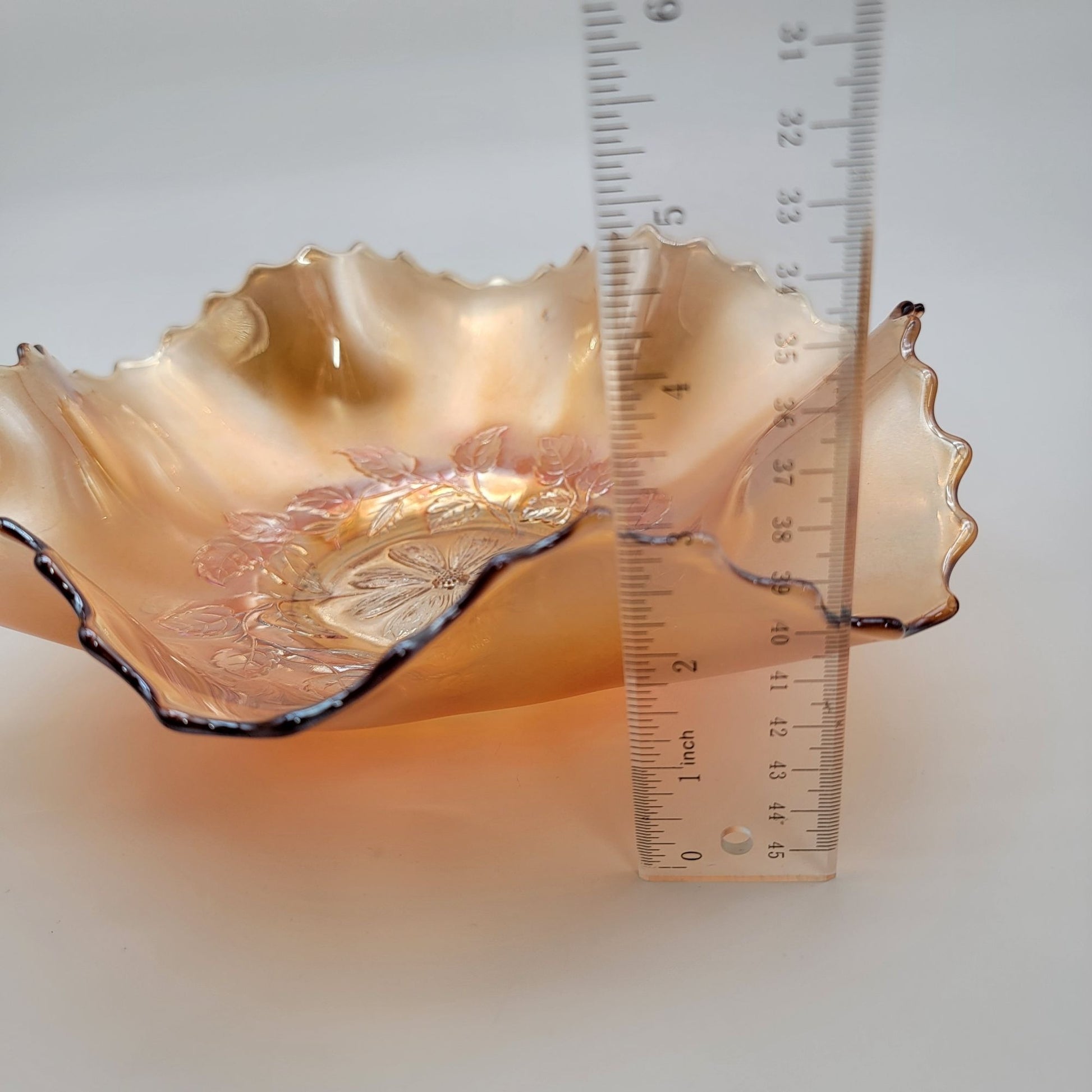 Antique Dugan Carnival Glass Cosmos Variant Ruffled Bowl Marigold