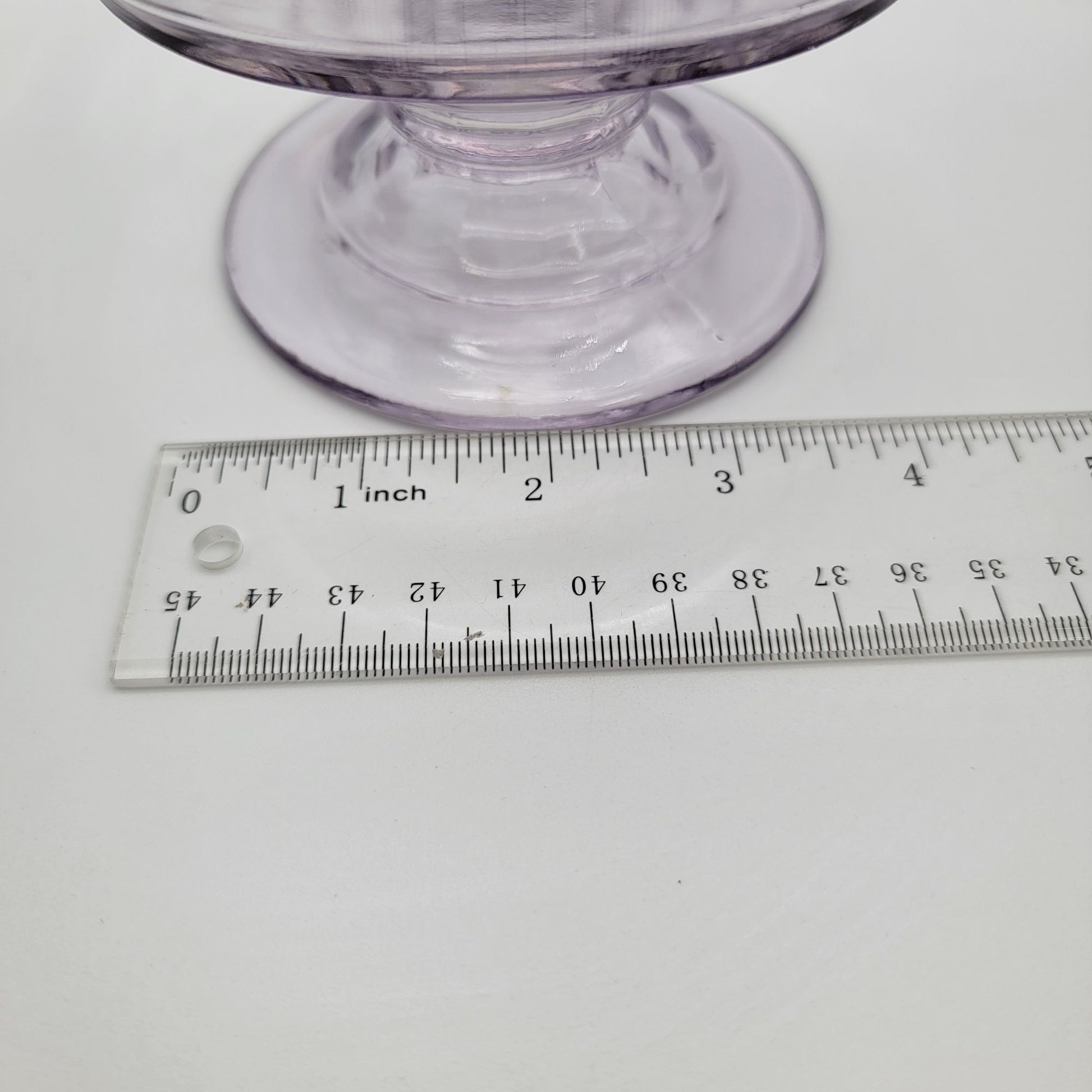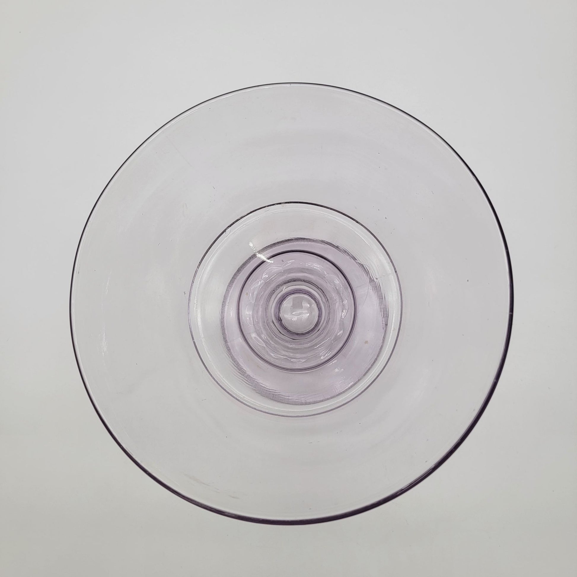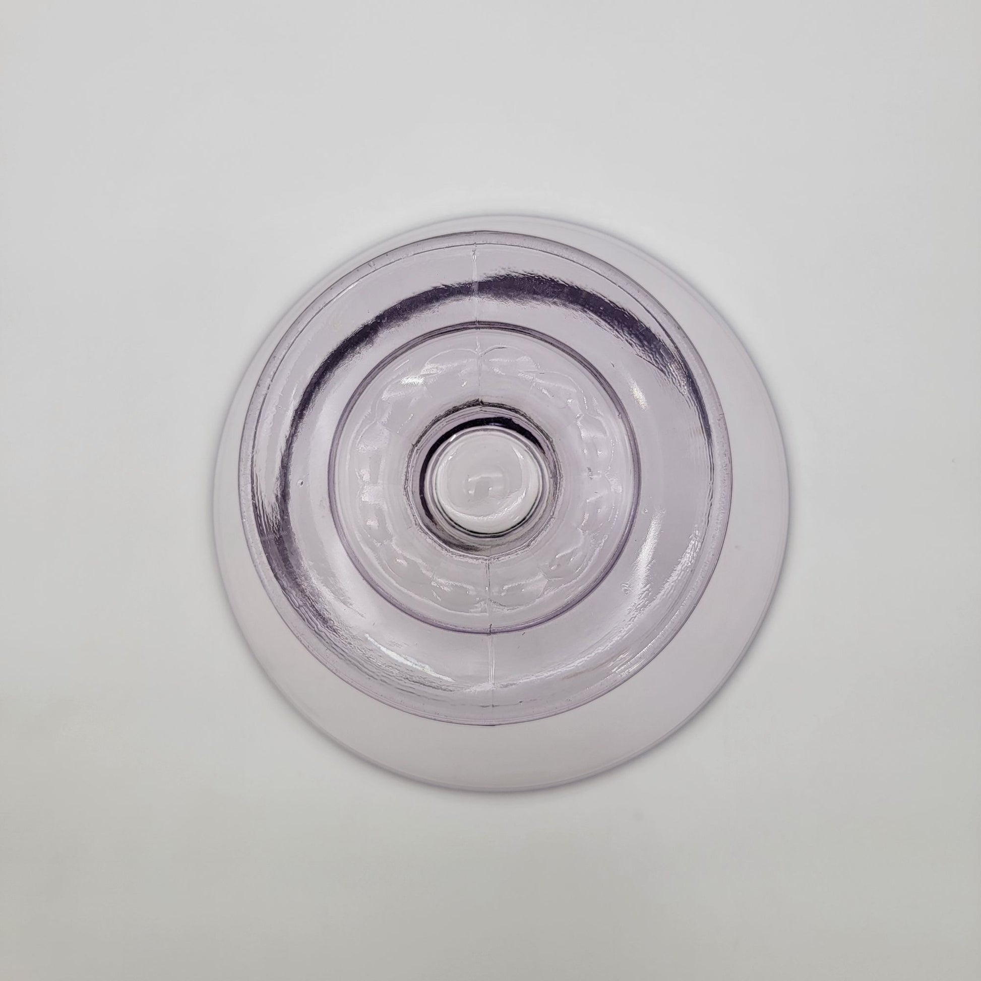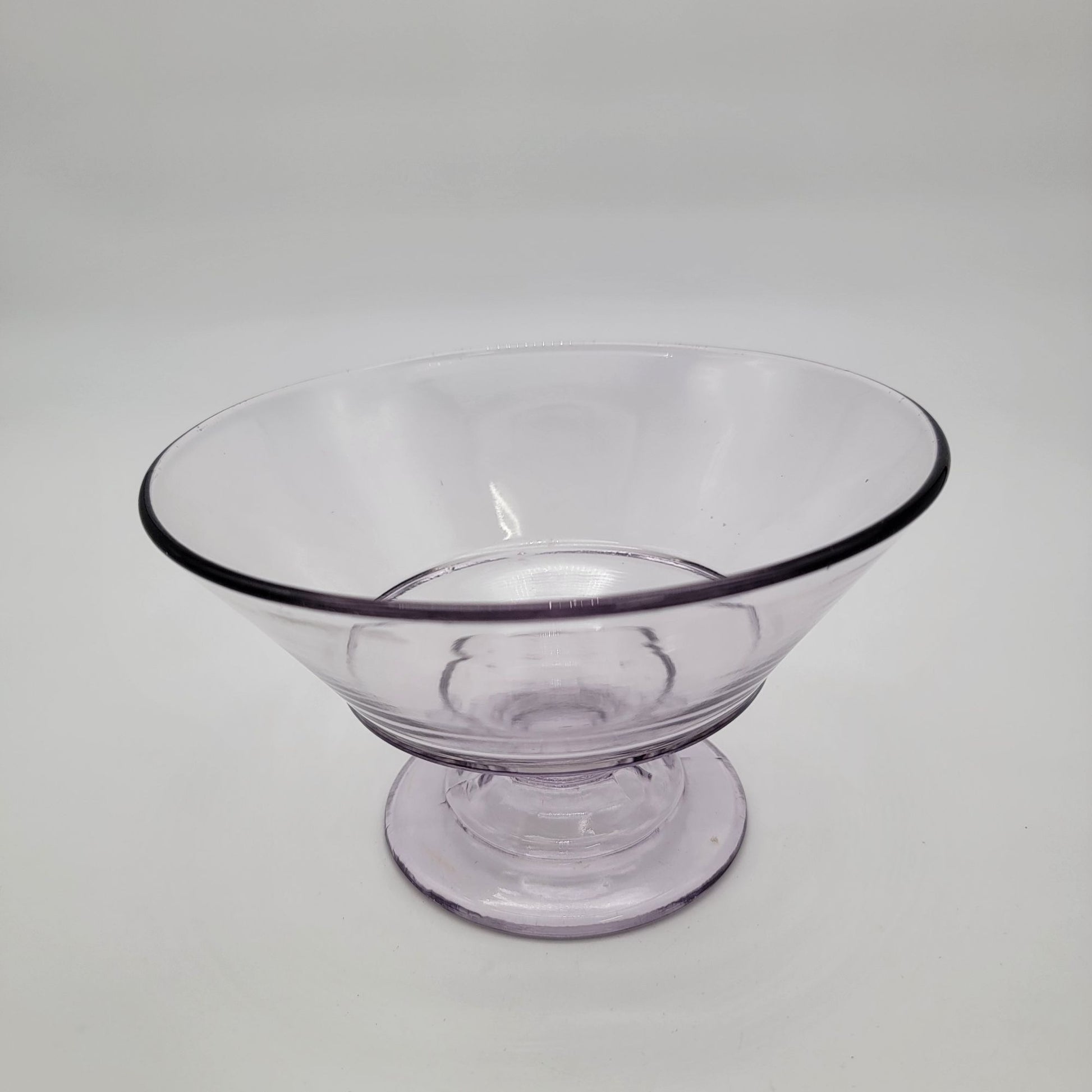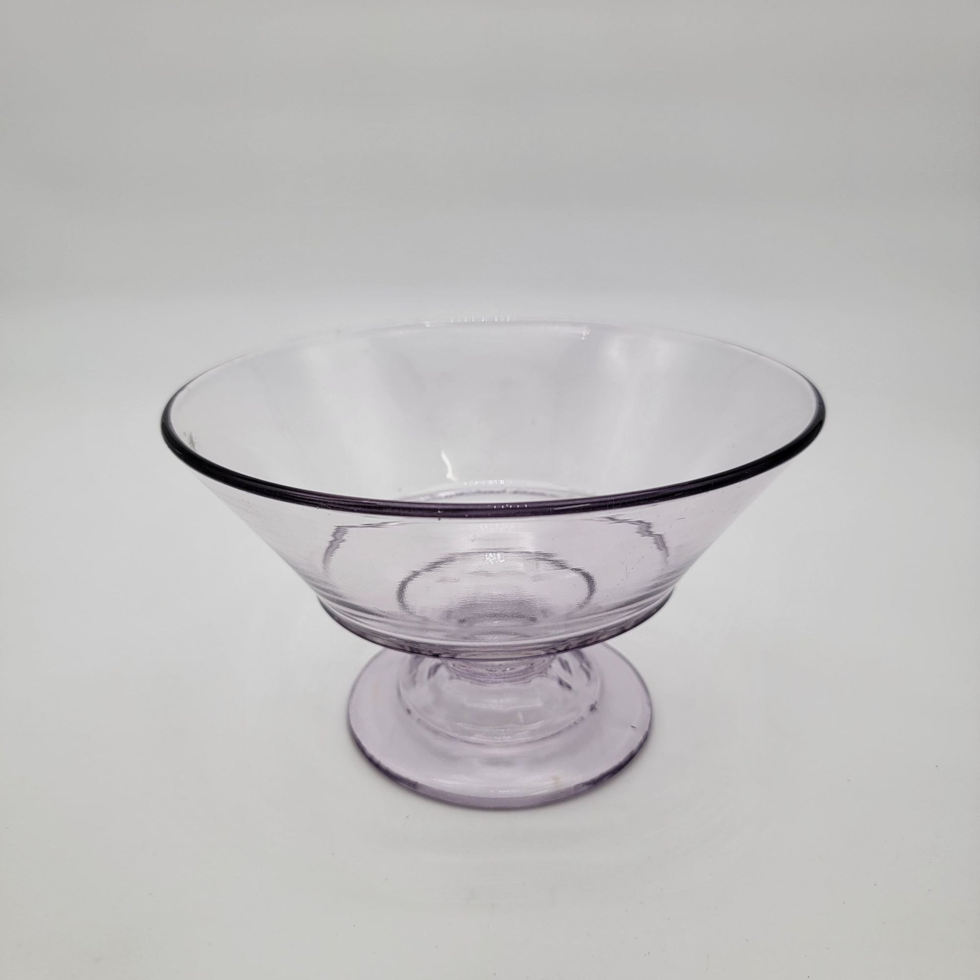 This vintage Early American Pattern Glass compote exudes timeless charm, showcasing a delicate sun-purple hue. Its footed design adds grace, perfect for serving or display. A collector’s delight and a centerpiece gem.