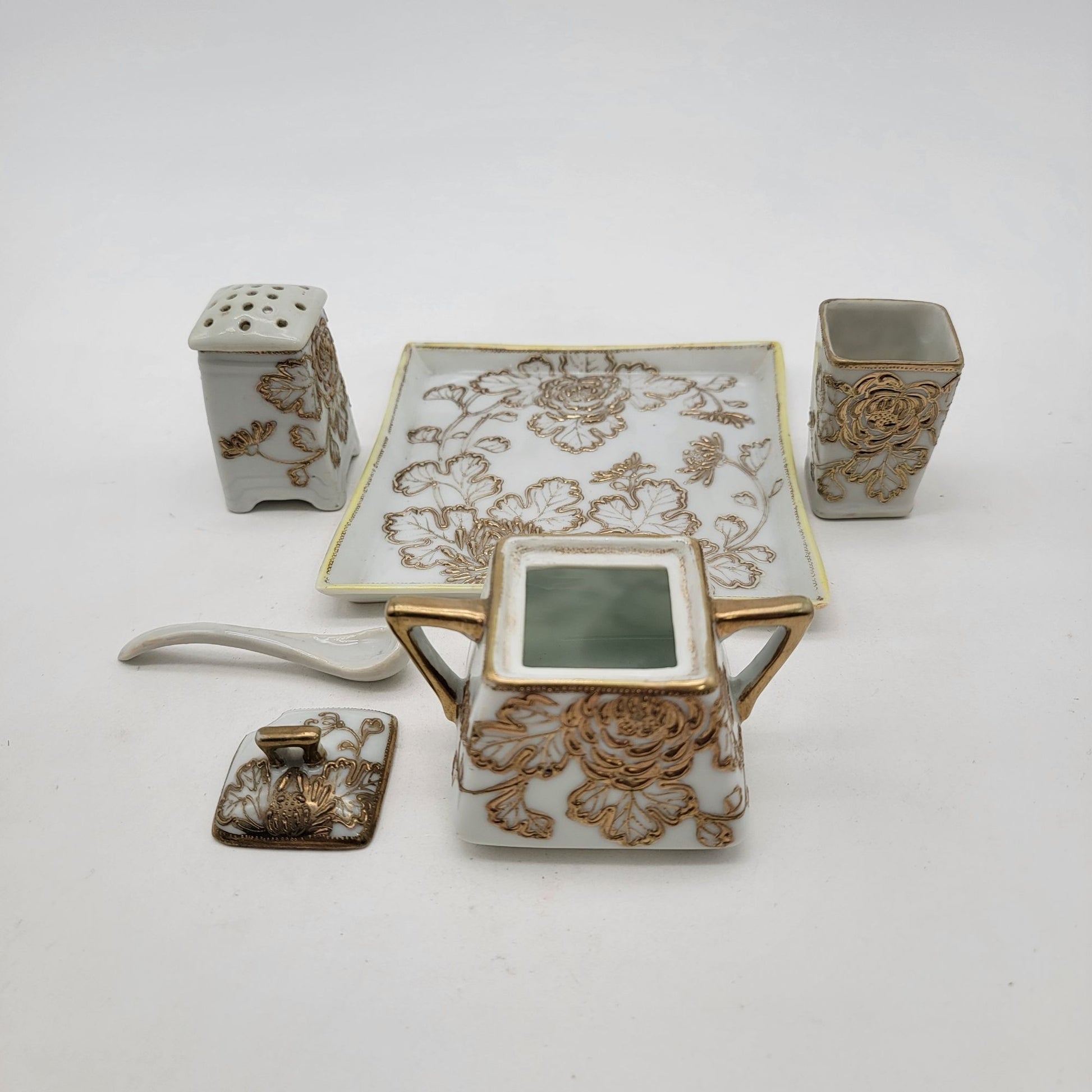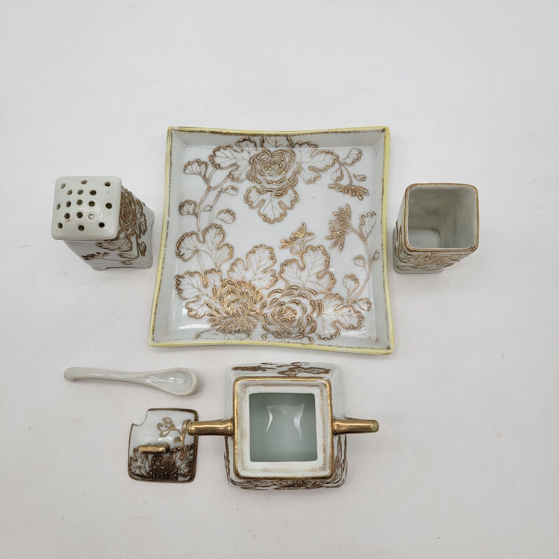 Antique Nagoya Shofu Nippon Porcelain Condiment Set Gold Gilded Floral Design 1890-1921