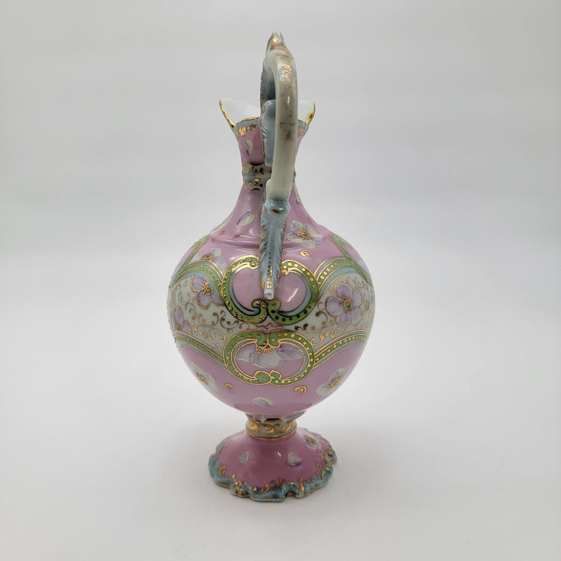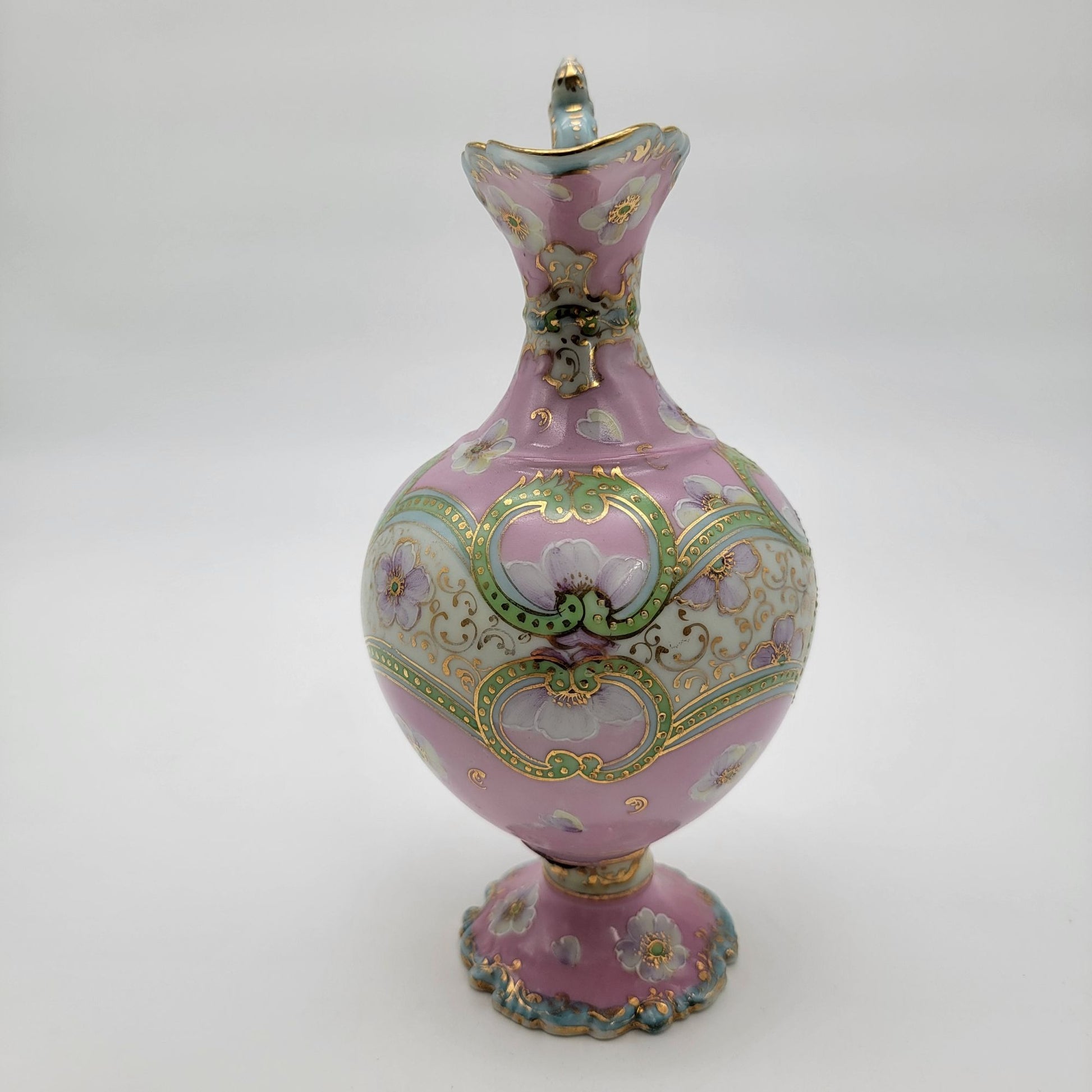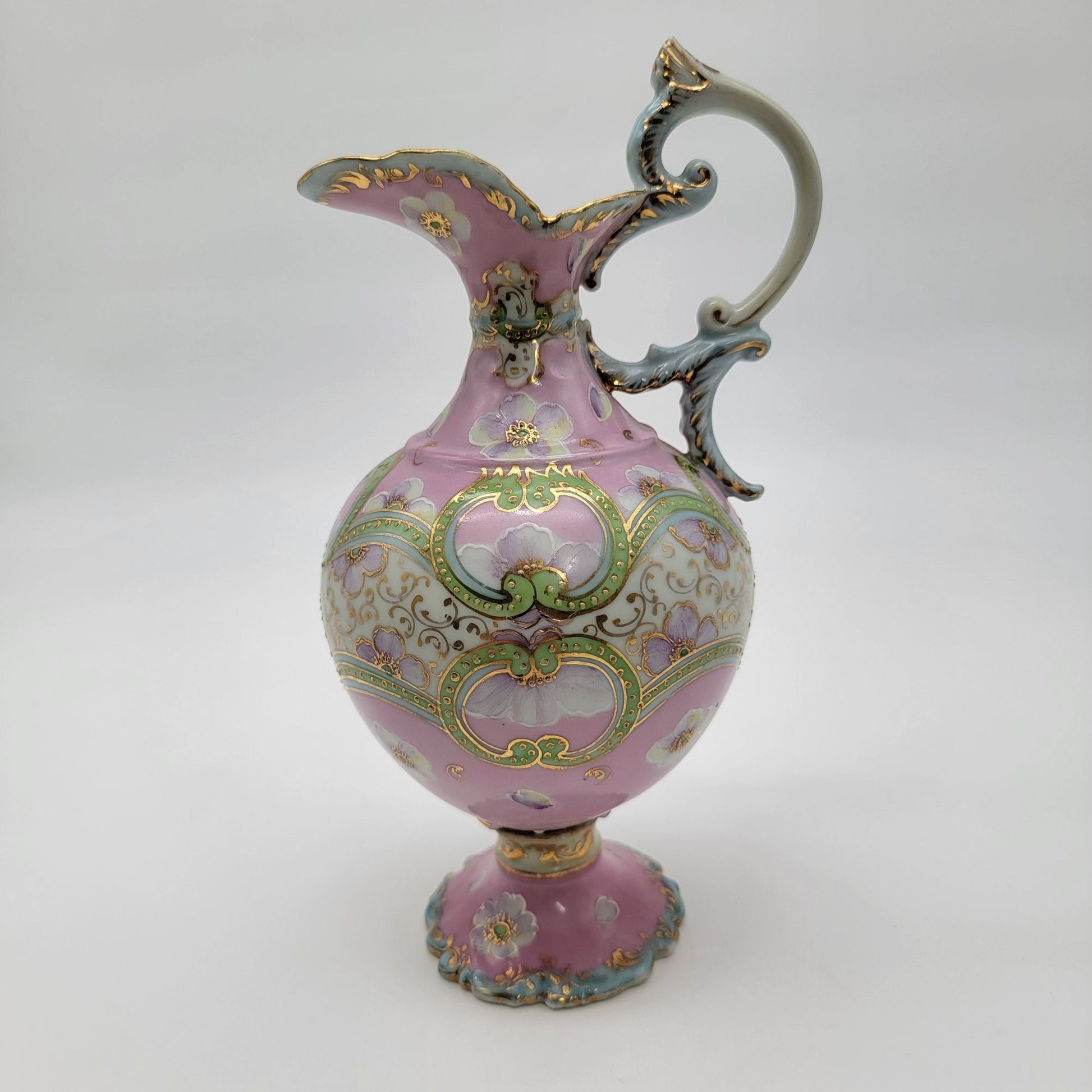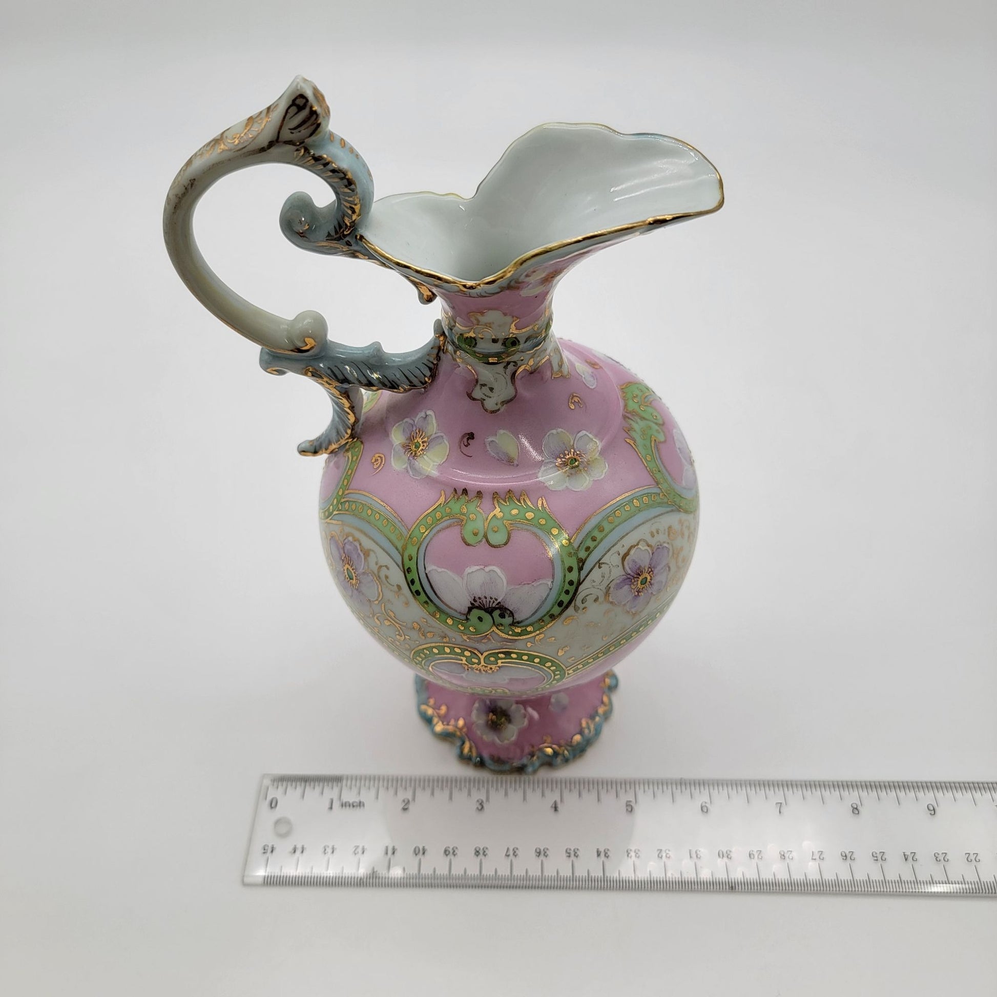 This exquisite antique porcelain pitcher showcases a hand-painted floral design accented with gold detailing. The pastel pink and green hues and intricate patterns evoke a sense of timeless elegance. Delicately crafted, its ornate handle and scalloped edges add a refined charm, making it a remarkable decorative piece for collectors.