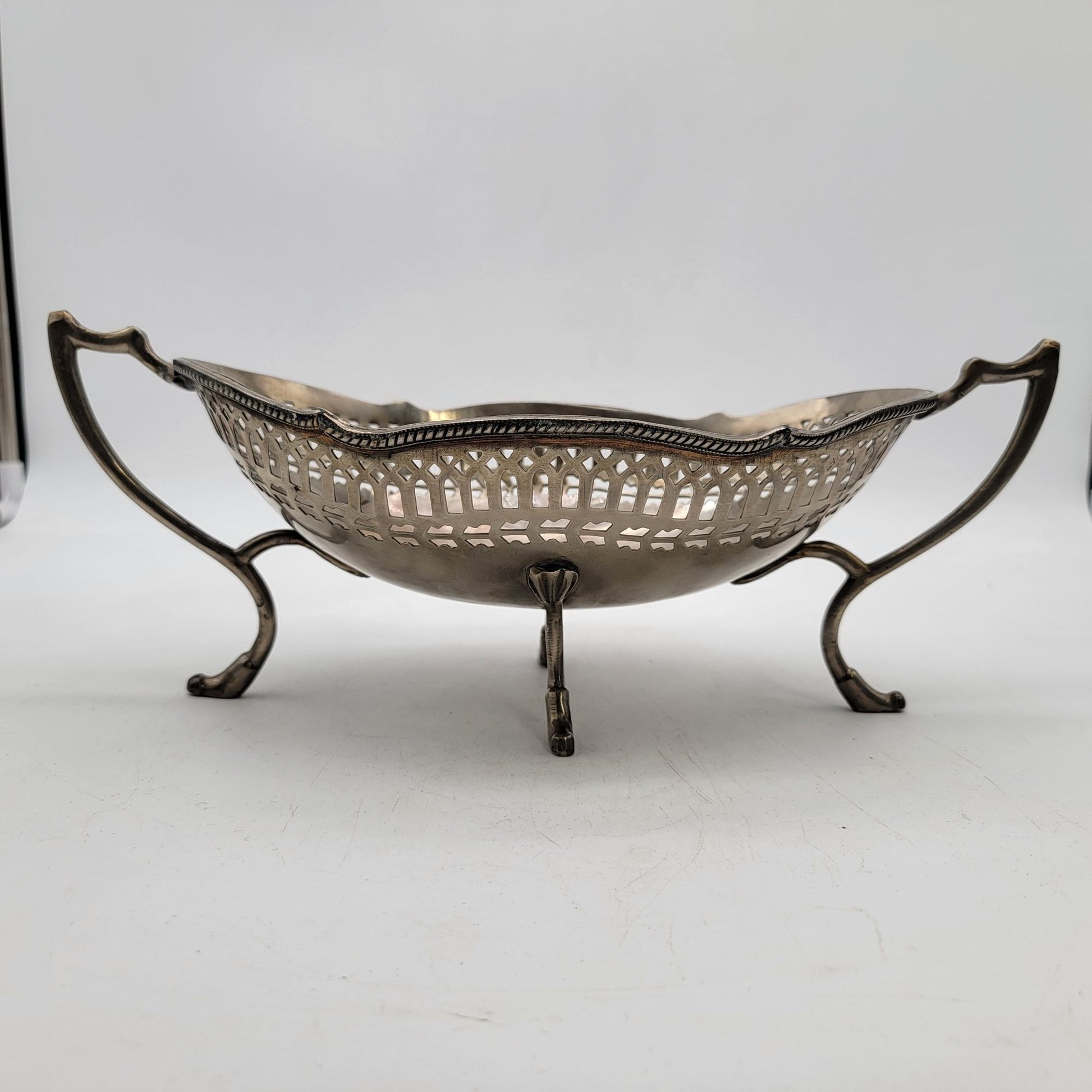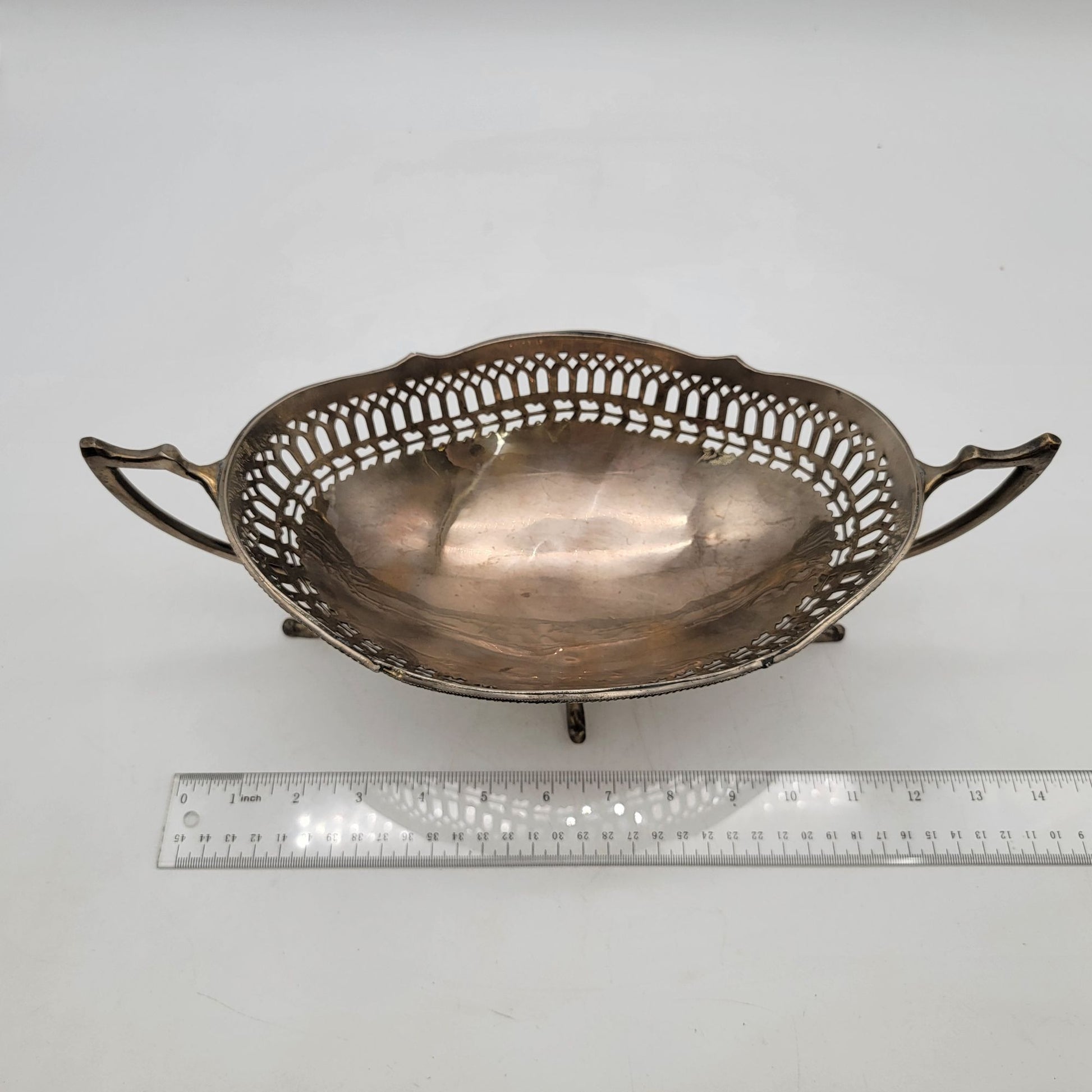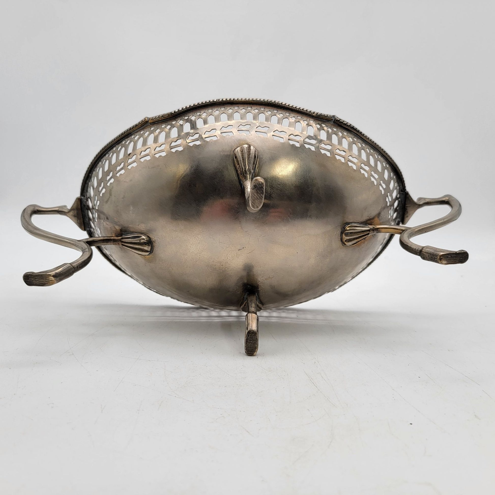This vintage silver-plated cake basket features scalloped edges and intricate handle detailing, offering a timeless design for elegant table settings.