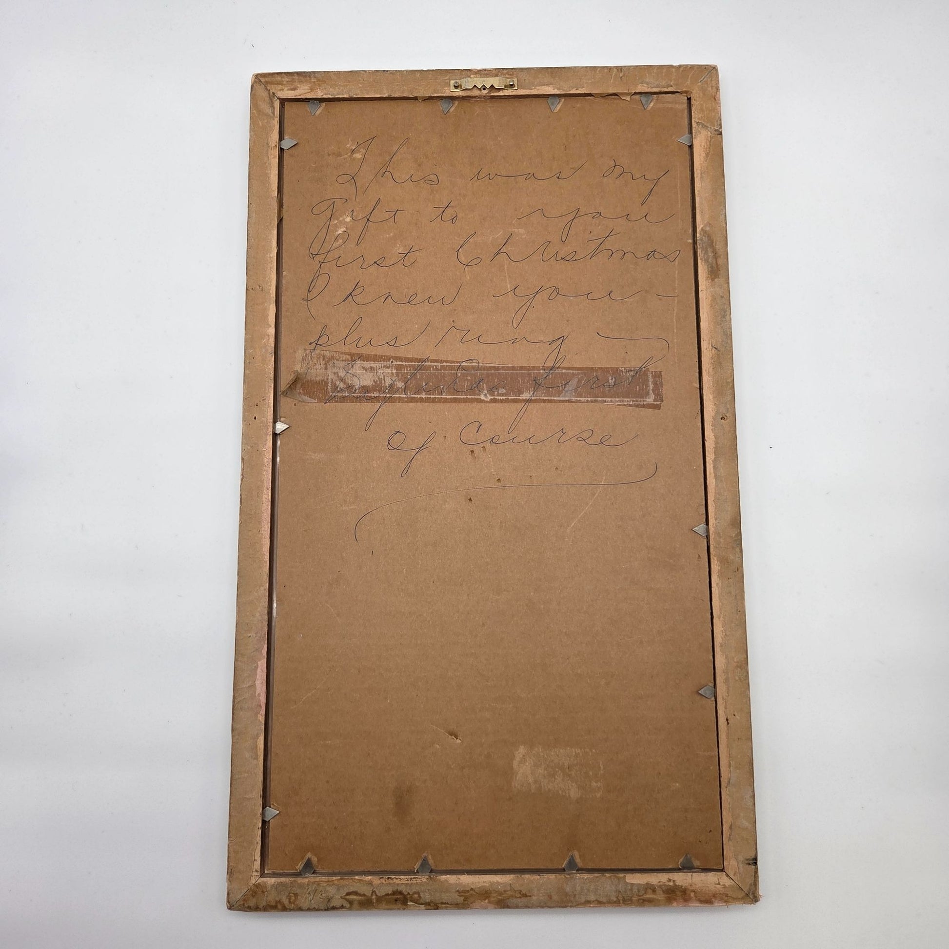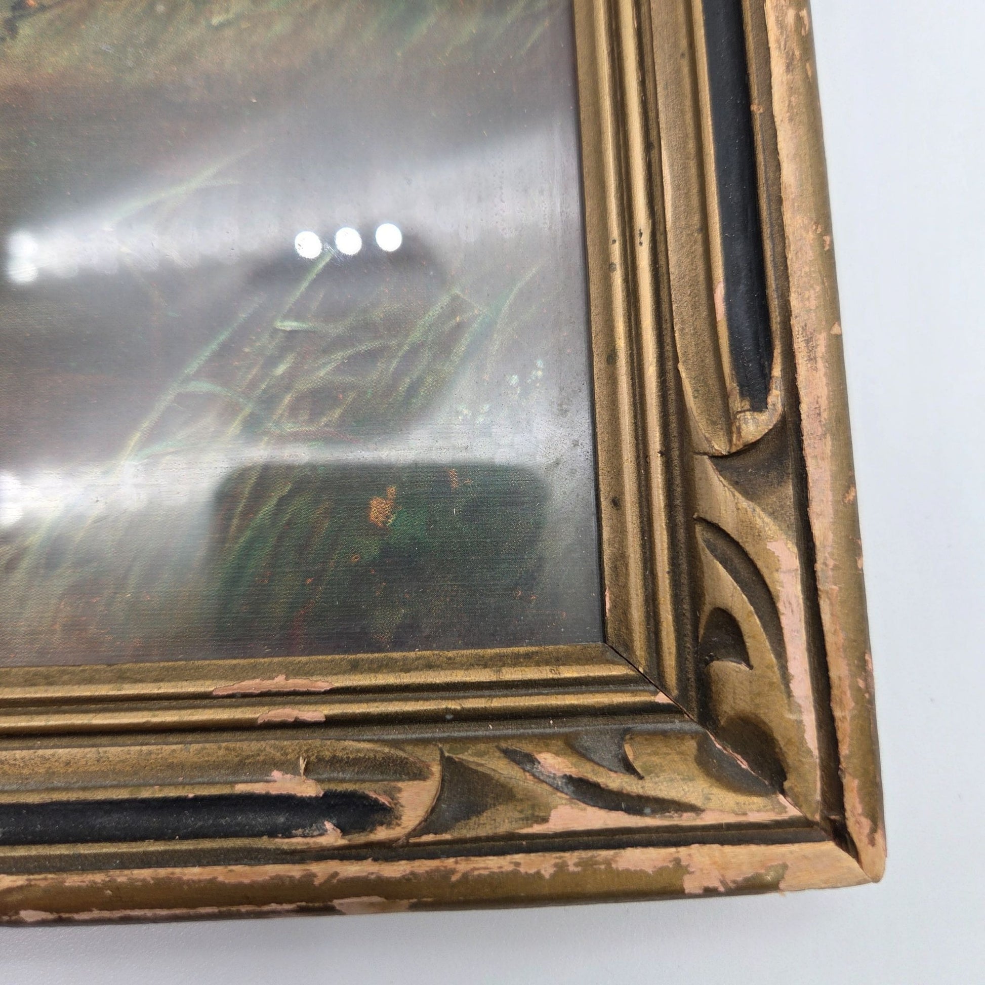 This antique framed print captures a serene pastoral scene by F. Arnolds, featuring spring blossoms, a village church, and tranquil ducks near a stream.