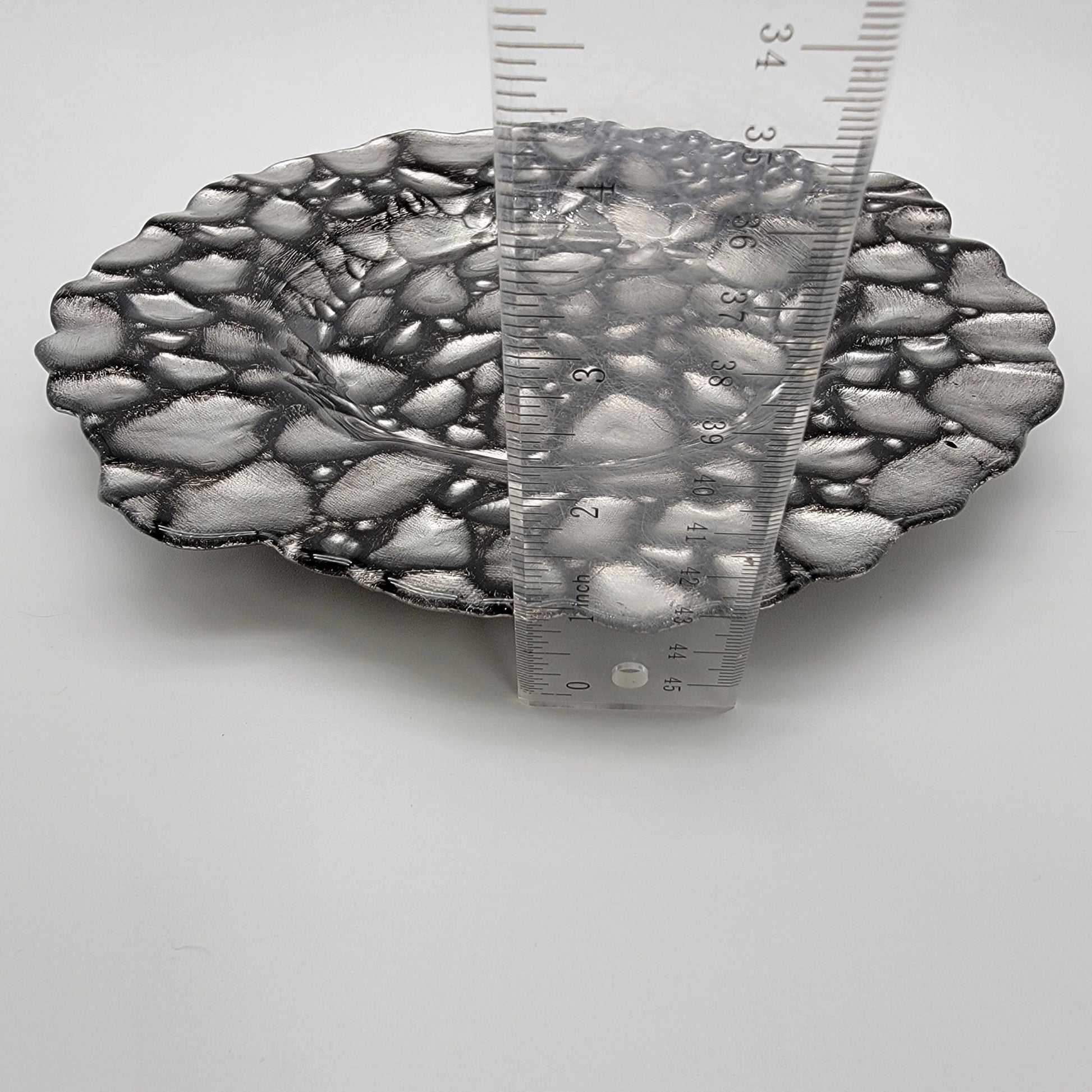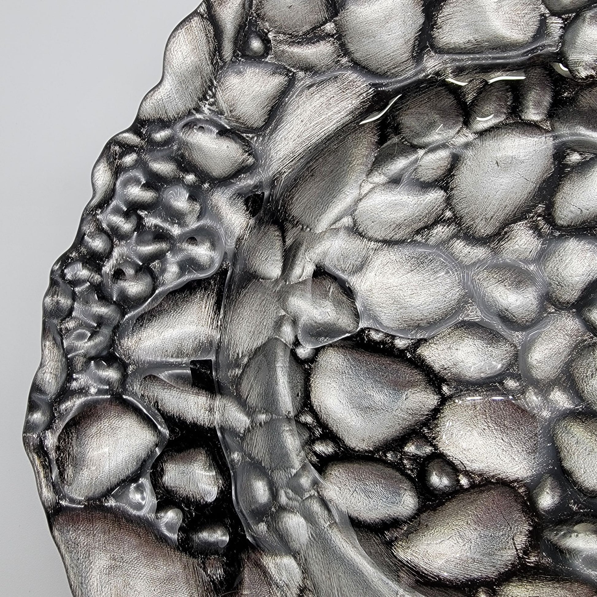 This artistically crafted iridescent glass plate features a unique pebble-textured design. Its 9.5-inch diameter and 1-inch depth make it ideal for display or serving.
