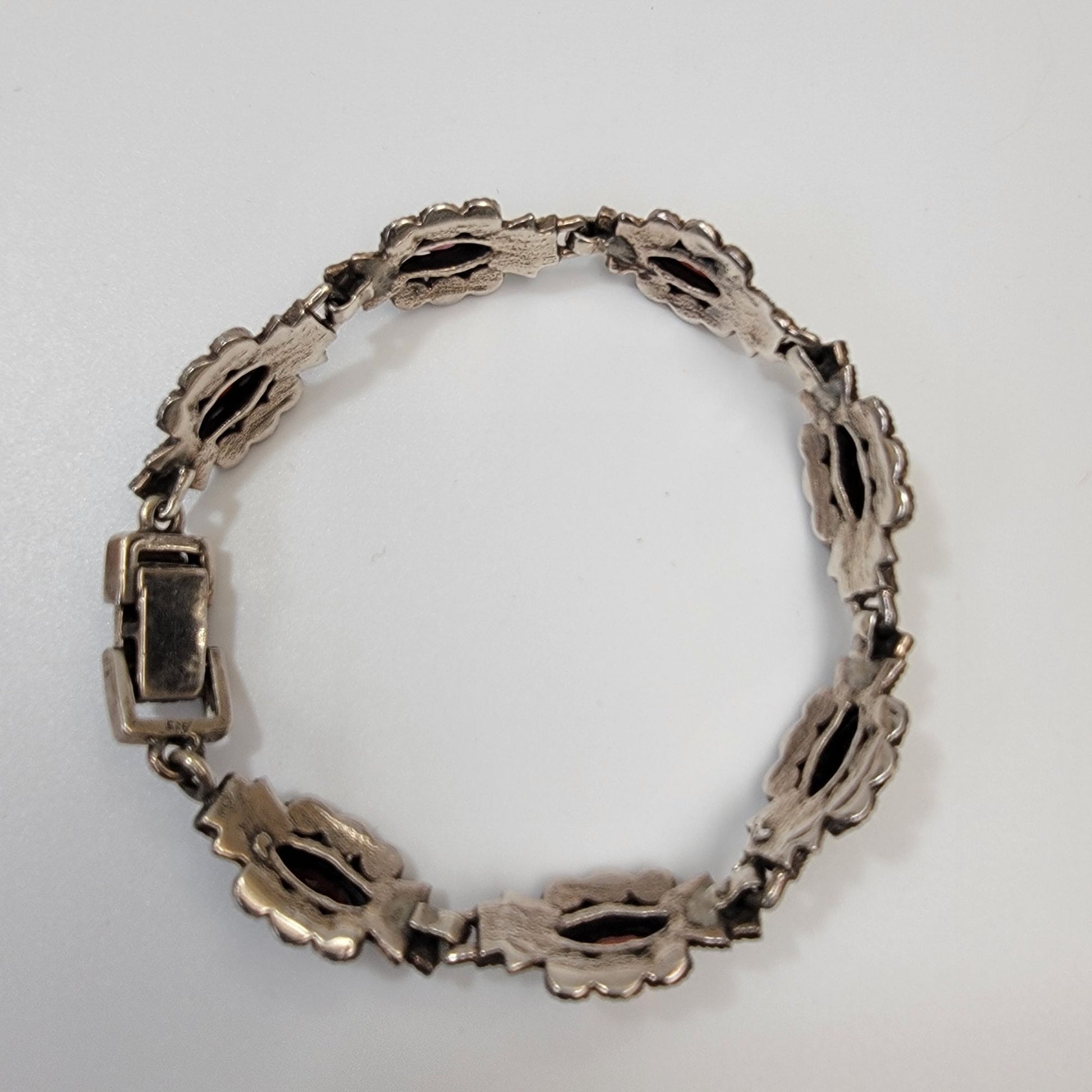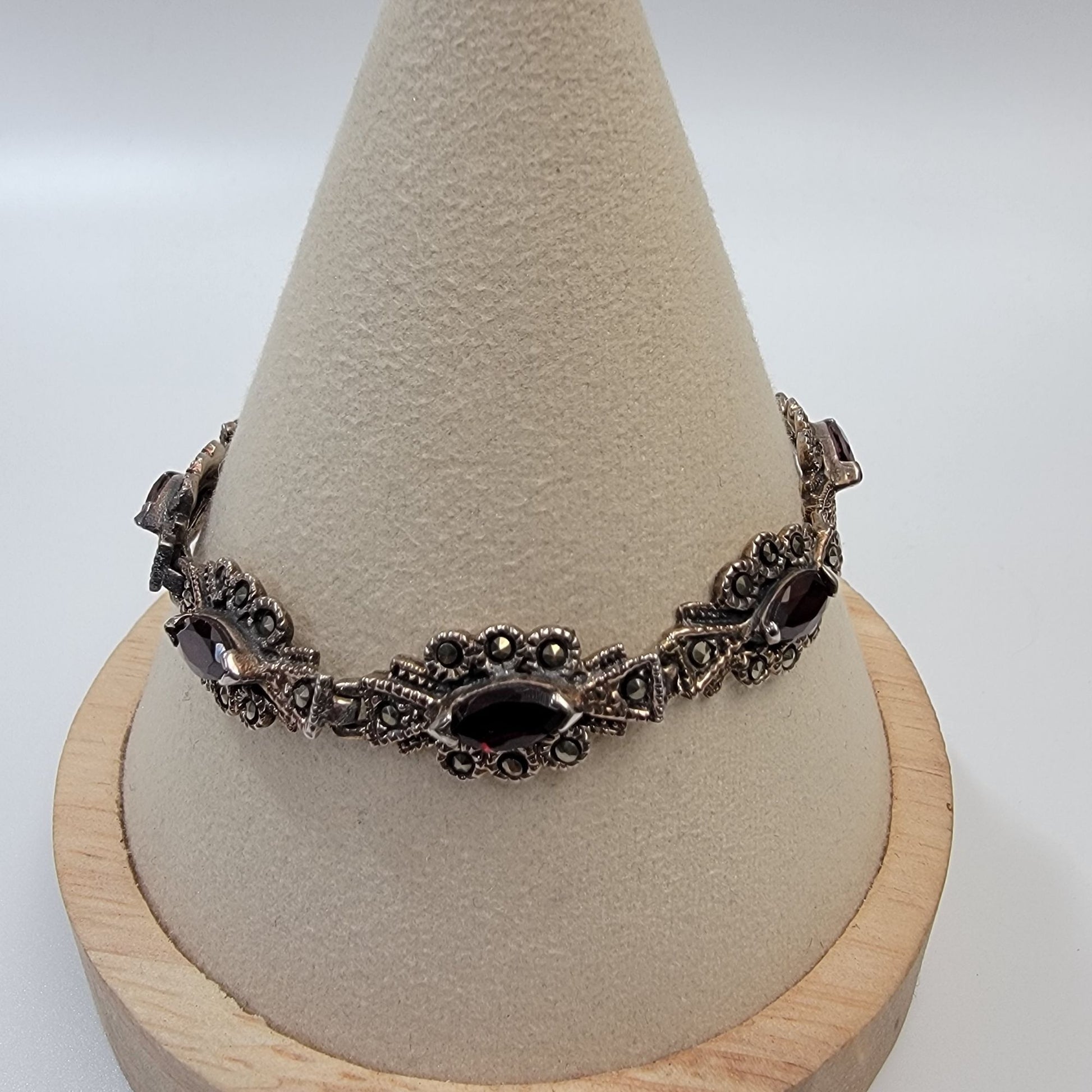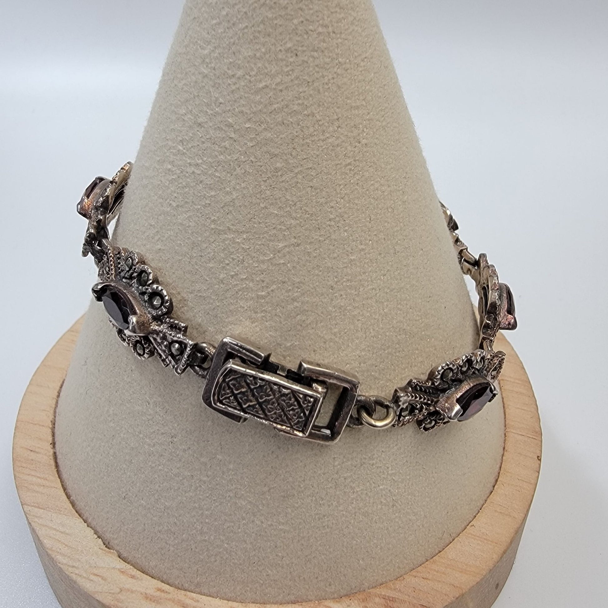 This bracelet whispers tales of timeless elegance, with deep garnet gemstones nestled in intricate silver settings adorned with marcasite. Its Art Deco charm evokes a bygone era of sophistication, making it a treasure for any collector or admirer of vintage beauty. A piece that holds history and style in every detail.