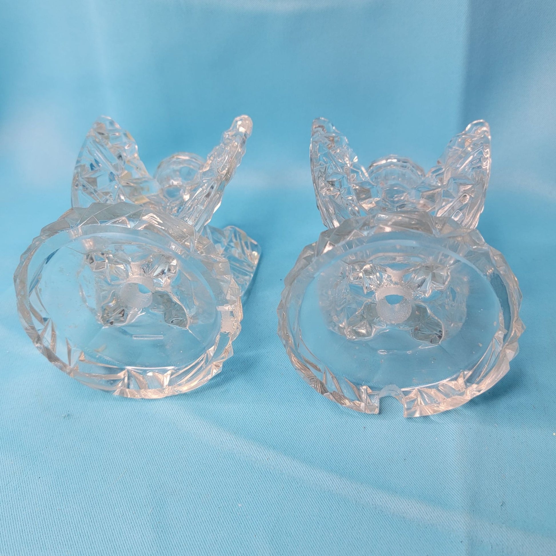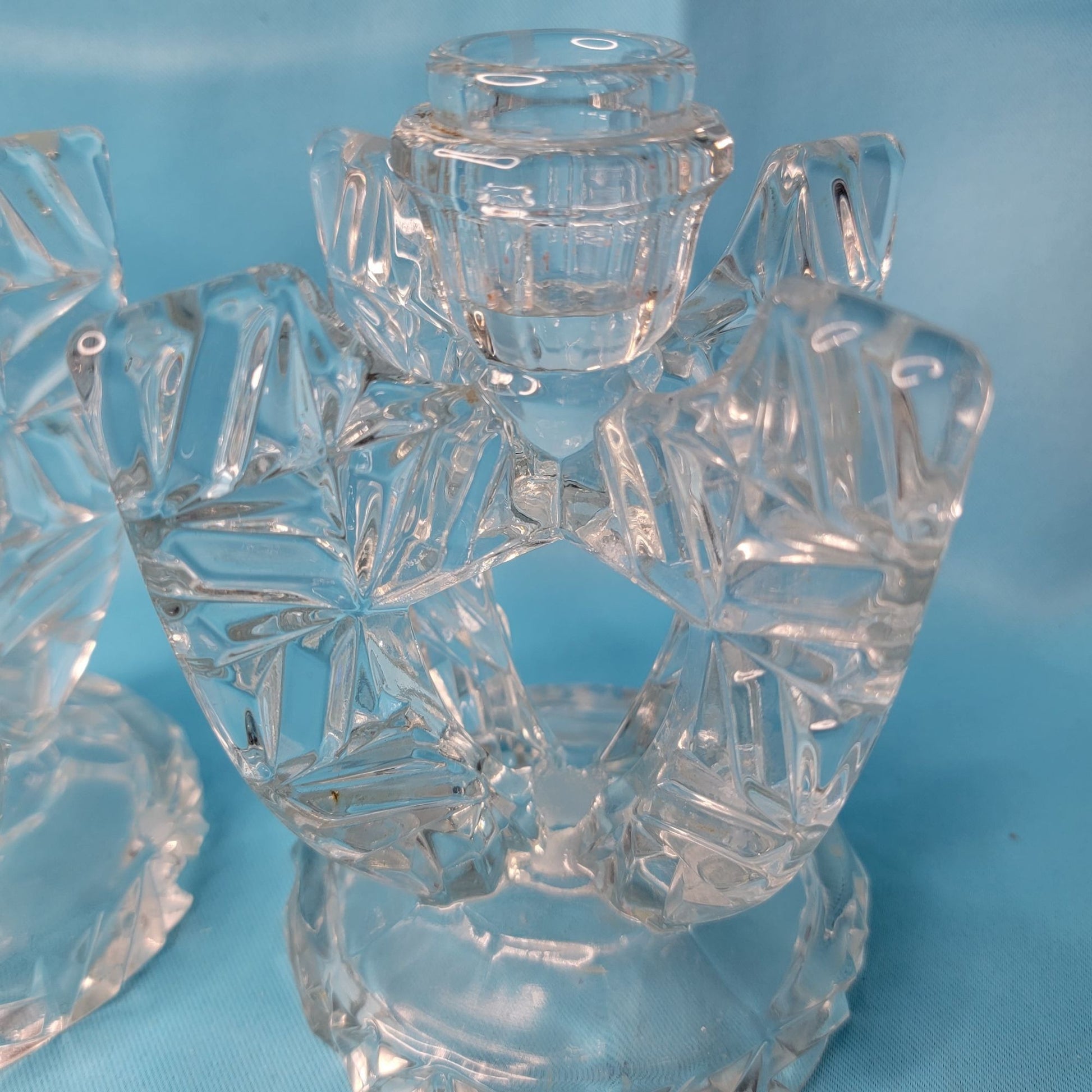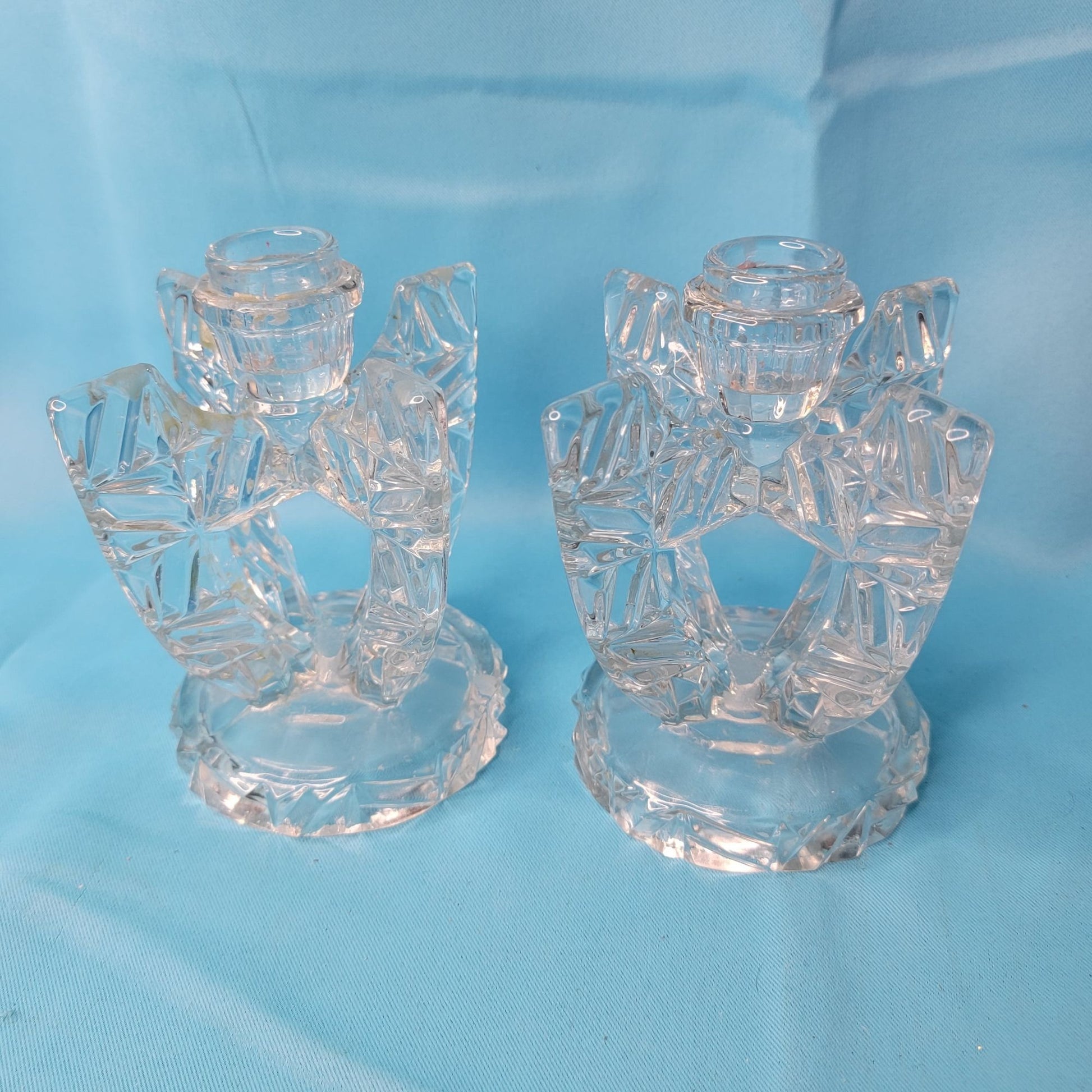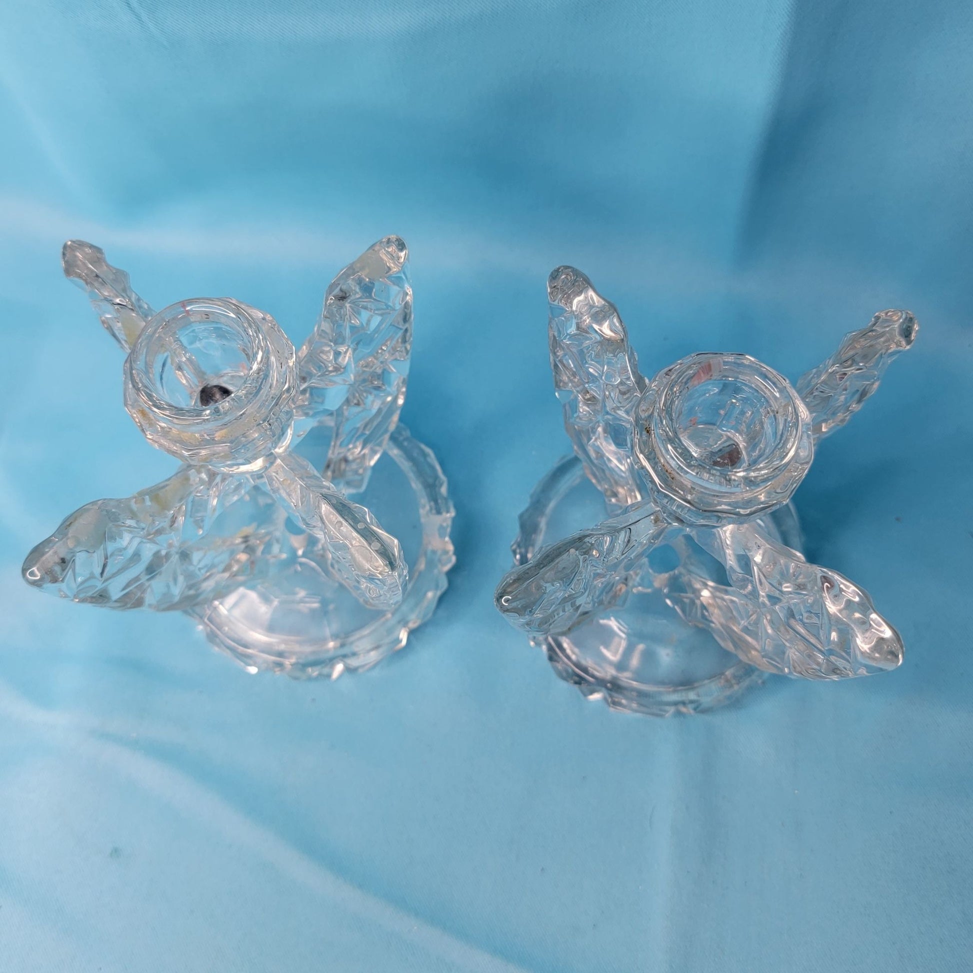 These exquisite Art Deco Czech glass candle holders capture the imagination with their angelic design and intricate cut patterns, reflecting timeless elegance.