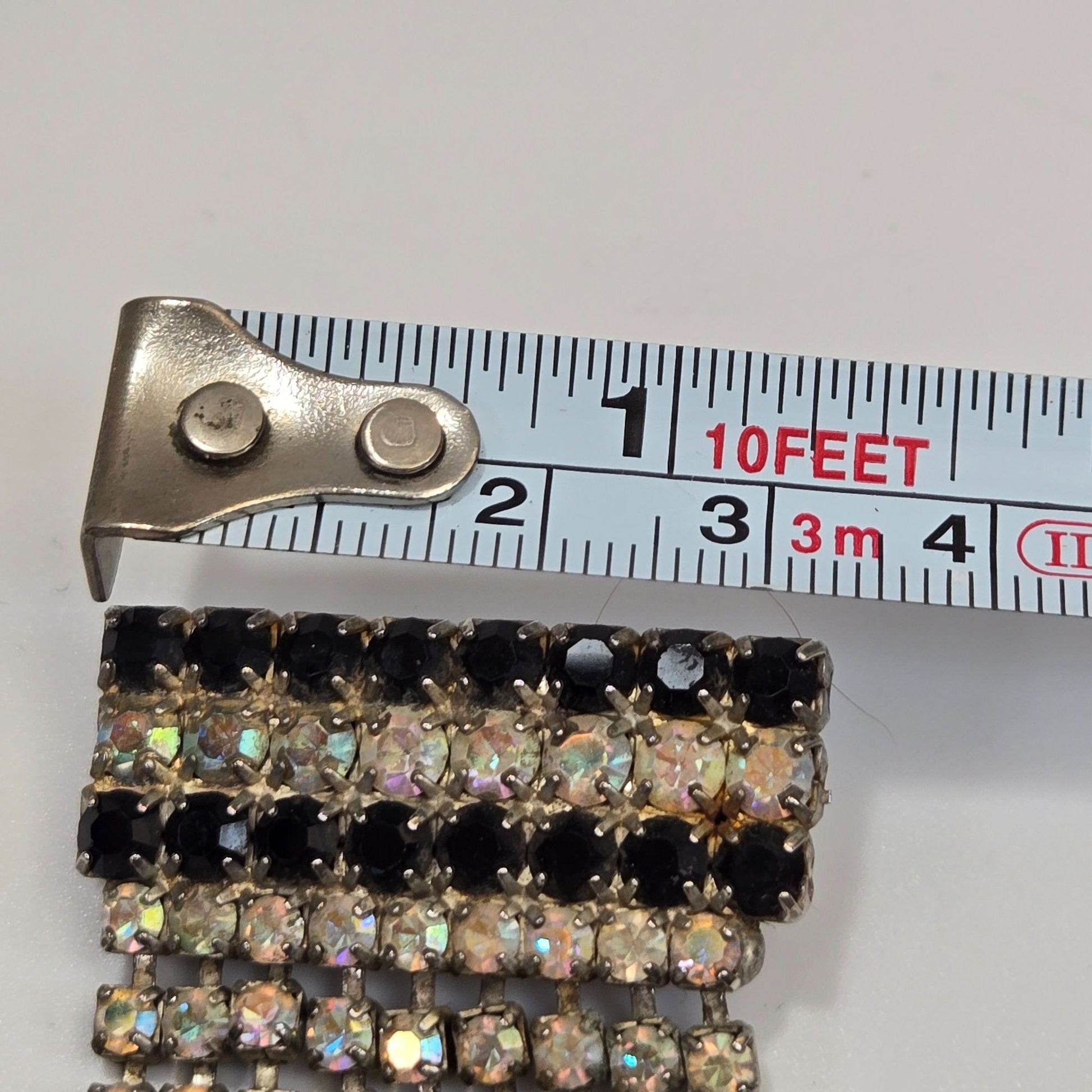 This enchanting vintage brooch captures the glamour of art deco design with cascading aurora borealis rhinestones and black accents. Its elegant waterfall shape evokes timeless sophistication.