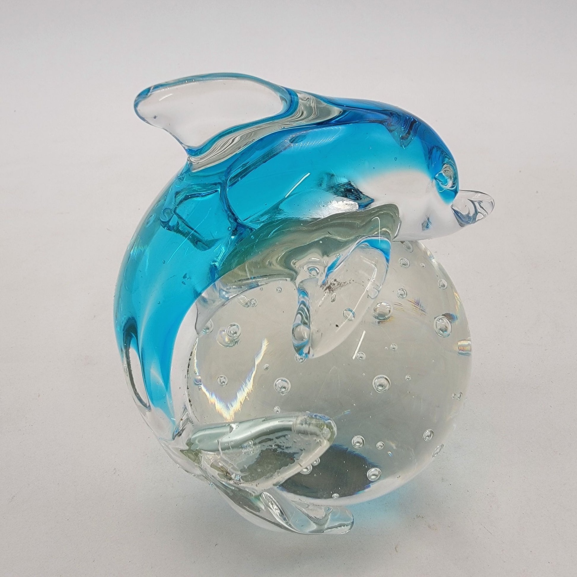 This vintage-inspired glass dolphin paperweight features a stunning blue and clear design with controlled bubbles. A timeless decorative and functional piece.