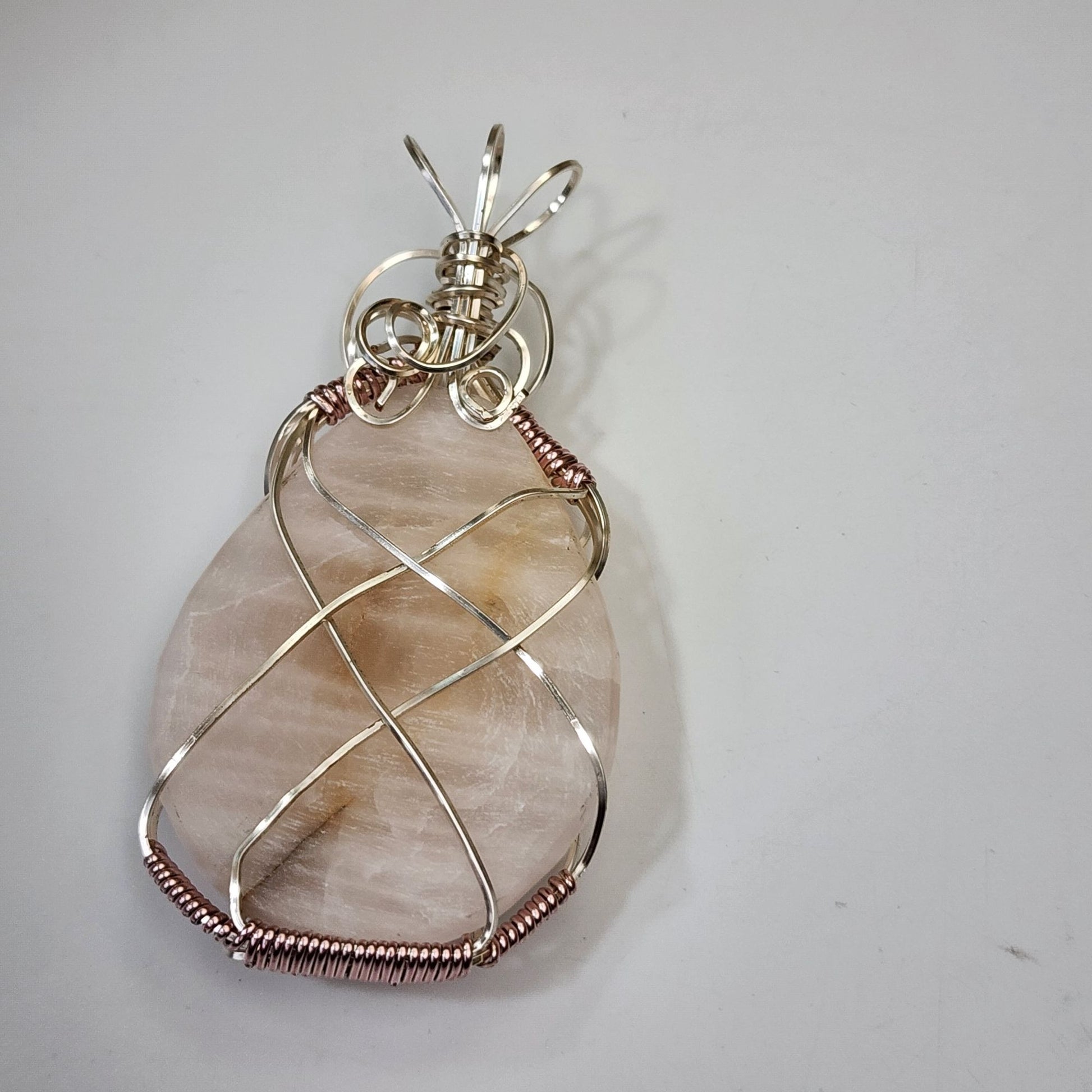 This pendant tells a story of earth and artistry, with soft blush hues of rose quartz cradled by intricate copper wirework. A treasure of beauty and energy, it embodies craftsmanship and nature's charm, making it a meaningful addition to personal adornment.