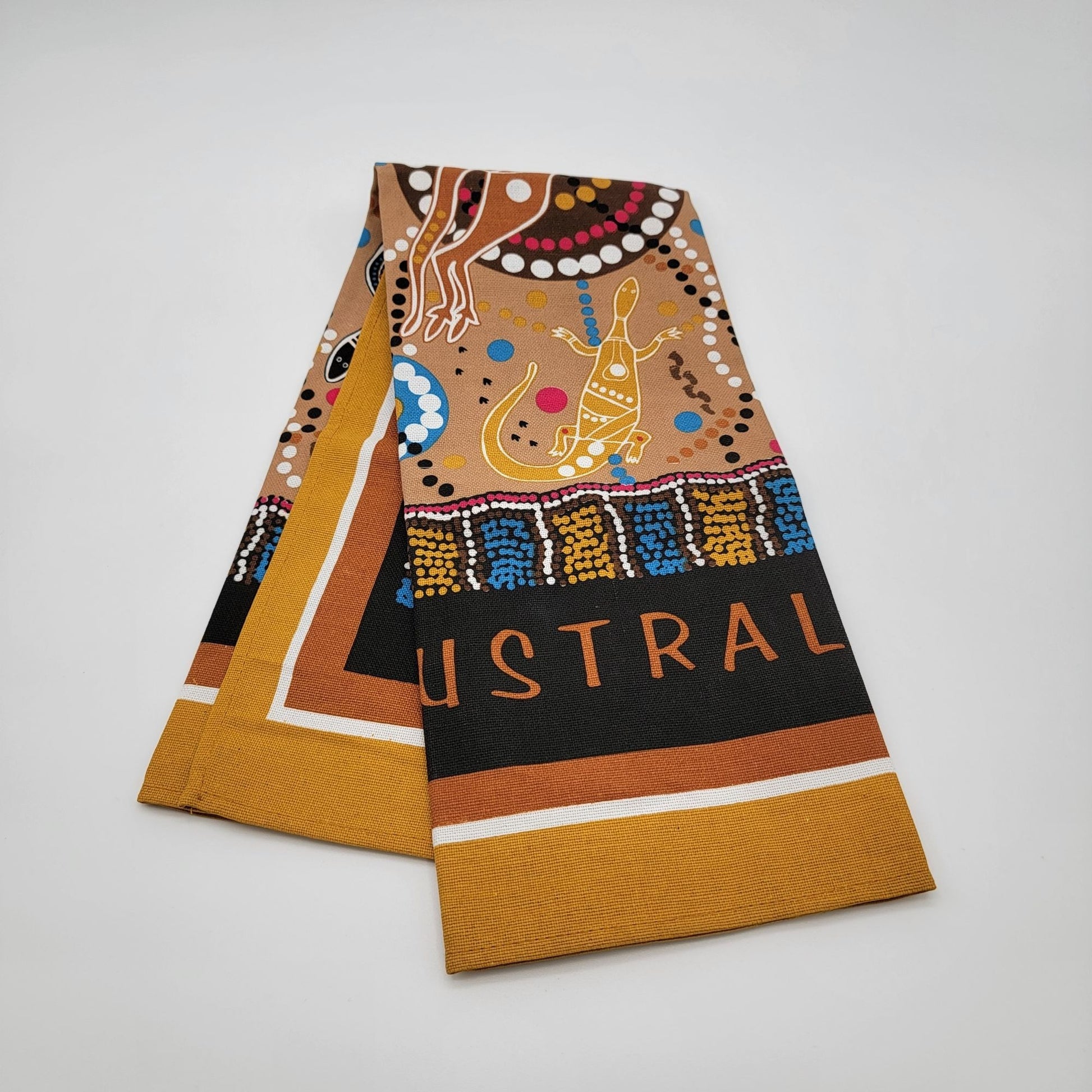 Crafted in Australia, this cotton tea towel showcases vibrant Aboriginal art designs. A functional and cultural piece with detailed patterns and rich colors.