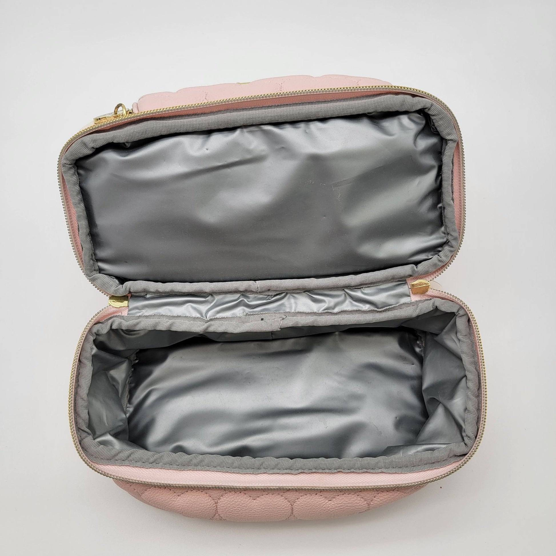 This insulated tote bag is designed for both function and style, featuring quilted hearts, durable gold-tone hardware, and a well-organized storage system.