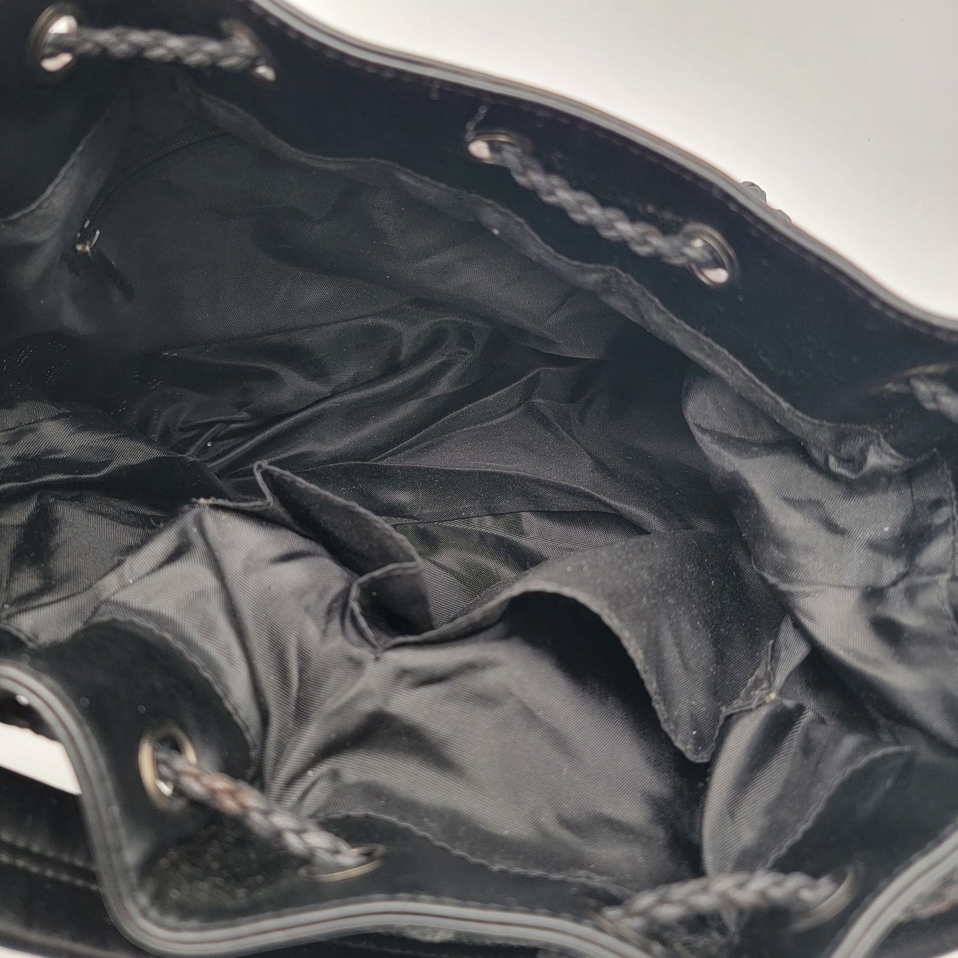 • Drawstring closure with silver-tone hardware