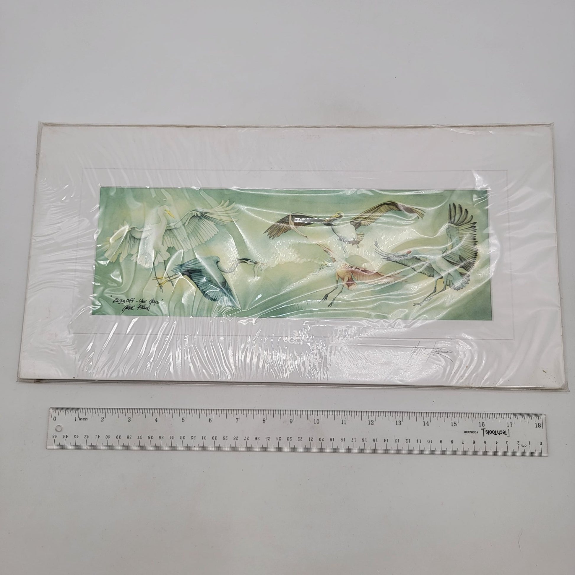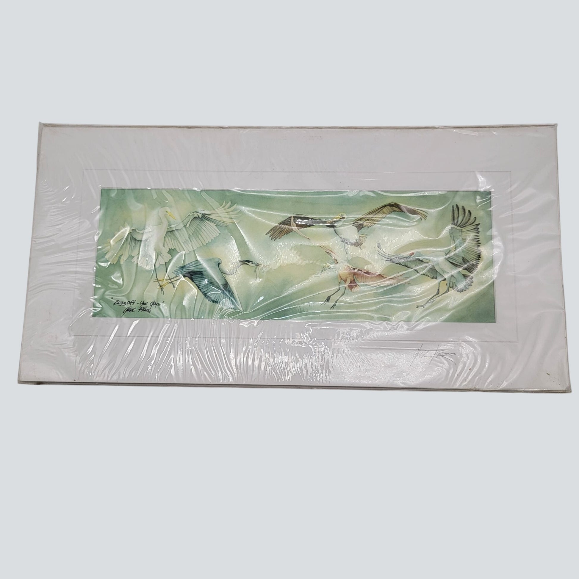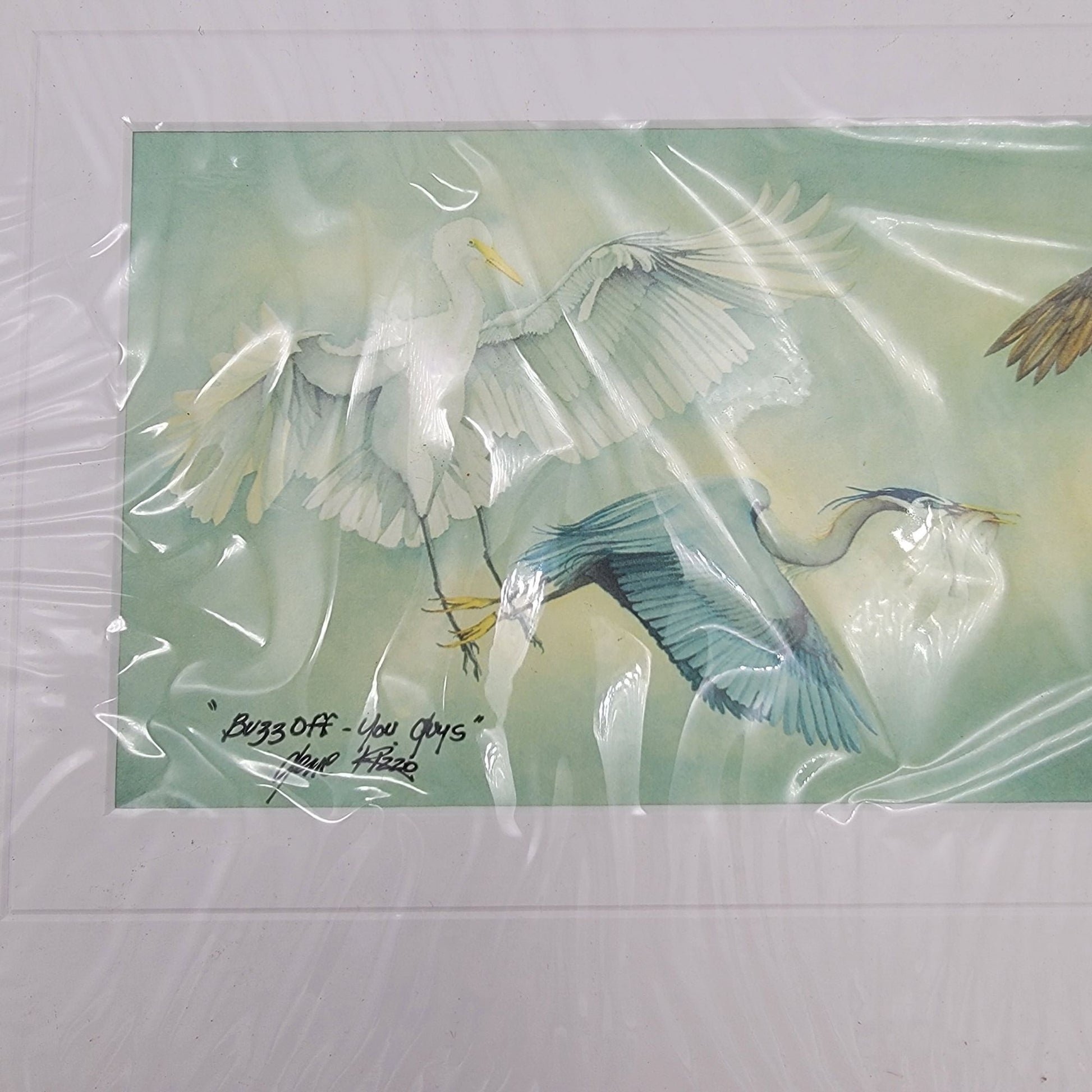 This vintage matted print titled "Buzz Off - You Guys" by Gene Rizzo captures a serene avian scene with dynamic movement. Signed by the artist, it evokes a sense of timeless elegance.