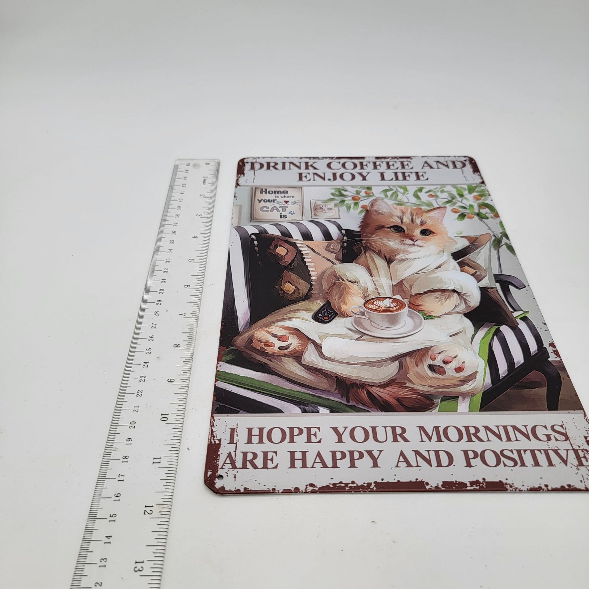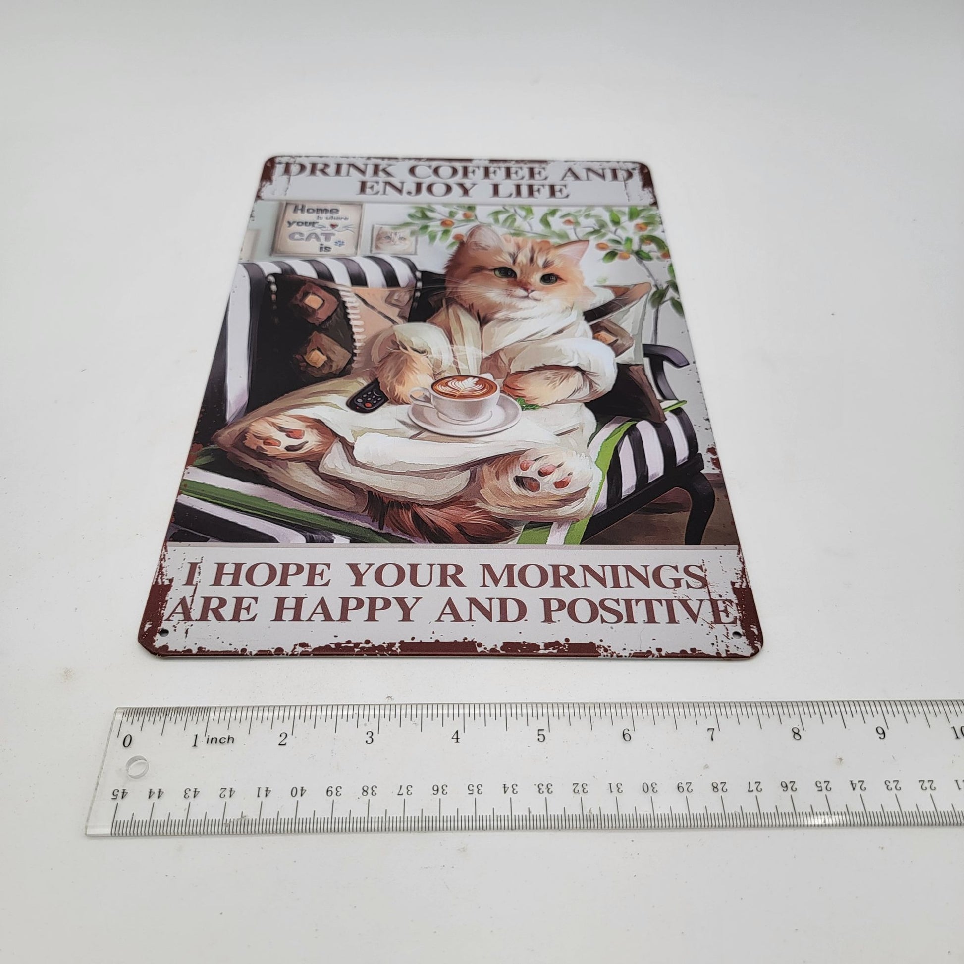 This charming metal sign features a cat living its best life in a robe, holding a coffee cup. Add a bit of feline humor to your mornings.