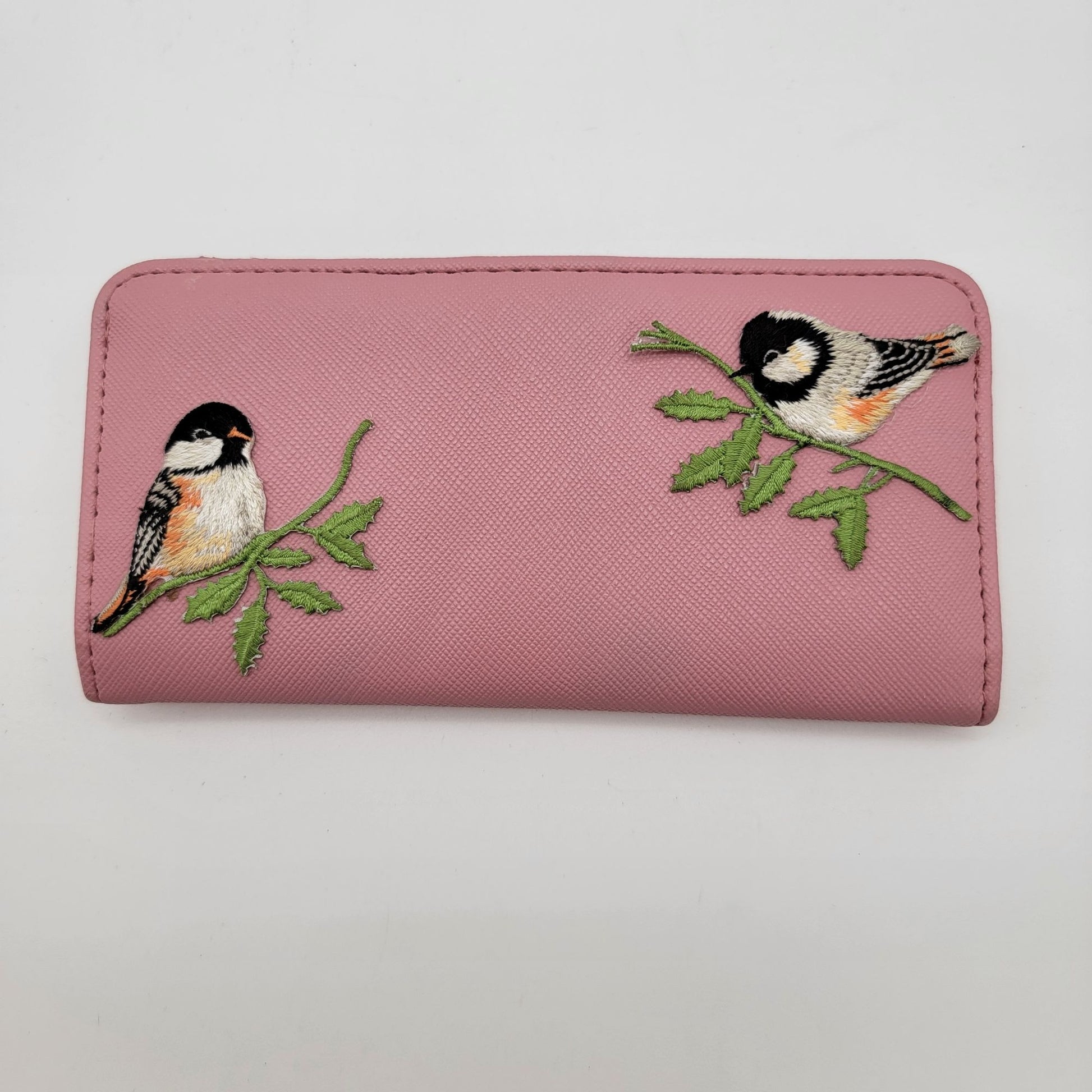 Delight in this charming wallet, featuring delicate chickadee bird embroidery perched on leafy branches. Compact yet functional, it keeps essentials organized with a snap closure, card slots, and a zipper pocket. A whimsical accessory for bird lovers, blending practicality with artistry.