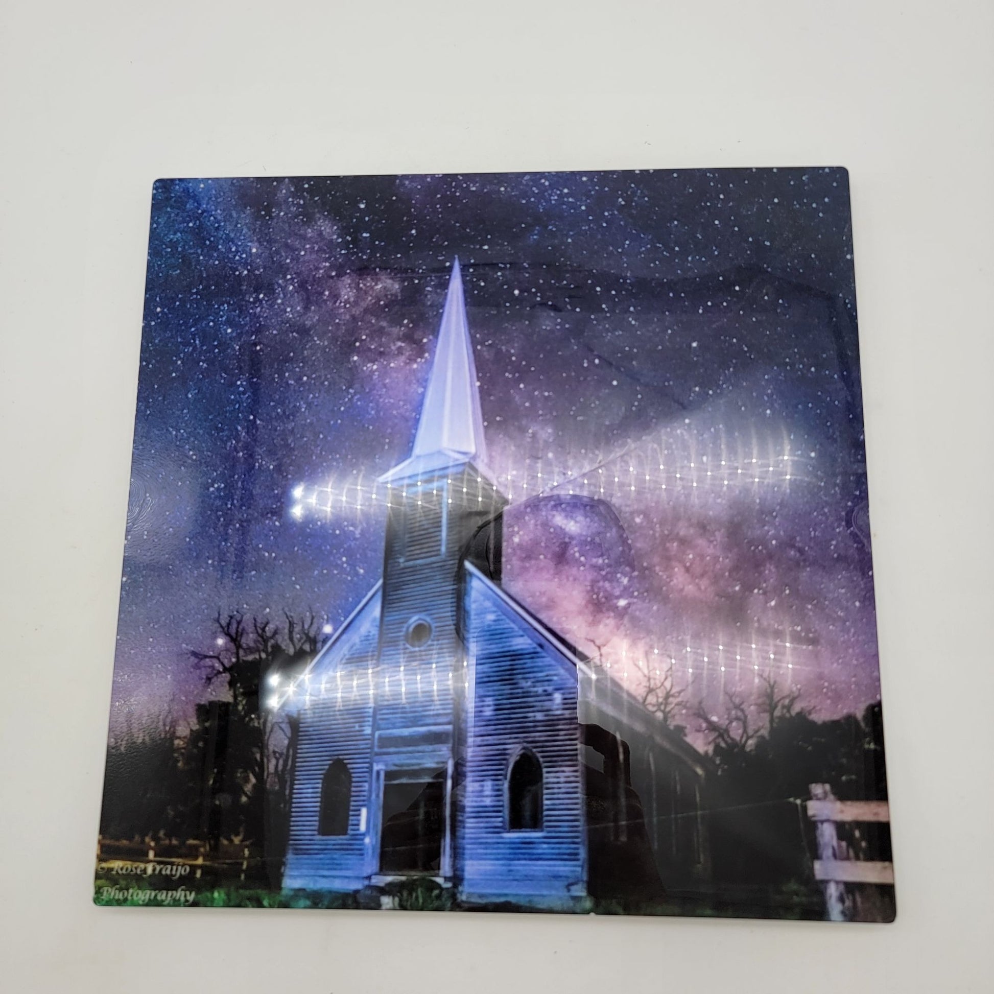 This striking metal wall art by Rose Fraijo showcases a serene church against a captivating starry night sky. The vibrant colors and fine details make it an elegant addition to any art collection. The durable metal print ensures long-lasting beauty, while the photographer's signature adds an authentic touch.