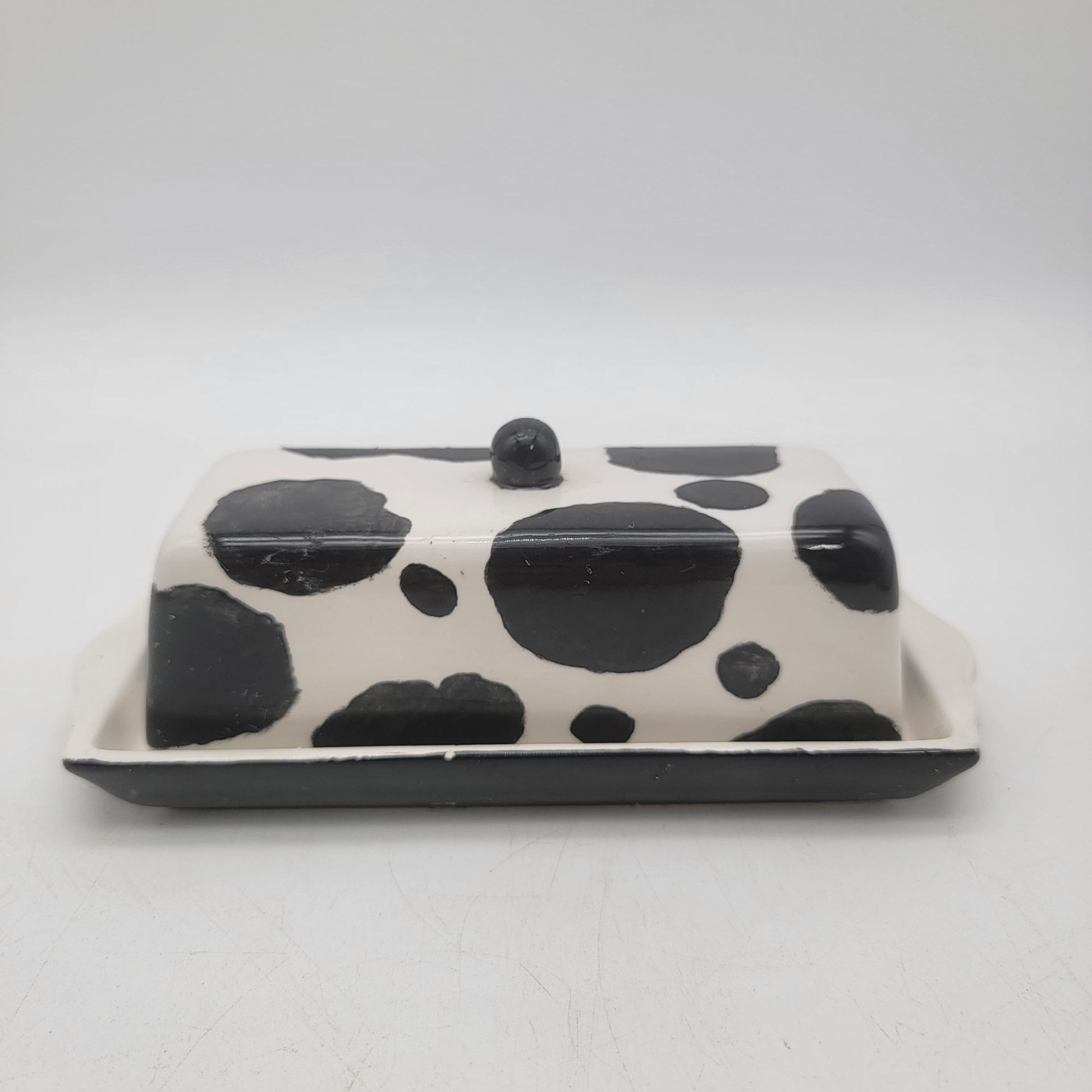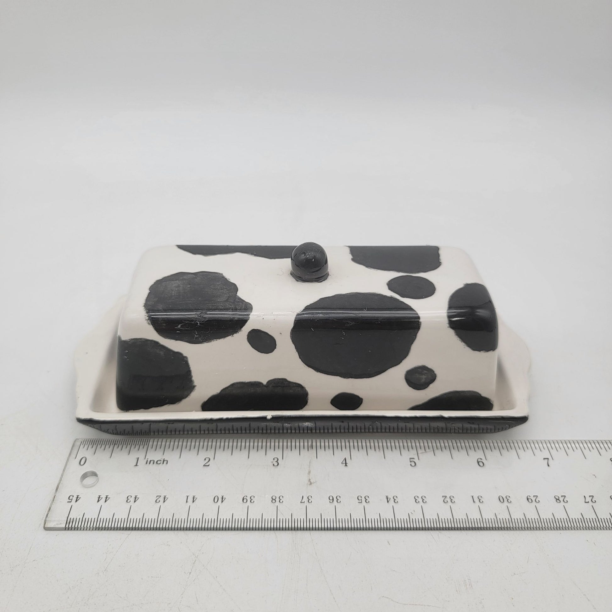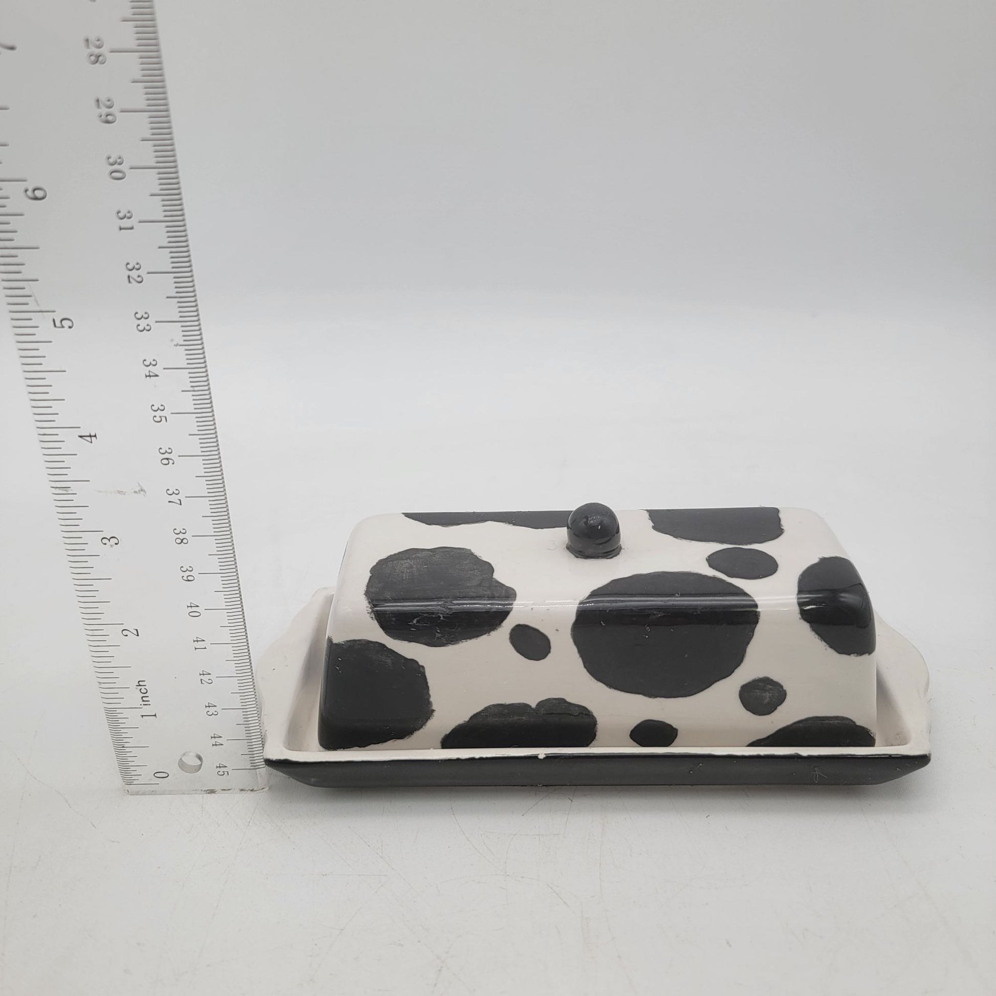 This cow print butter dish showcases a charming vintage aesthetic, with its black and white design adding a rustic farmhouse flair to any kitchen.