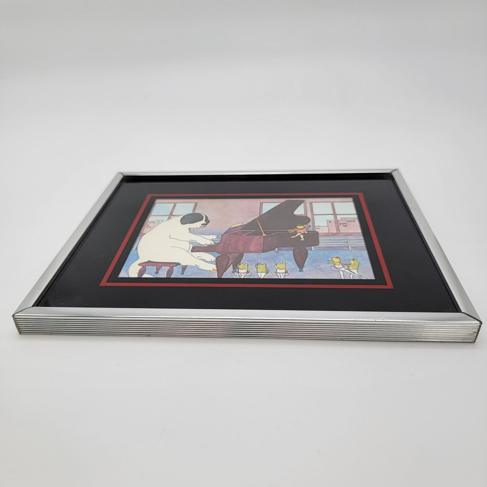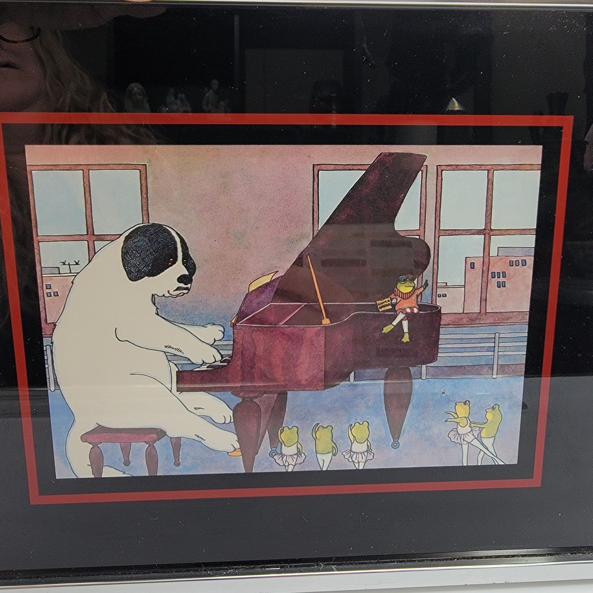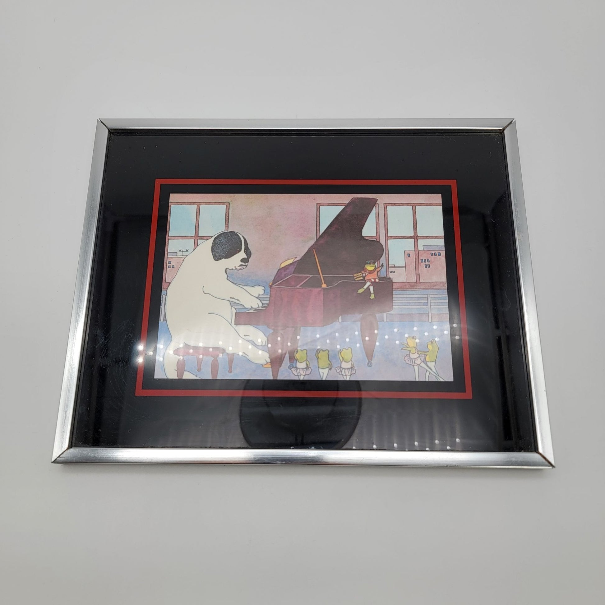 This art piece captures the hilarious essence of a piano-playing dog and dancing frogs. A great conversation starter in a sleek silver frame.
