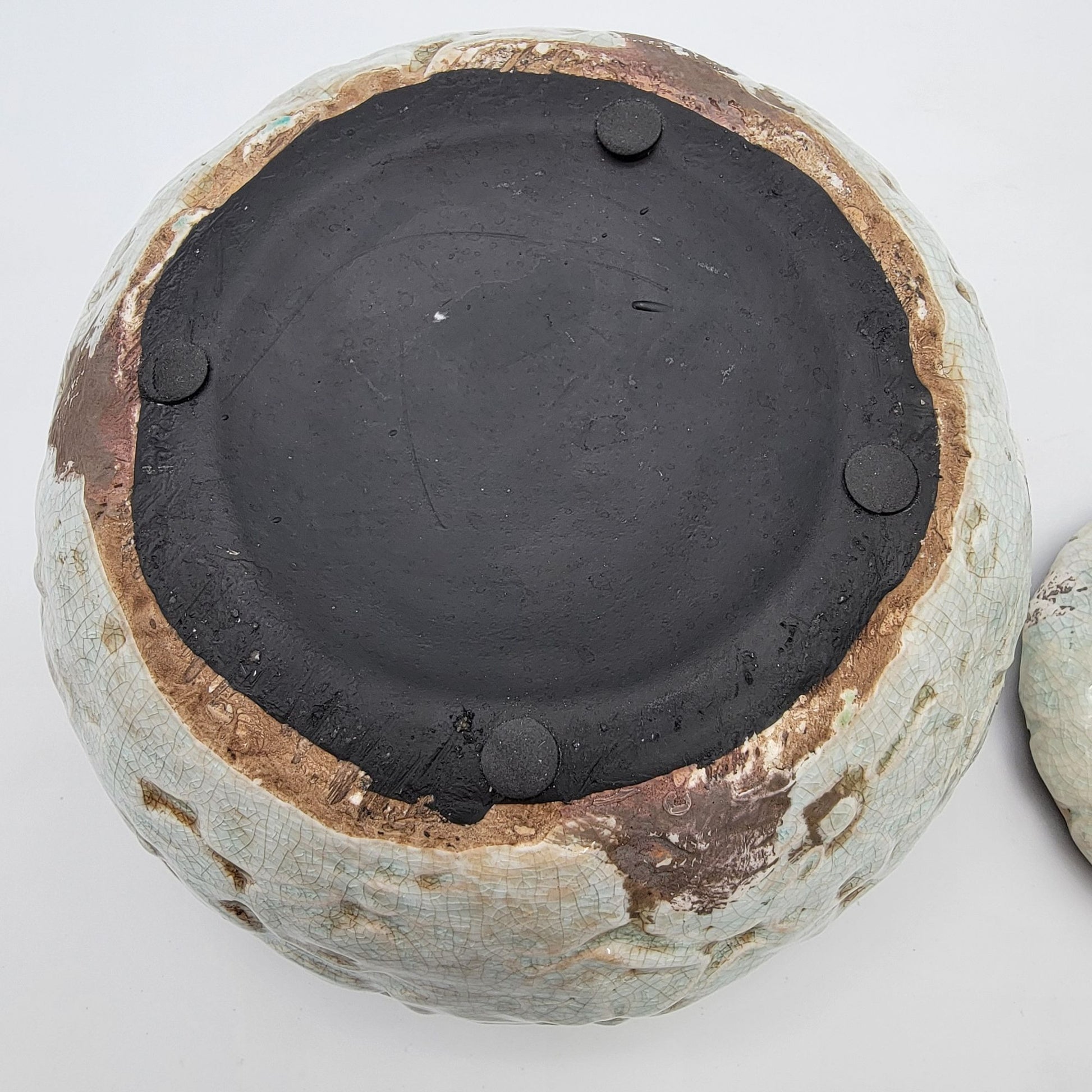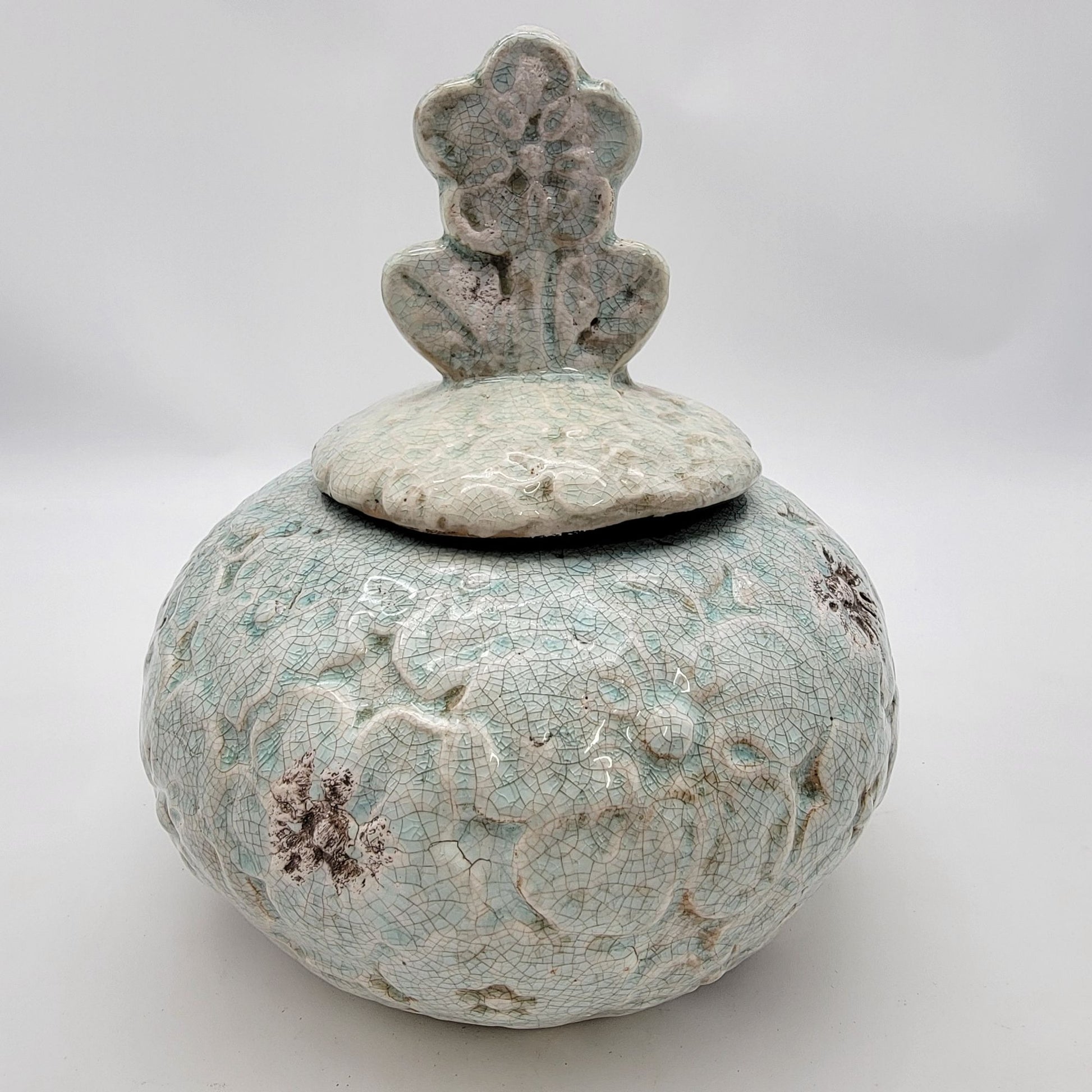 This handcrafted earthenware jar exudes a vintage charm with its intricate floral design and delicate crackle glaze. Its unique round shape and floral lid make it a captivating centerpiece or storage option, adding character to any space. The jar's timeless design complements various decor styles.