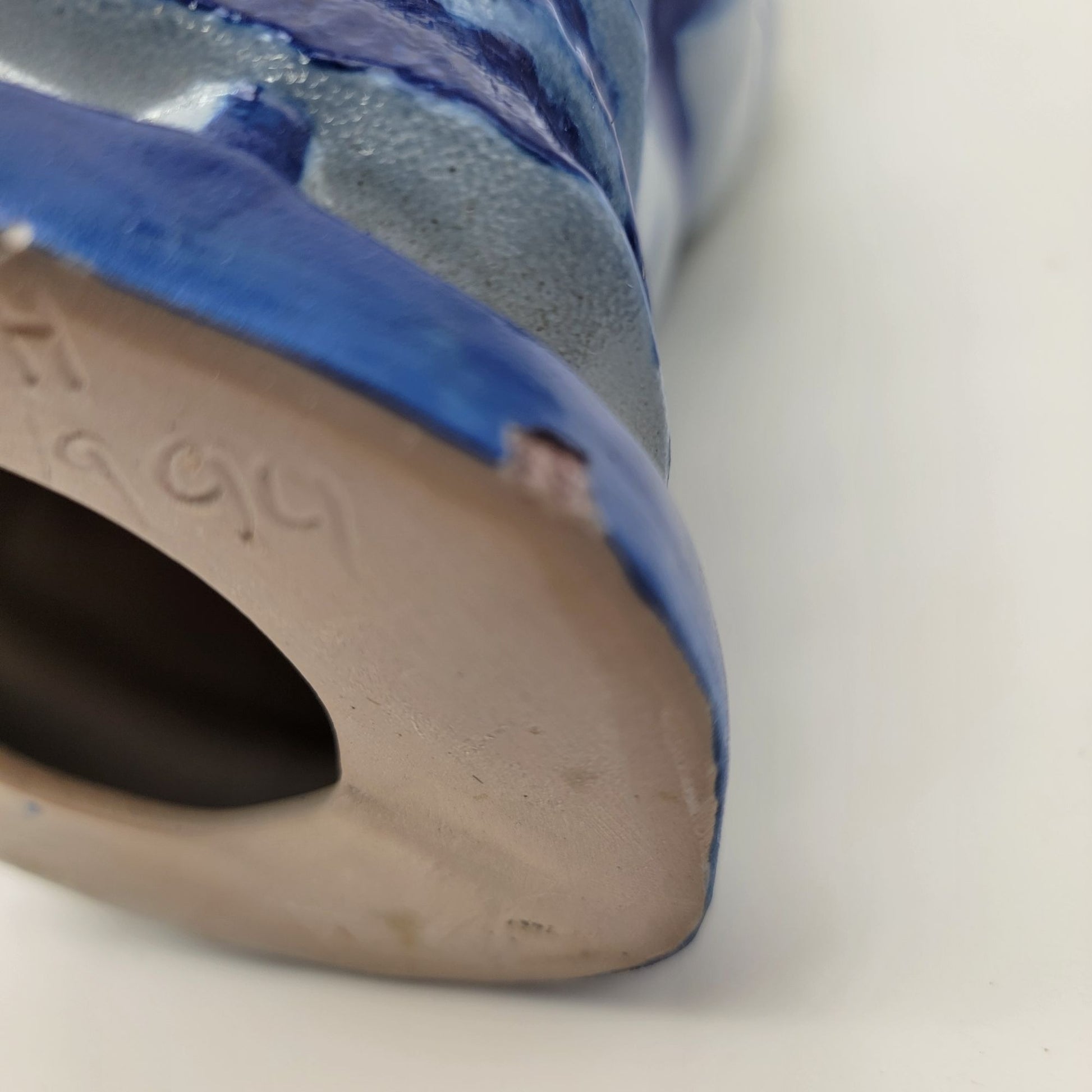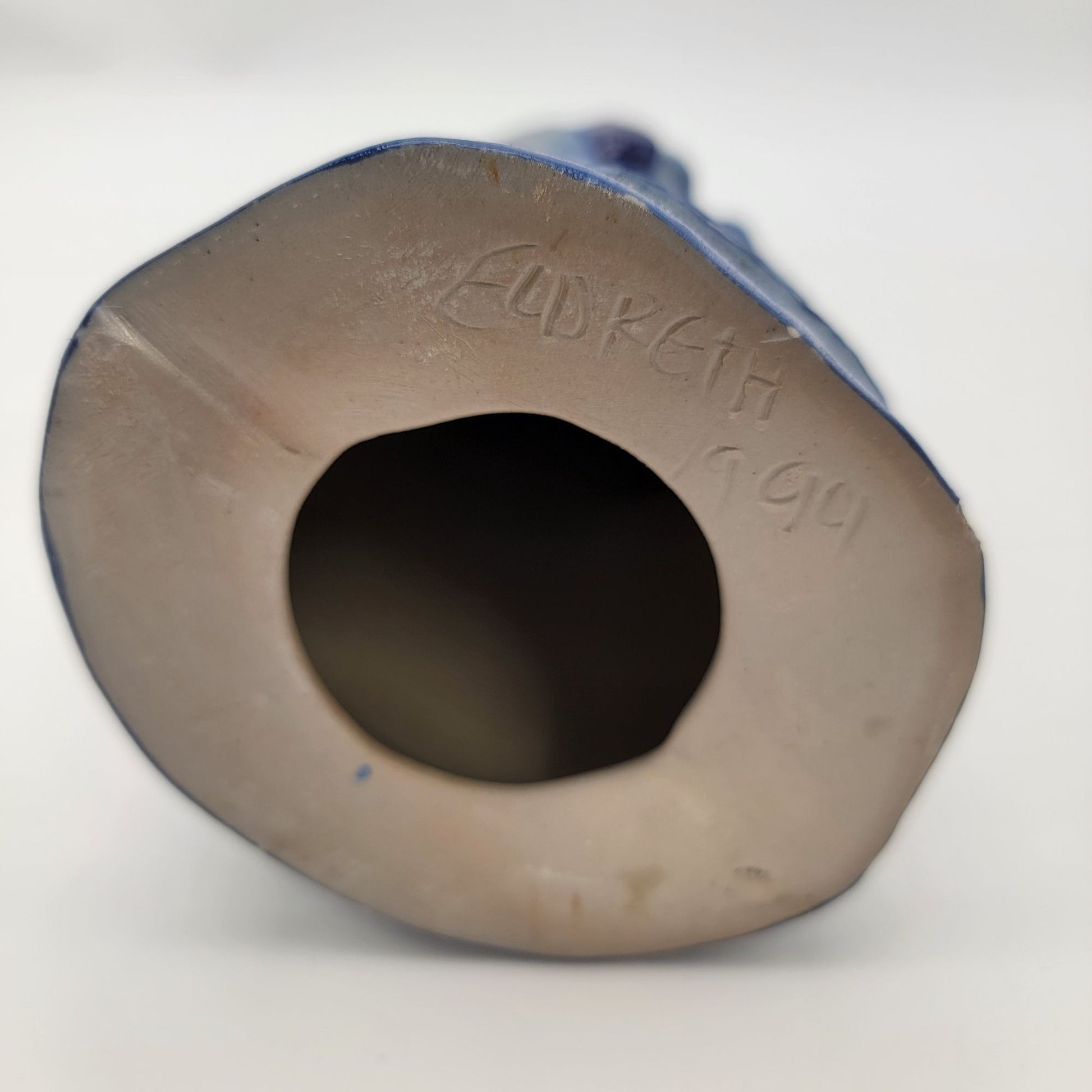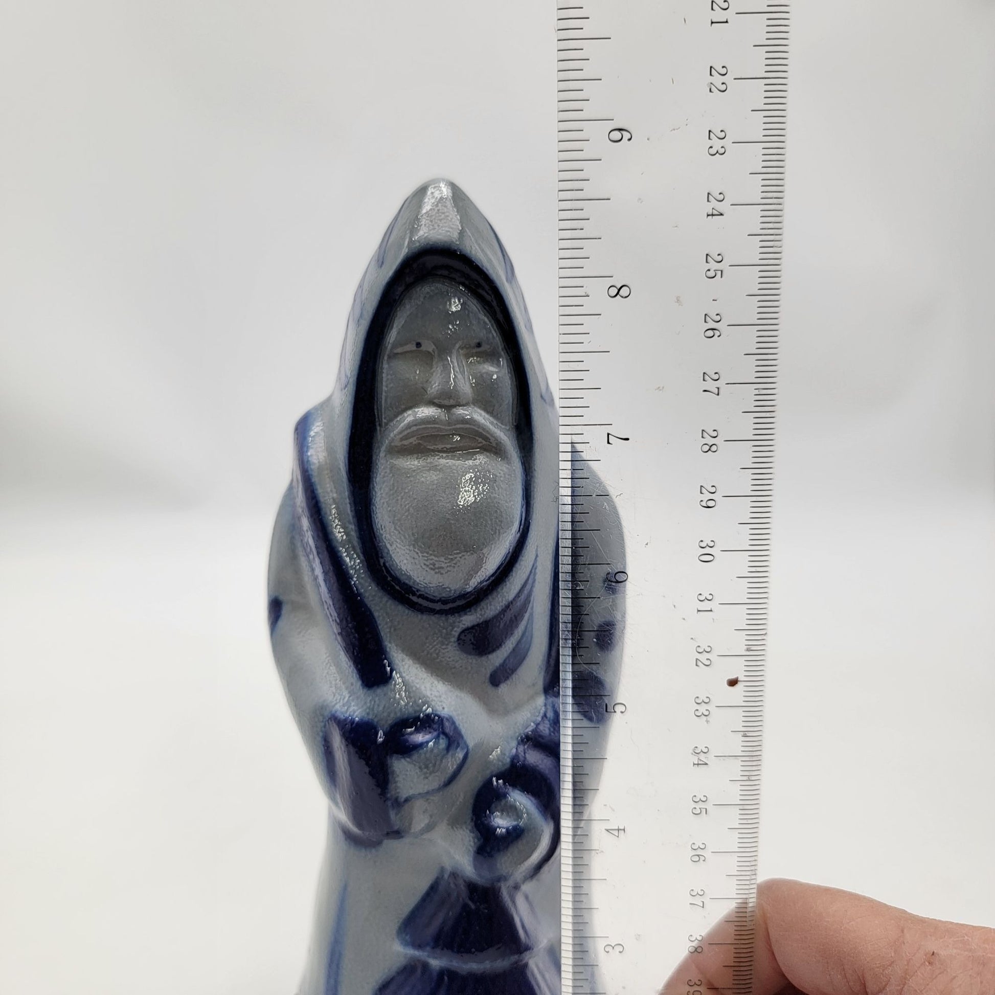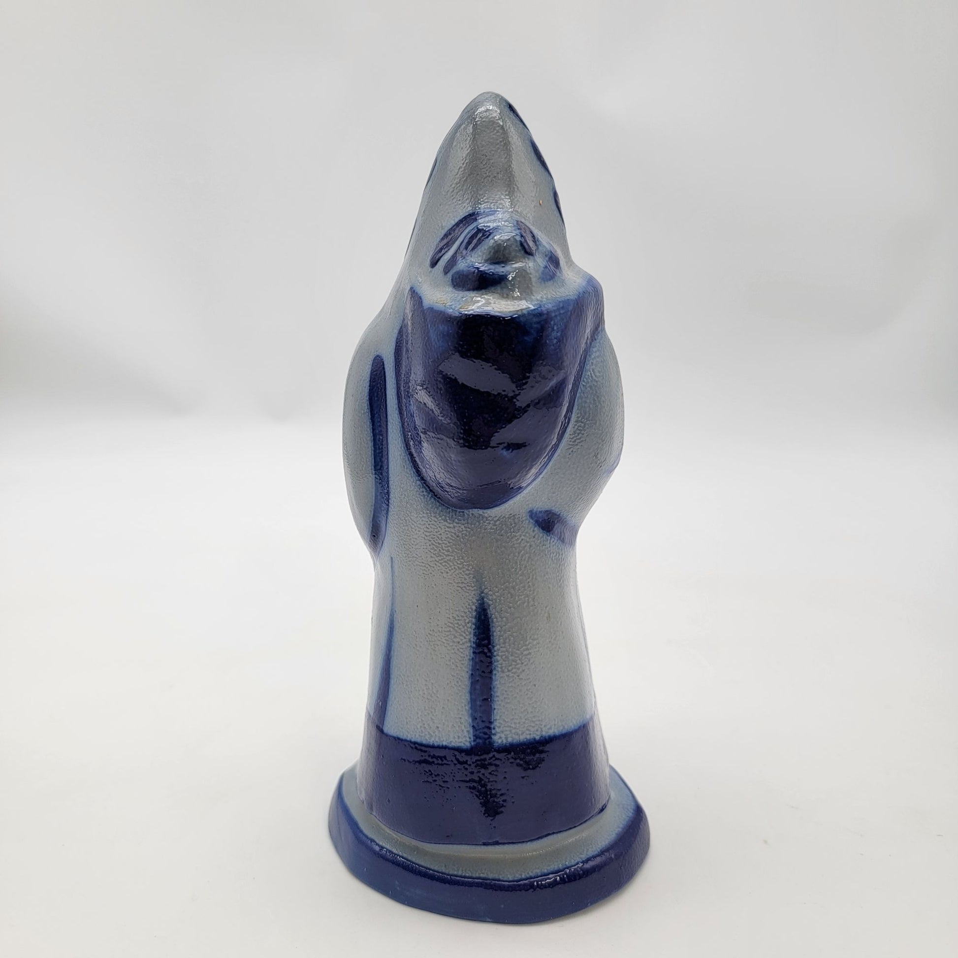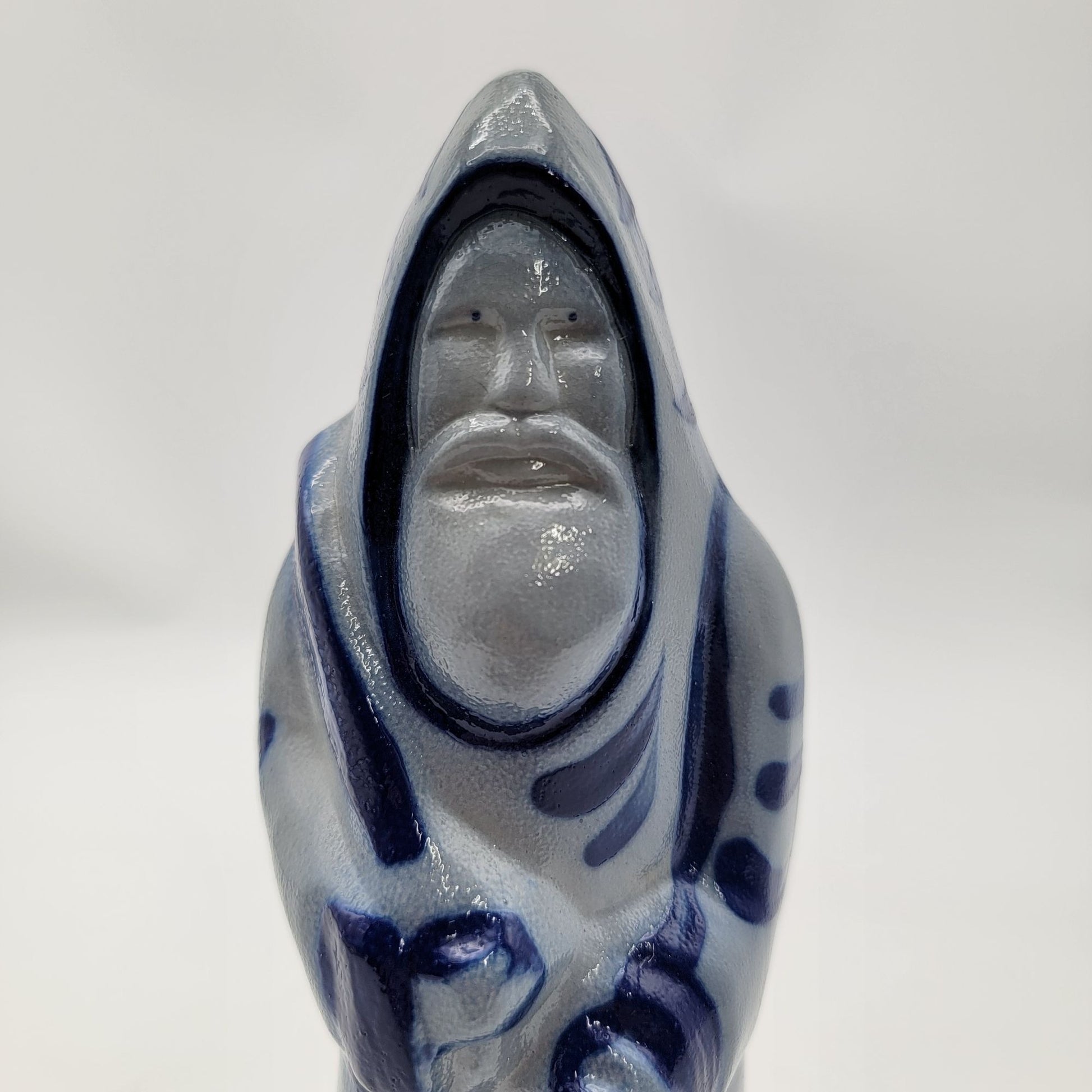 This vintage Eldreth pottery Santa from 1994 showcases a serene hooded Santa in a striking blue and gray salt glaze. The artistry and unique design reflect the era's craftsmanship.
