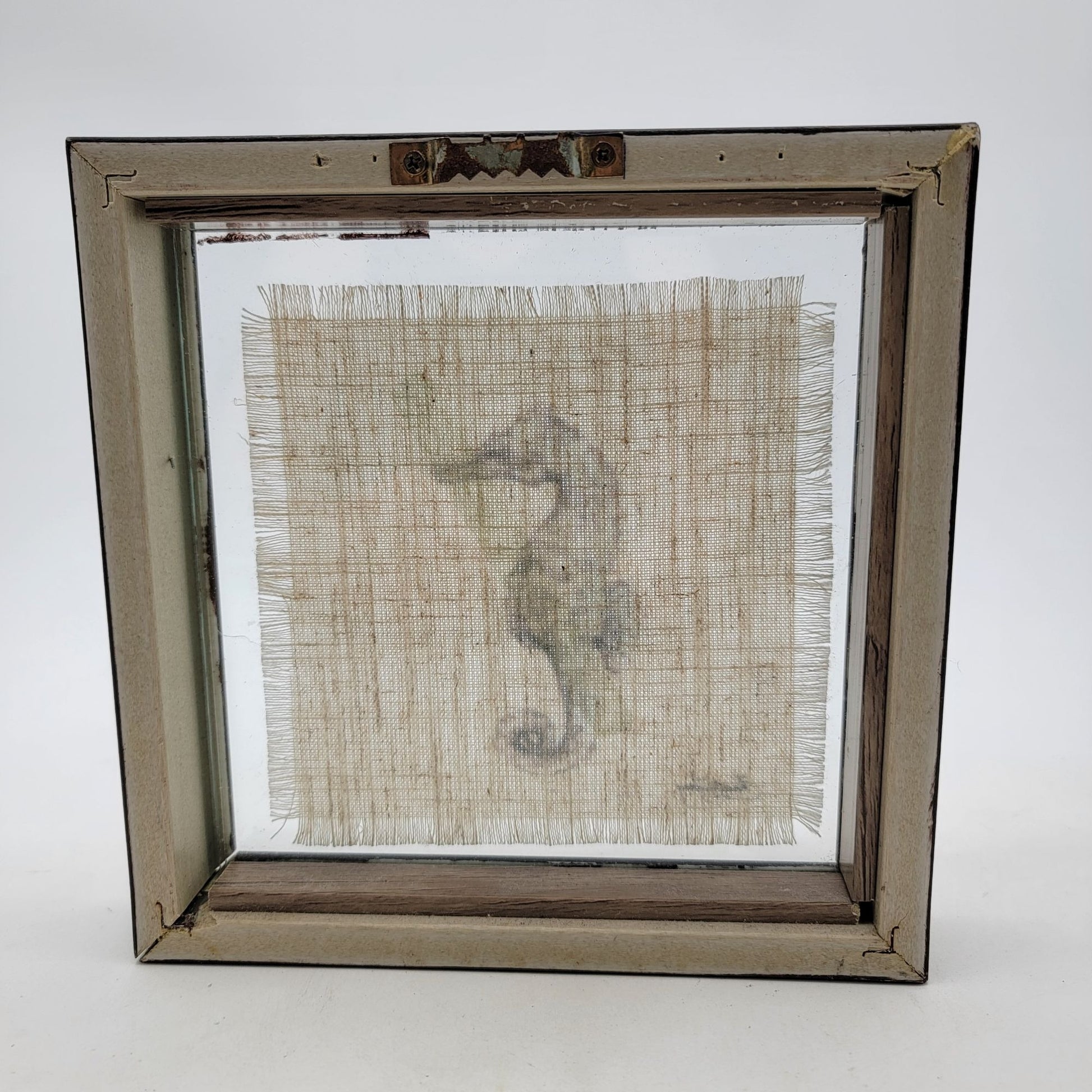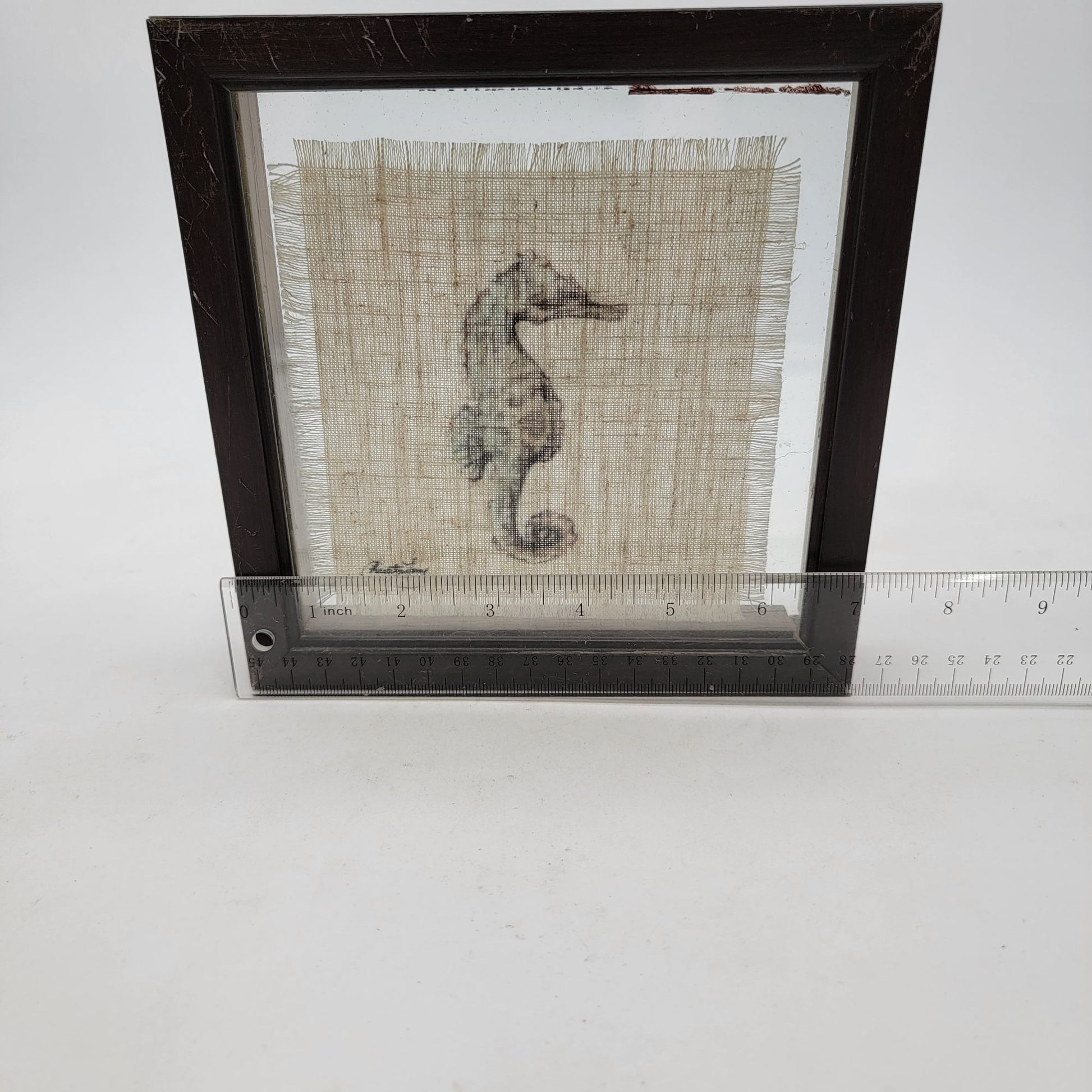 This framed seahorse art features a delicate design on linen, elegantly capturing marine life. The piece is signed by the artist, adding authenticity and value. The rustic wooden frame complements the artwork, making it suitable for both contemporary and classic settings. A sophisticated addition to any art collection.