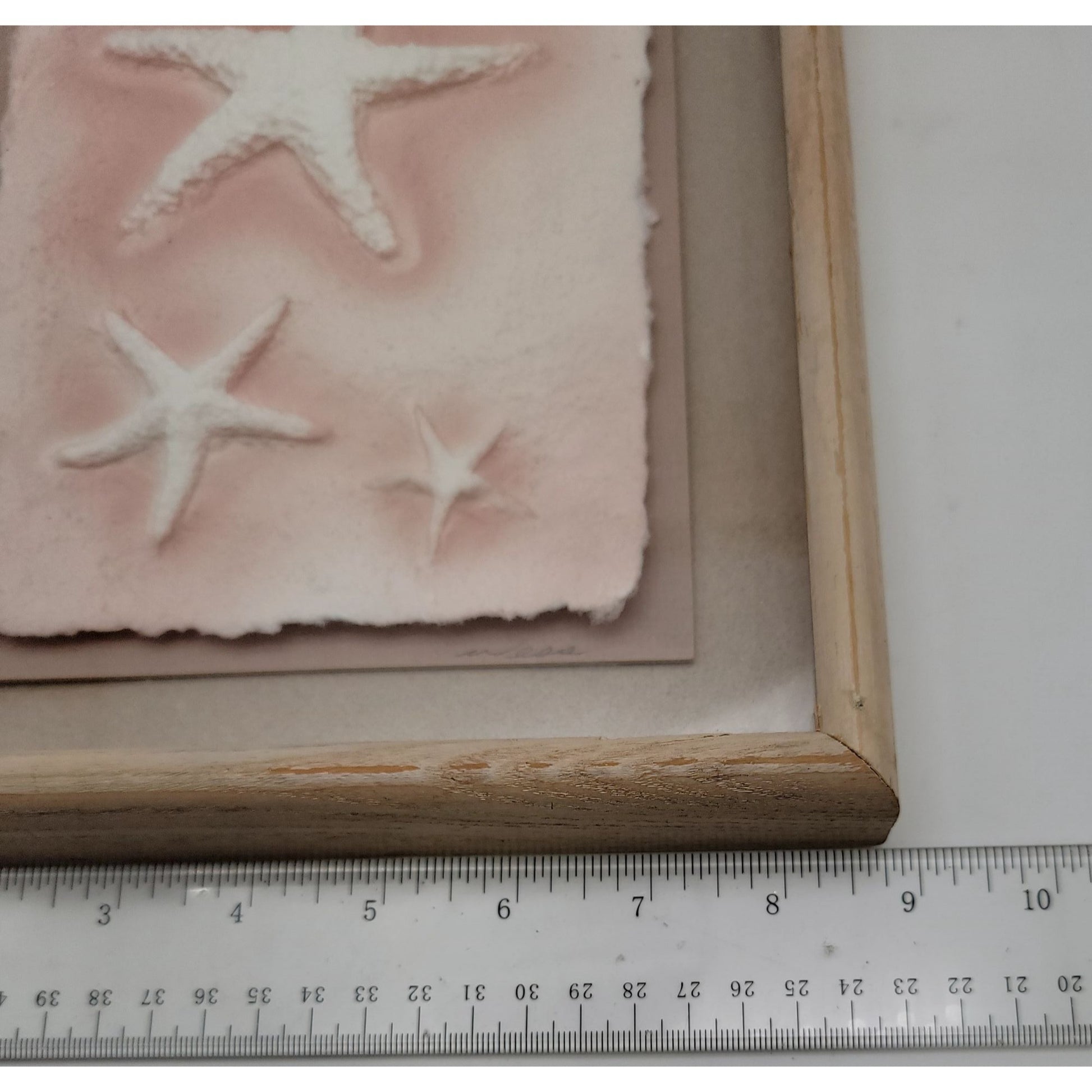 This vintage cast paper art piece by Wess Wesley Smith for Figi Graphics features an elegant starfish design. Encased in a rustic wooden frame, this artwork exudes a vintage charm, ideal for adding a touch of coastal elegance to any decor setting.