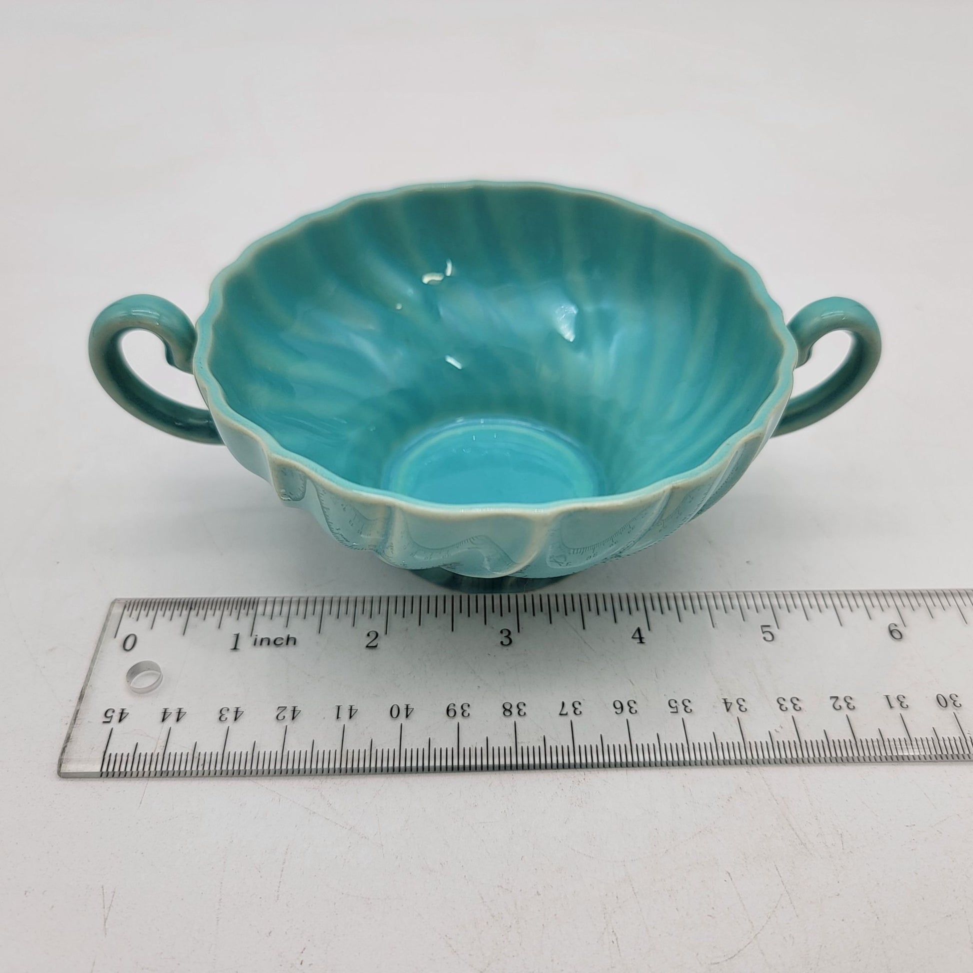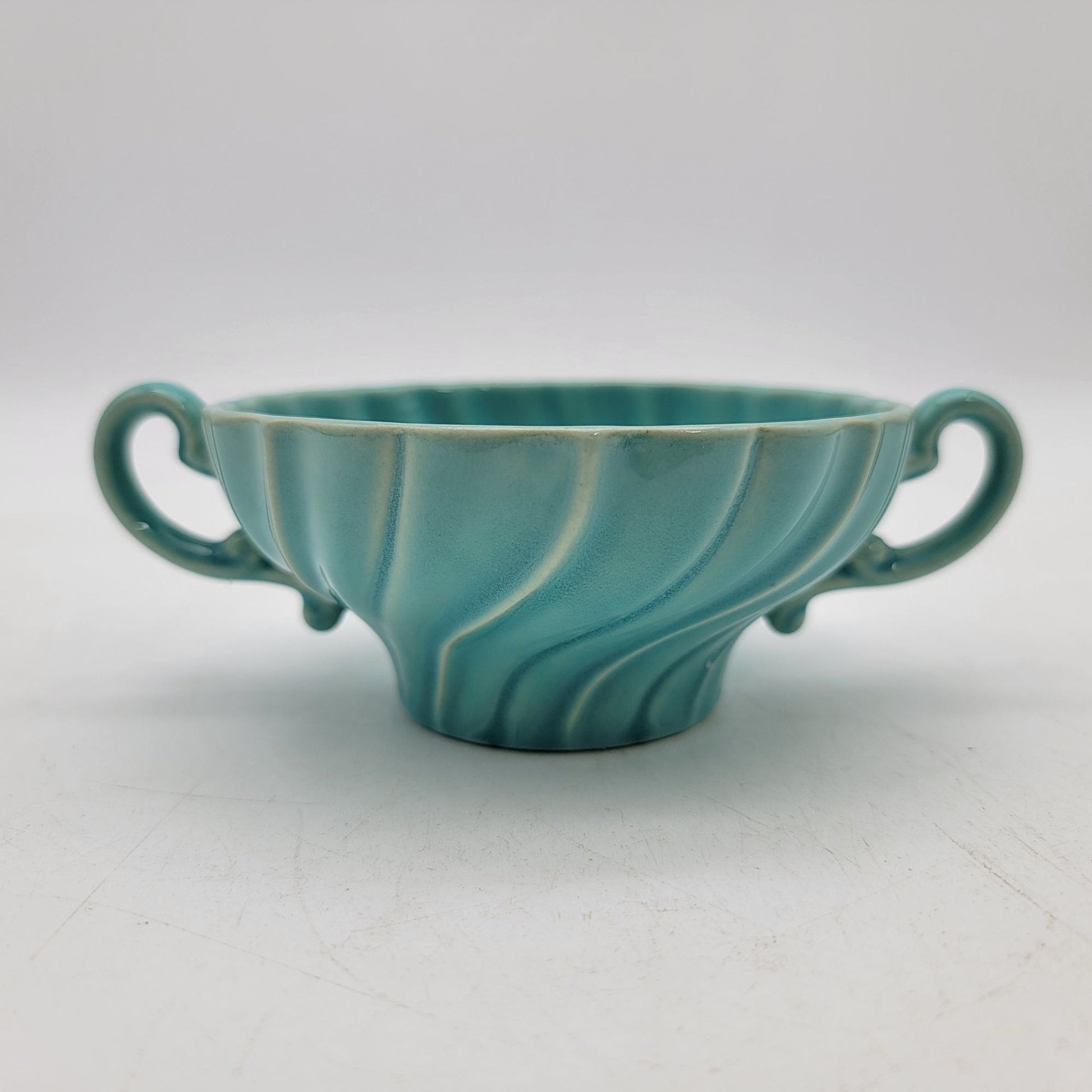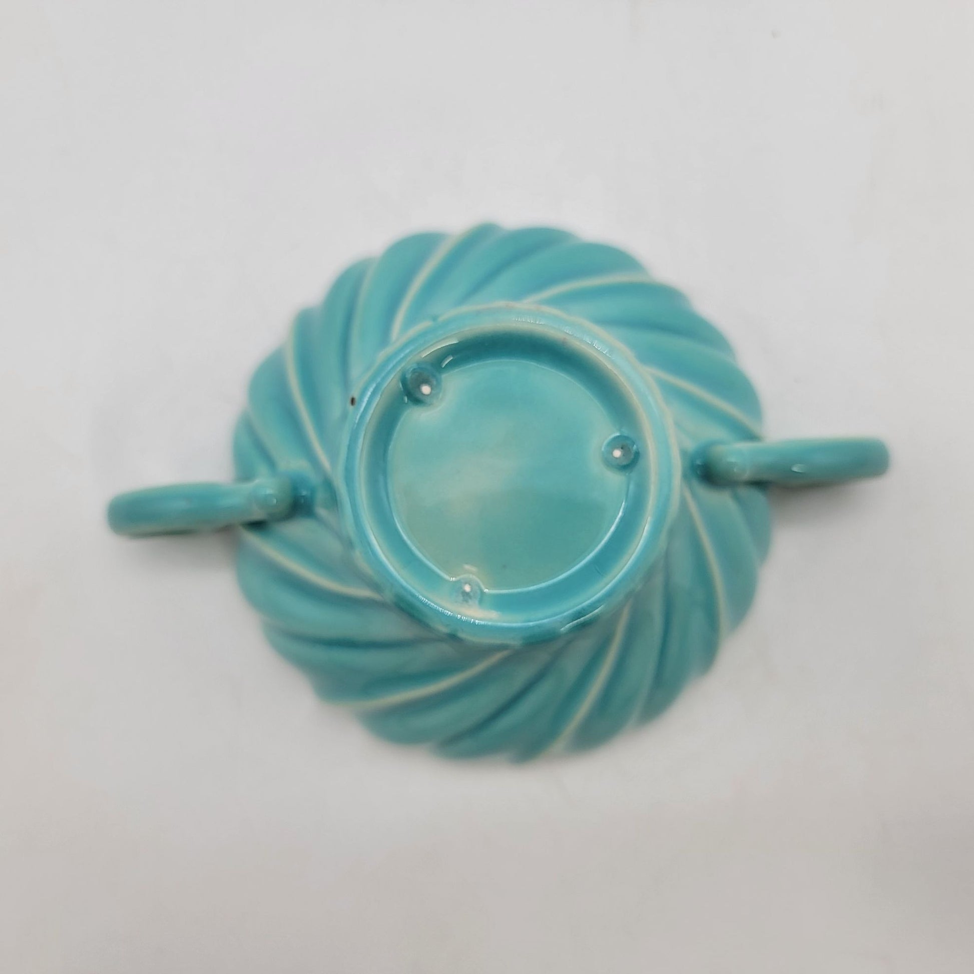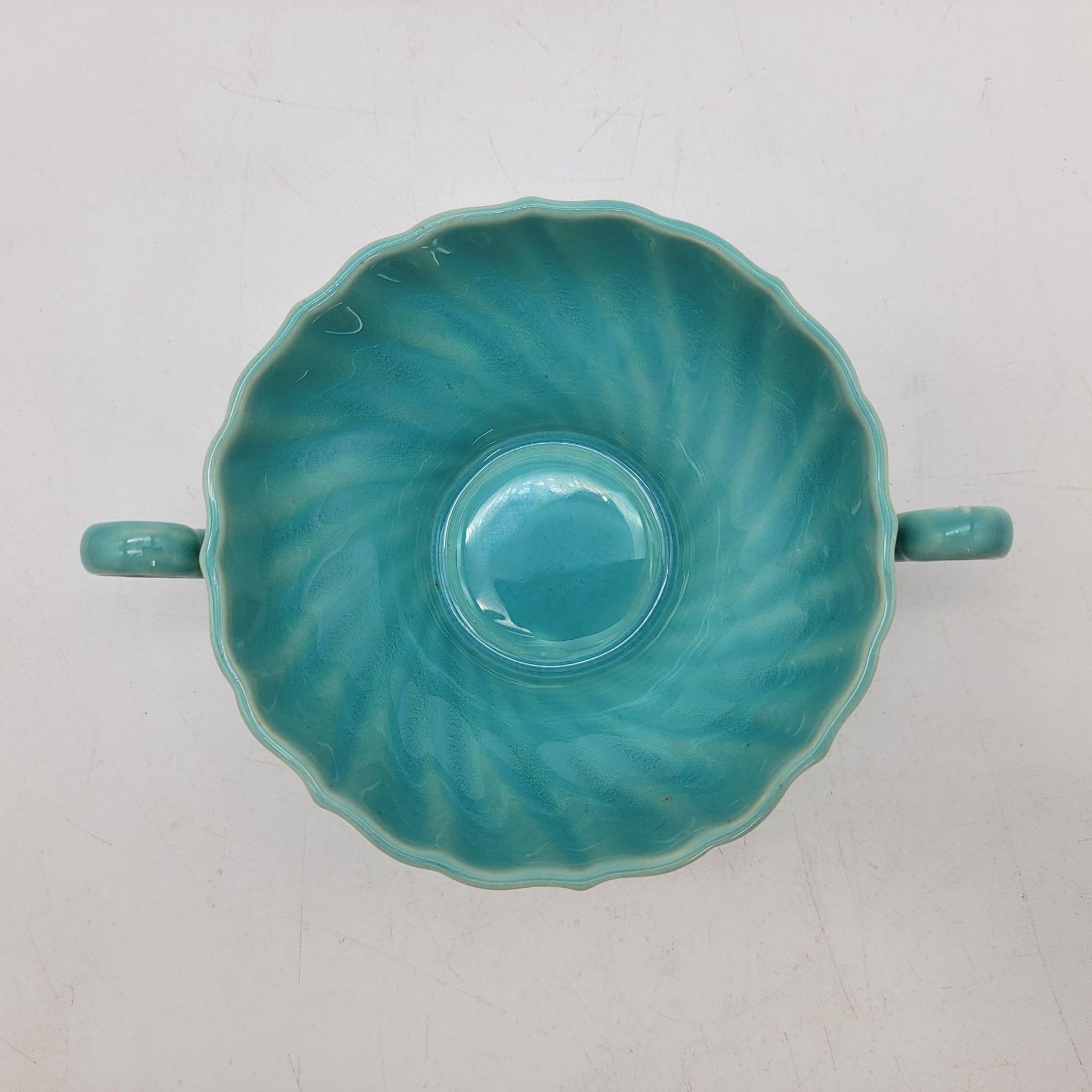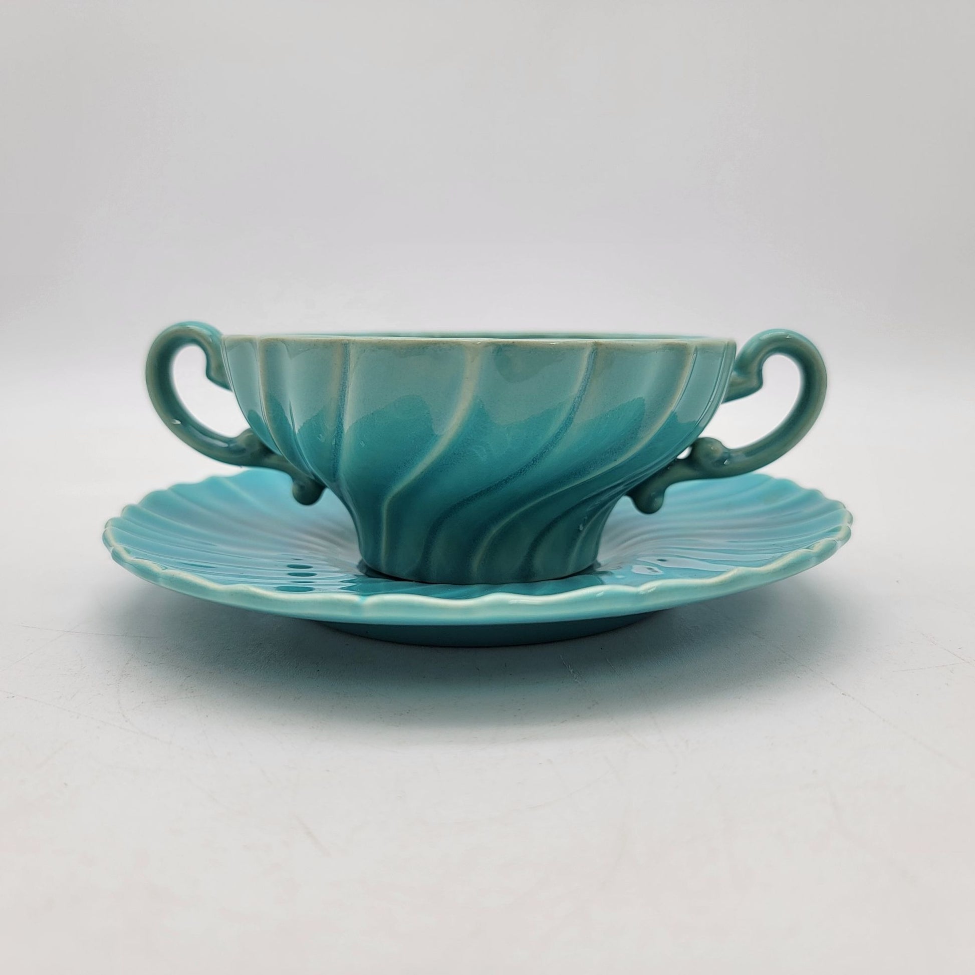 This vintage Franciscan Coronado set features a beautiful turquoise glaze with swirling patterns. The double-handled mugs and matching saucers display elegant craftsmanship, adding charm to your collection or table setting.