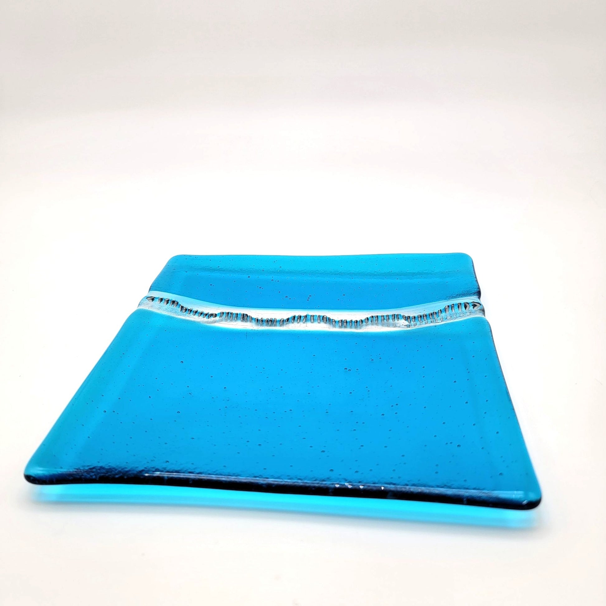 This handcrafted fused glass dish features a vibrant blue hue with a delicate white, black & clear accent stripe. A functional yet artistic piece for decor or use.