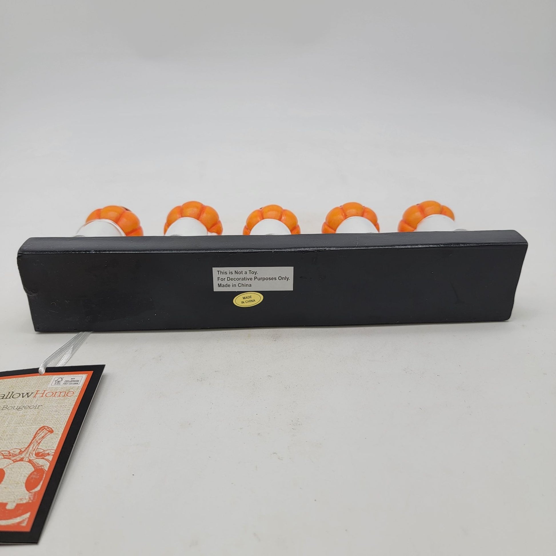 This candelabra from HallowHome features five charming ghost figures holding pumpkin-shaped candle holders. It's designed to add an element of festive Halloween spirit to your decor. Crafted for decorative purposes, it's suitable for a variety of settings and occasions during the fall season.