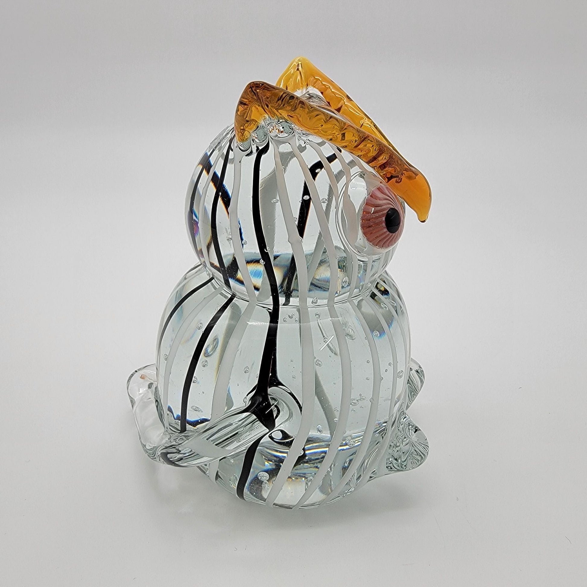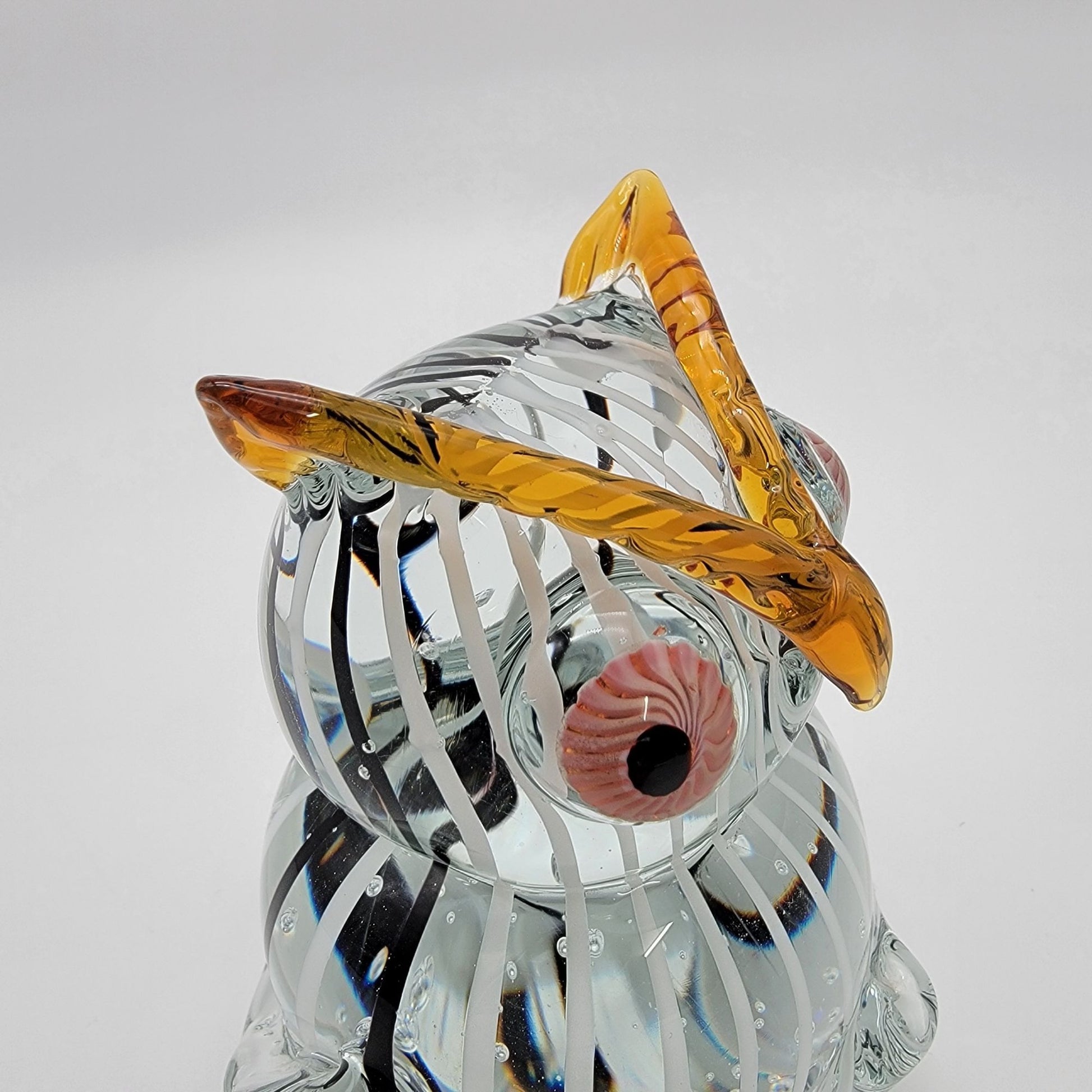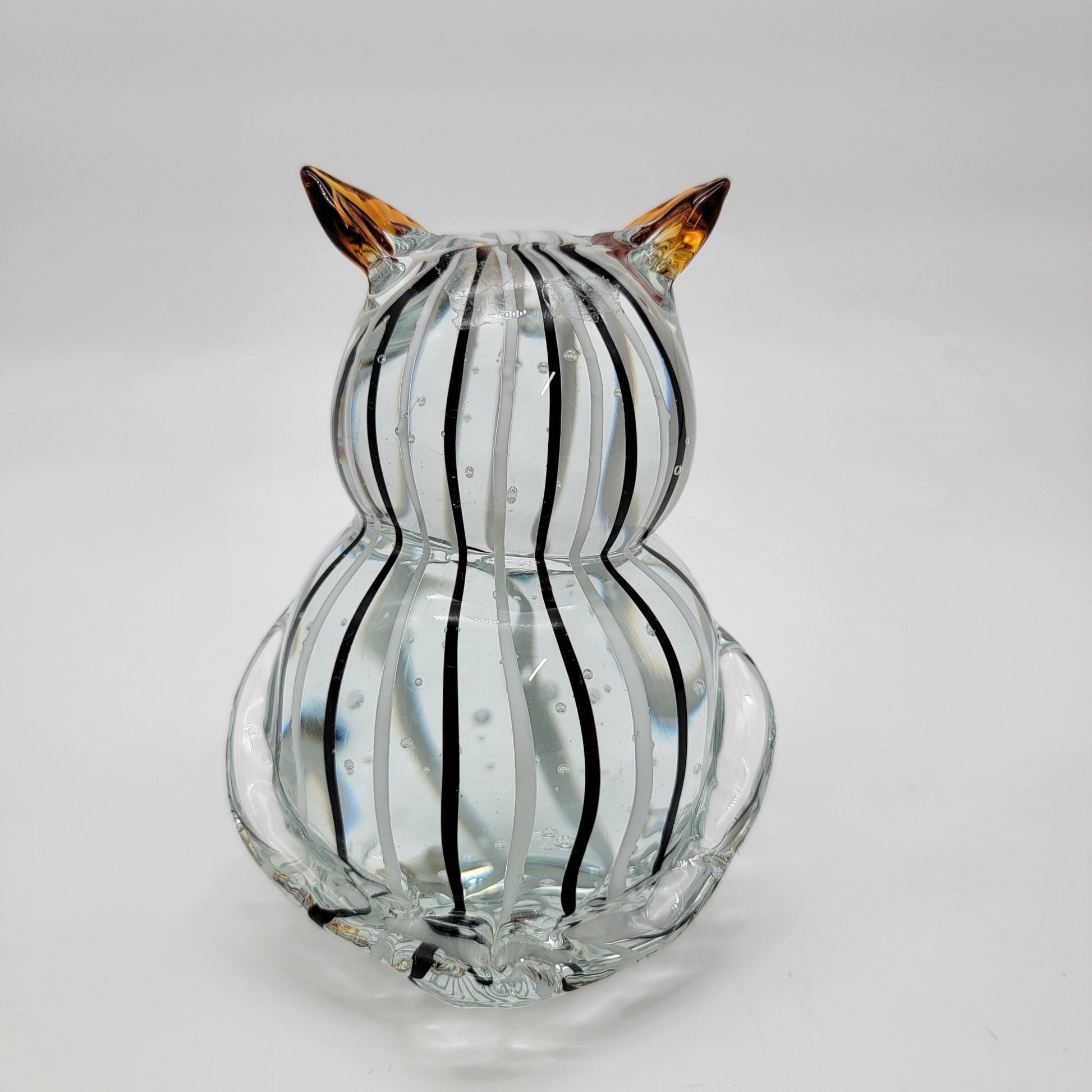 Delicately crafted glass sculpture captures the essence of an owl through masterful glassblowing techniques, featuring intricate black and white striped body with amber-toned highlights and distinctive glass eyes.