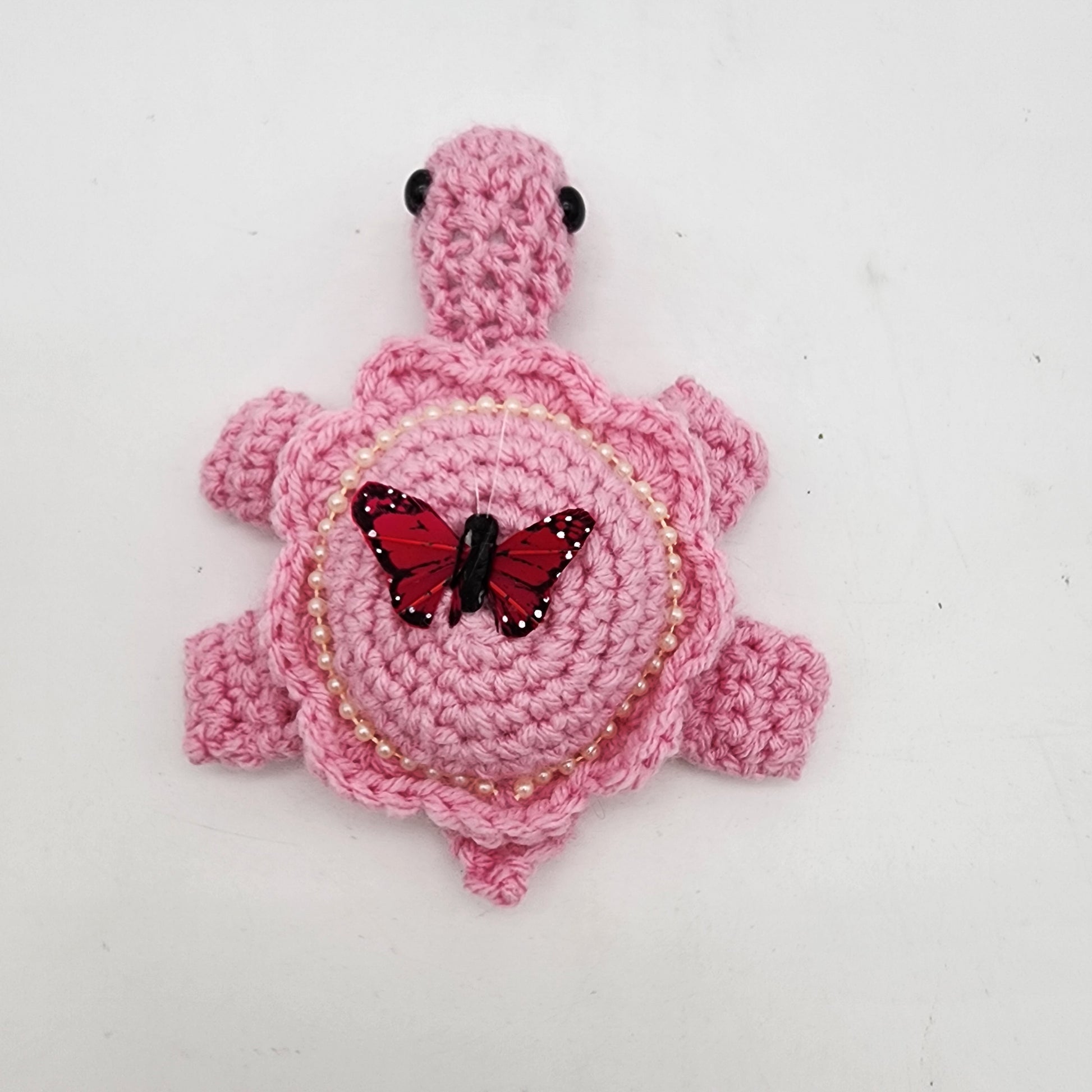 Hand Crocheted Turtle Pink on Pink with Butterfly and Pearls