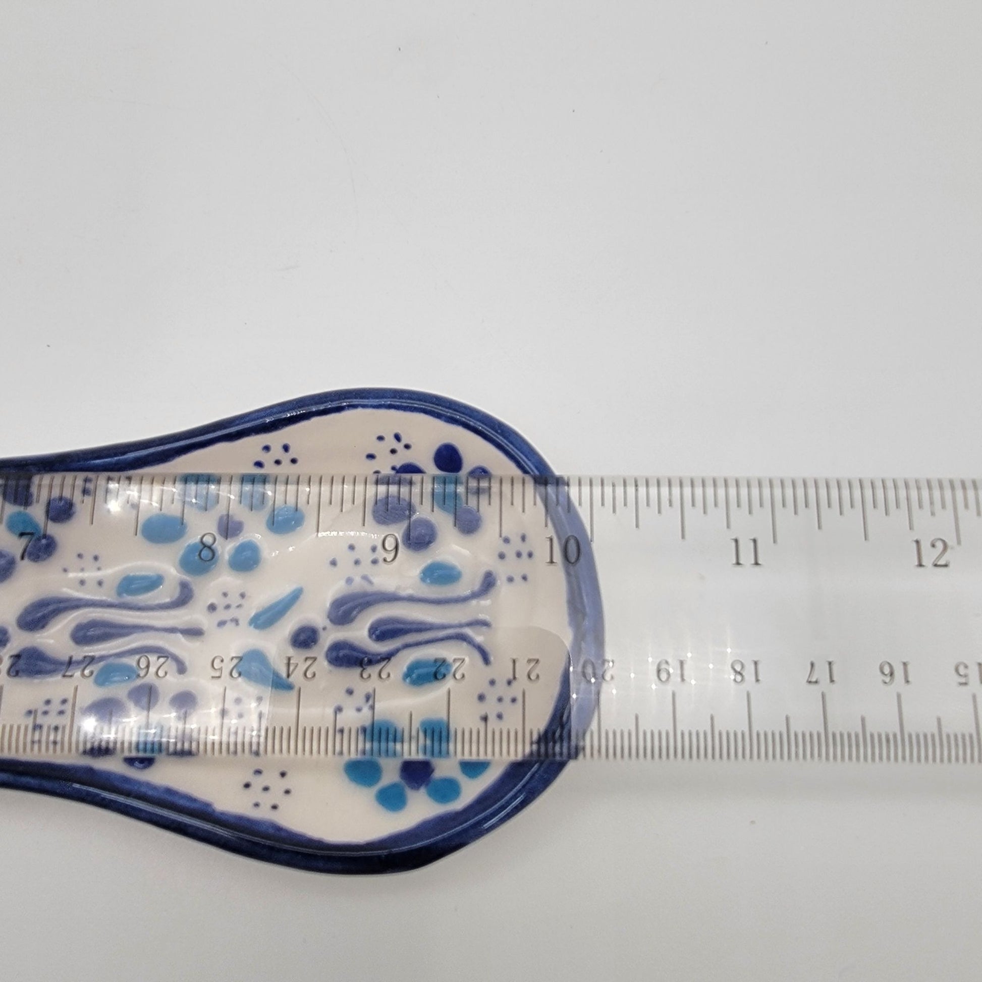This hand-decorated ceramic spoon rest showcases traditional Turkish artistry with intricate blue and white floral patterns. Functional and elegant for kitchen use.